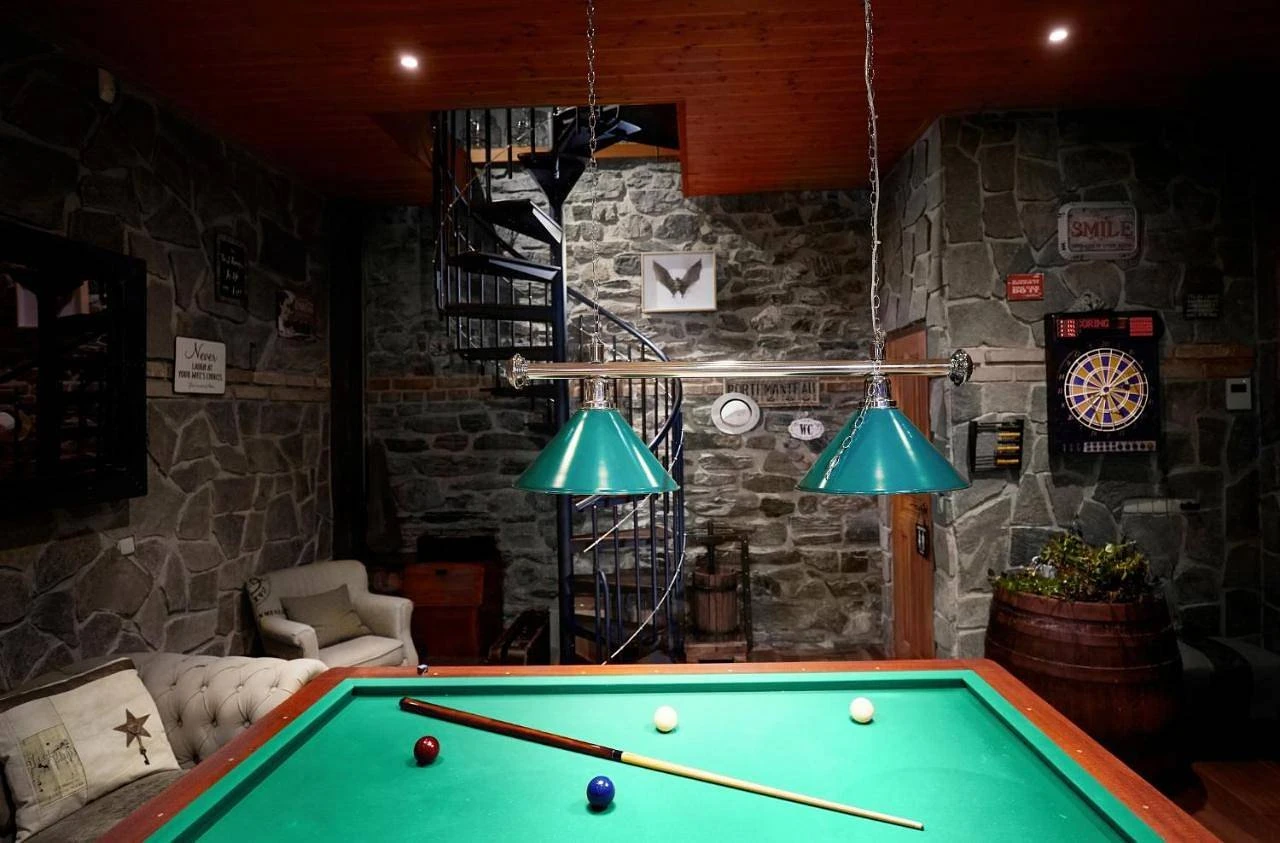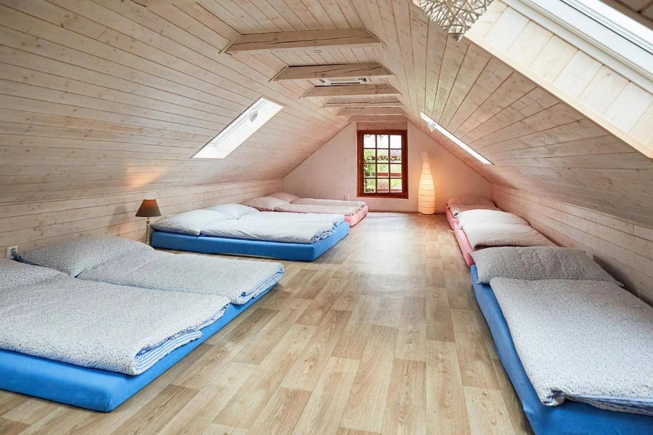 Ubytování je situováno ve dvoupodlažním objektu, v jehož přízemí se nachází společenská místnost vybavená barem a plně zařízenou kuchyní (sporák, lednice, vinotéka, mikrovlnná trouba, rychlovarná konvice, pípa, ledovač, kávovar, kontaktní gril). Součástí prostoru jsou také krbová kamna, kulečník, šipky a toaleta. Do patra vedou točité schody, kde je umístěna velká společná ložnice s devíti futonovými lůžky a přímým východem ven. Na ložnici navazuje koupelna s vanou a WC a dále samostatný pokoj s manželskou postelí, rozkládacím gaučem a vlastními kamny. V celém objektu je dostupná klimatizace a Wi-Fi.