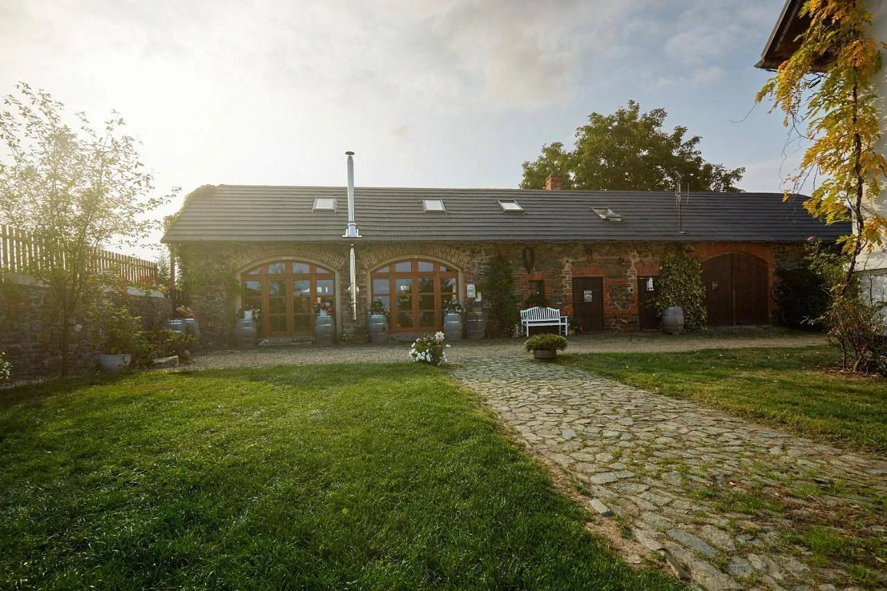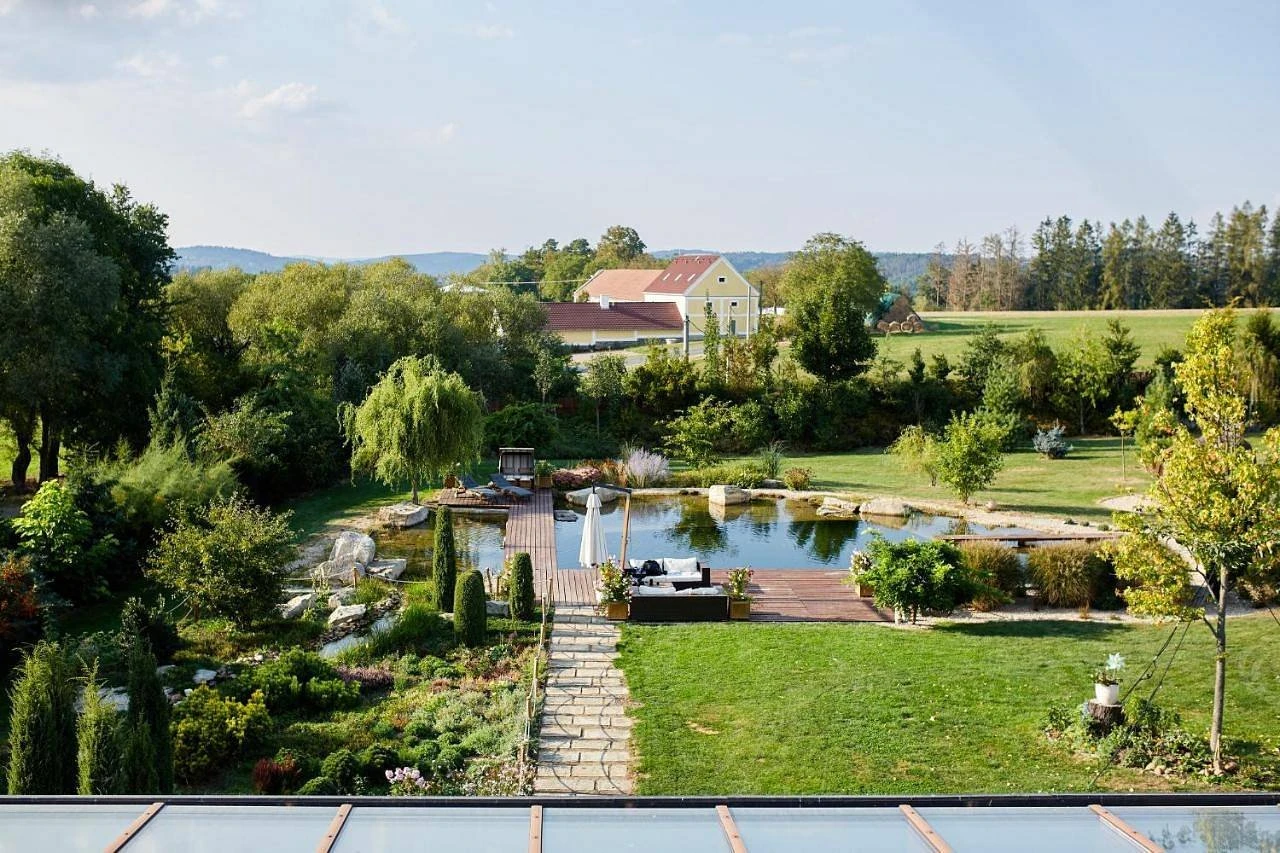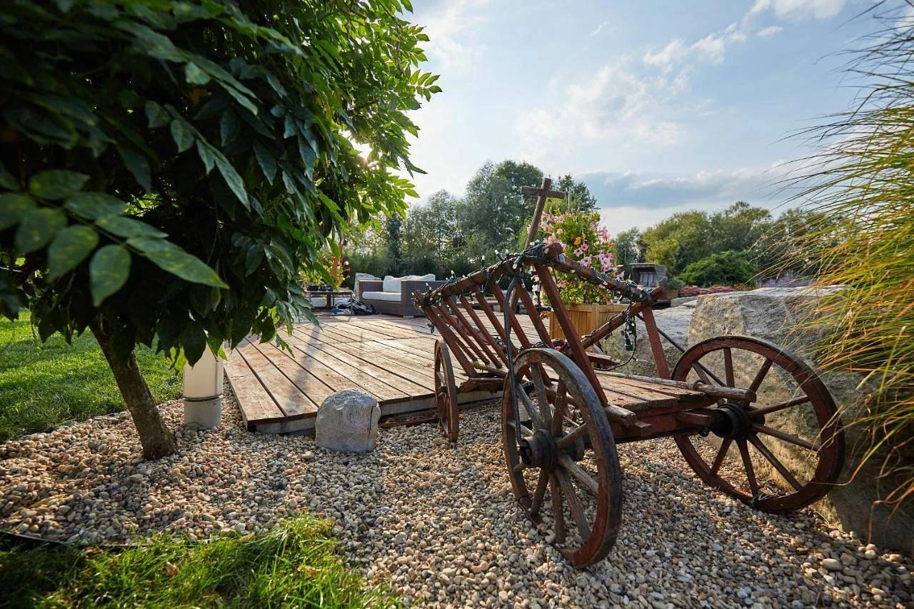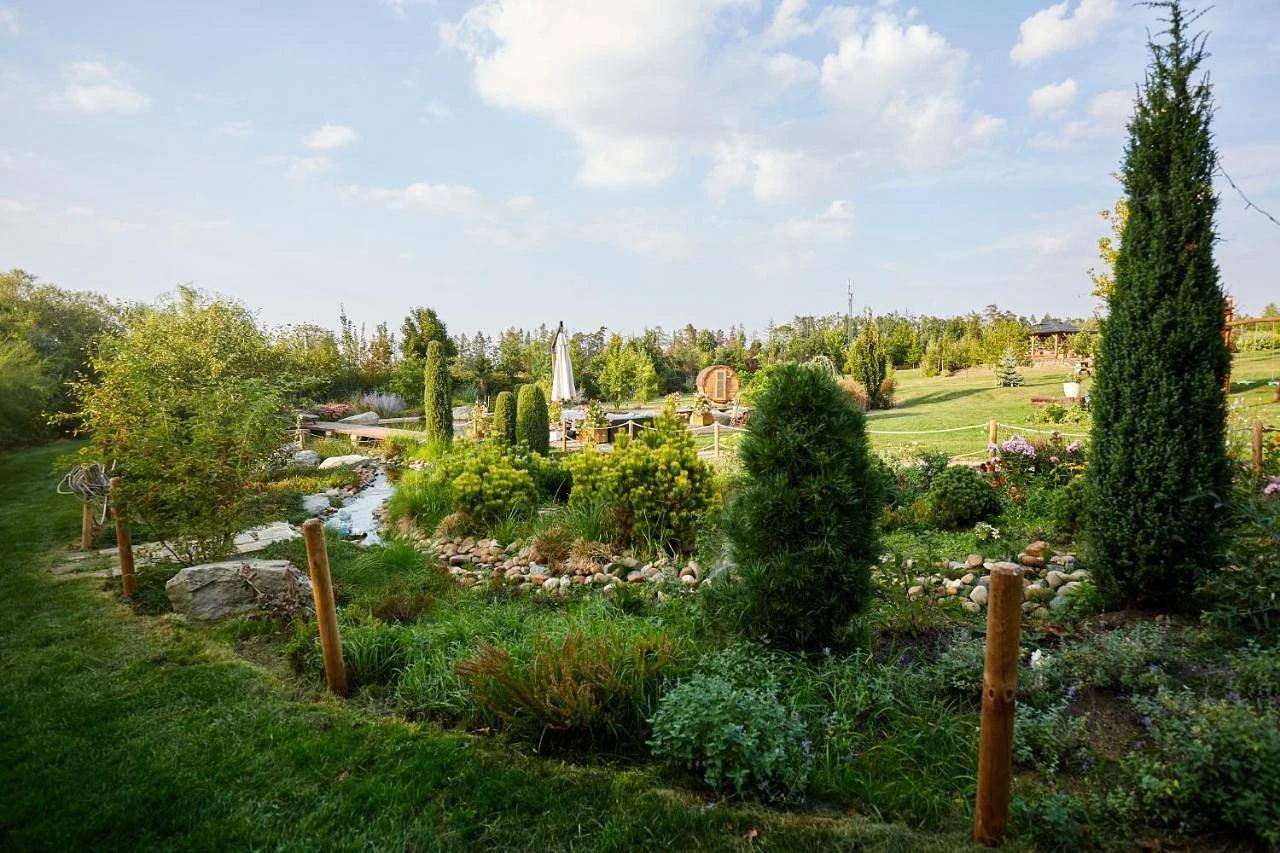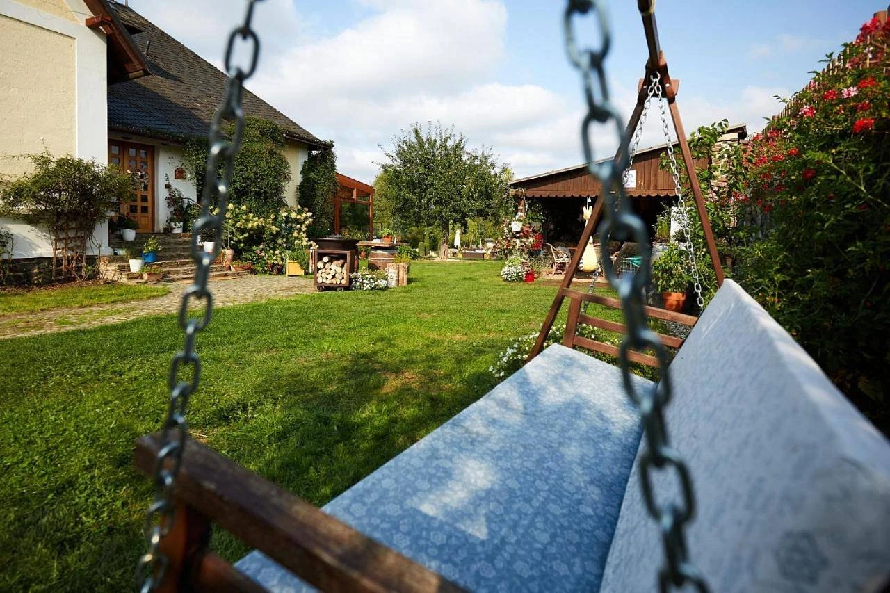 Součástí ubytování je venkovní kuchyně pod střechou, vybavená linkou, lednicí, sporákem, mikrovlnnou troubou, mrazákem a krbem. K dispozici je velký gril typu ofyr a zastřešený altán s posezením. Na pozemku se nachází přírodní koupací biotop s lehátky a místy k odpočinku. Pro děti je připraven dřevěný domek, akátová hrací sestava, pískoviště a trampolína. Areál je oplocený, vhodný pro pobyt s dětmi i domácími mazlíčky a nabízí plné soukromí, protože v době pronájmu majitel není na pozemku přítomen. Za příplatek je možné využít venkovní vířivku pro 4 osoby a samostatně stojící saunu umístěnou u biotopu.