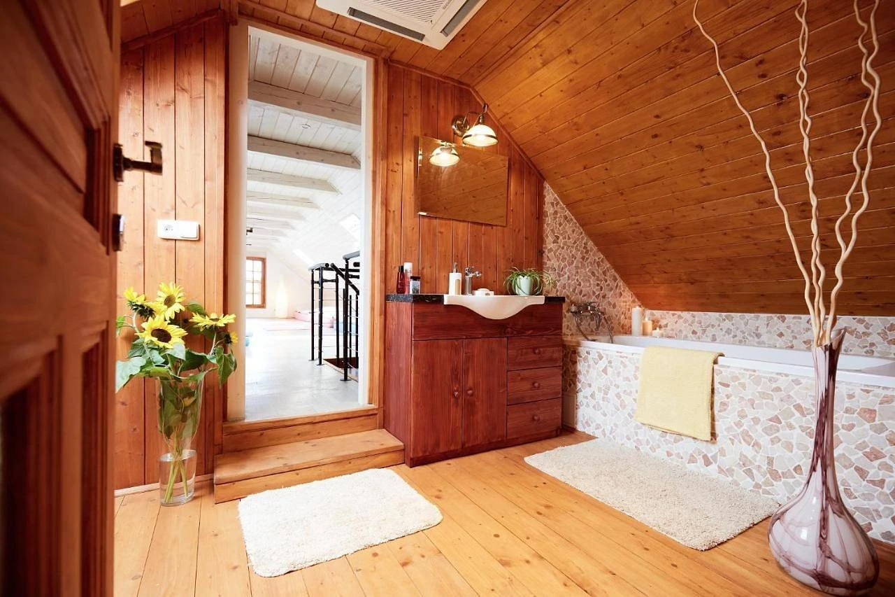Sanitární vybavení tvoří dvě toalety s umyvadlem a jedna koupelna s vanou. Vytápění zajišťují krbová kamna a klimatizace.