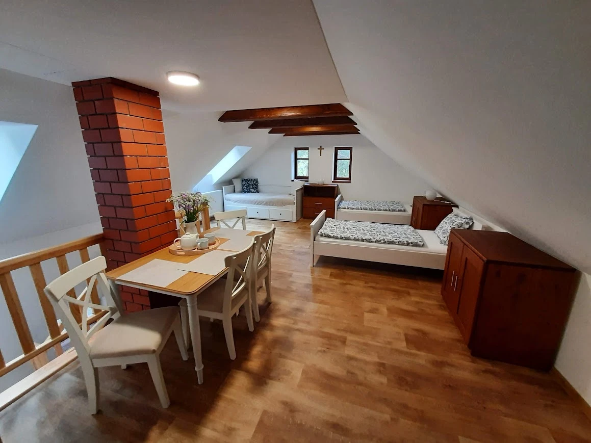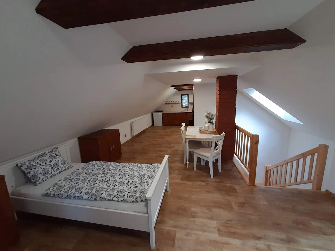 V podkroví je druhý obývací prostor s kuchyňskou linkou, vybavený rychlovarnou konvicí, dvouplotýnkovým elektrickým vařičem a vestavěnou lednicí bez mrazáku. K dispozici je stůl se 4 židlemi, 2 jednolůžkové postele a rozkládací gauč. Součástí podkroví je také samostatná koupelna se sprchovým koutem a WC.
