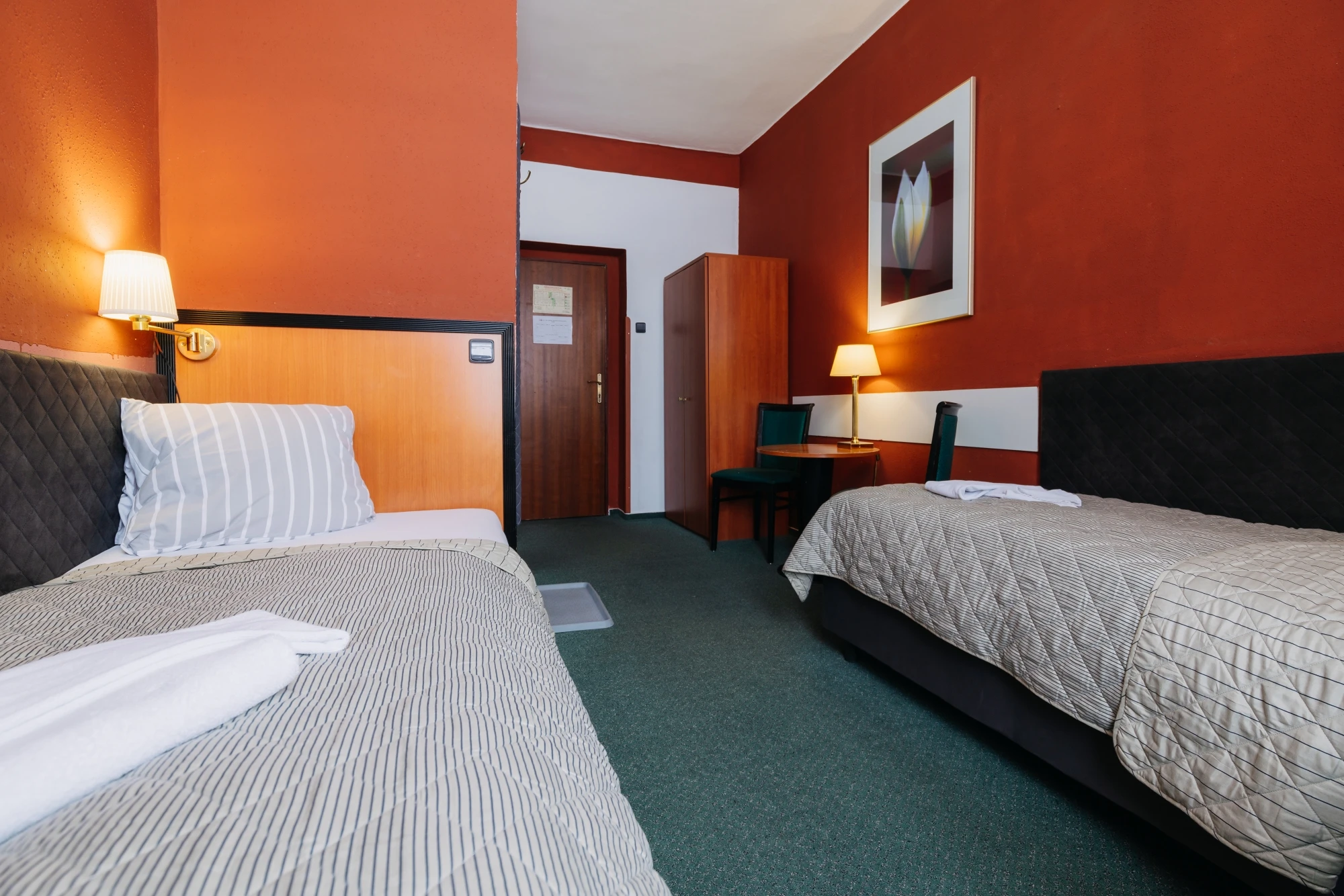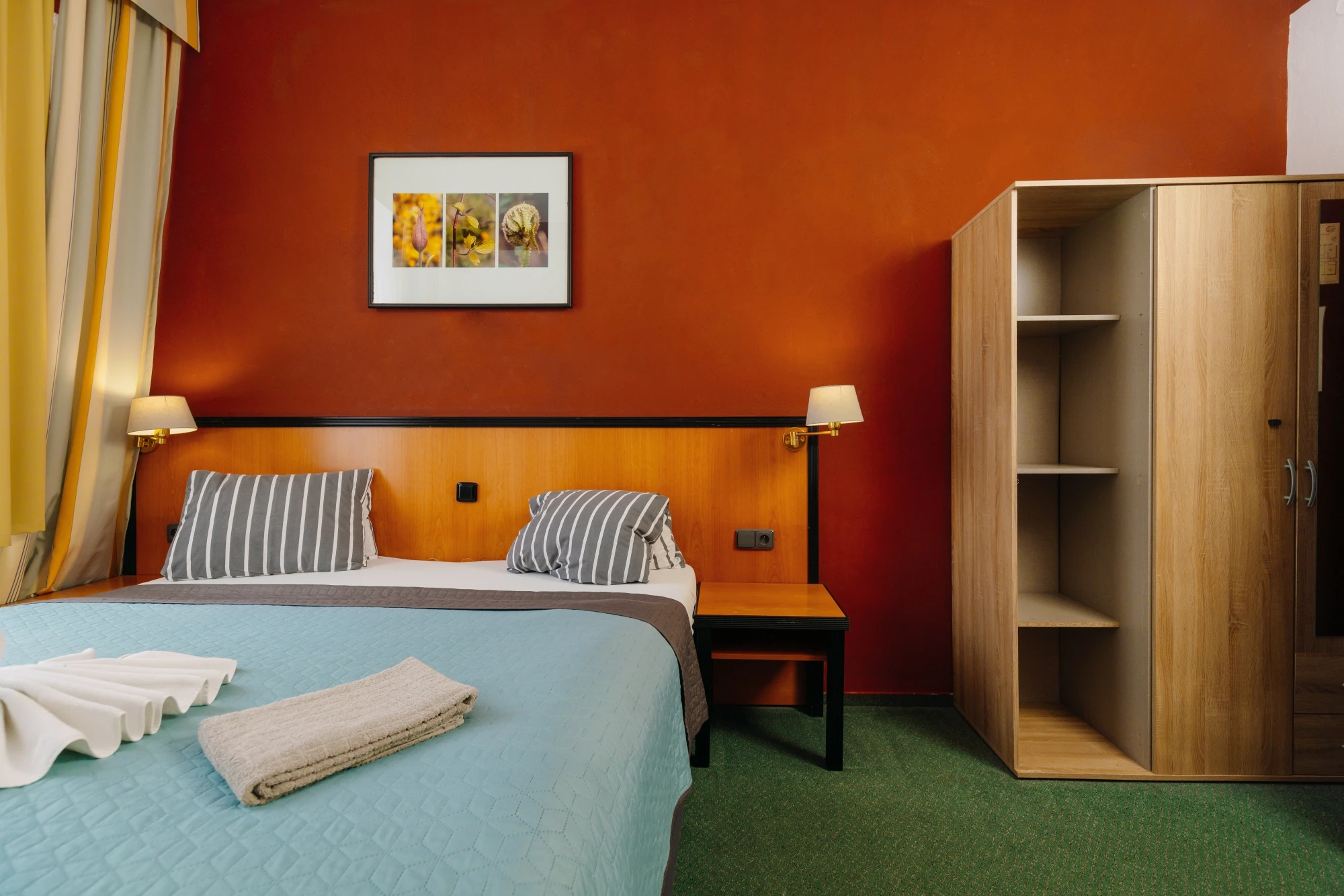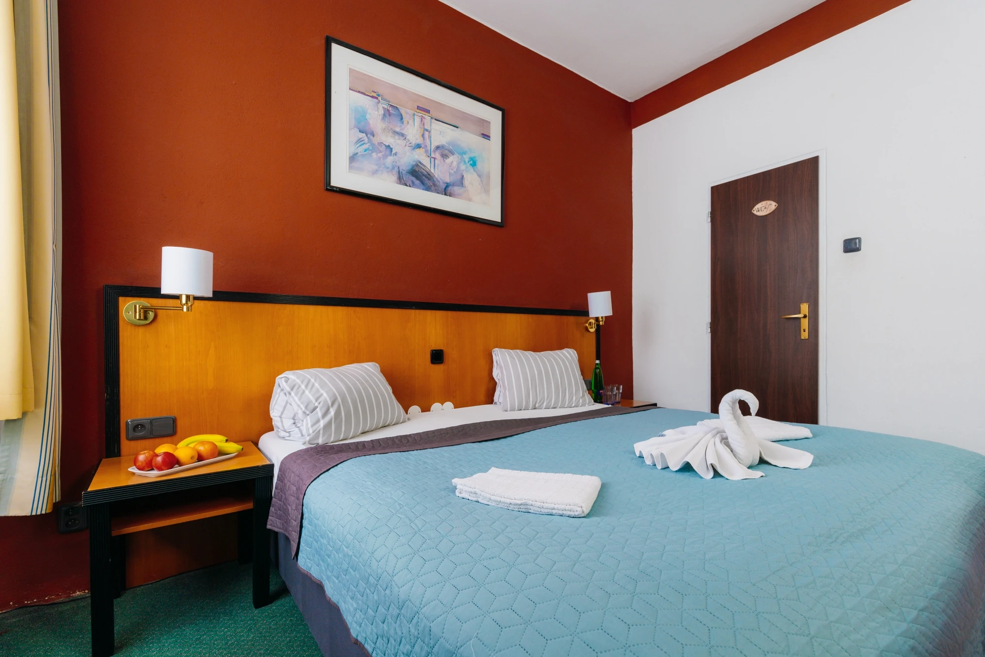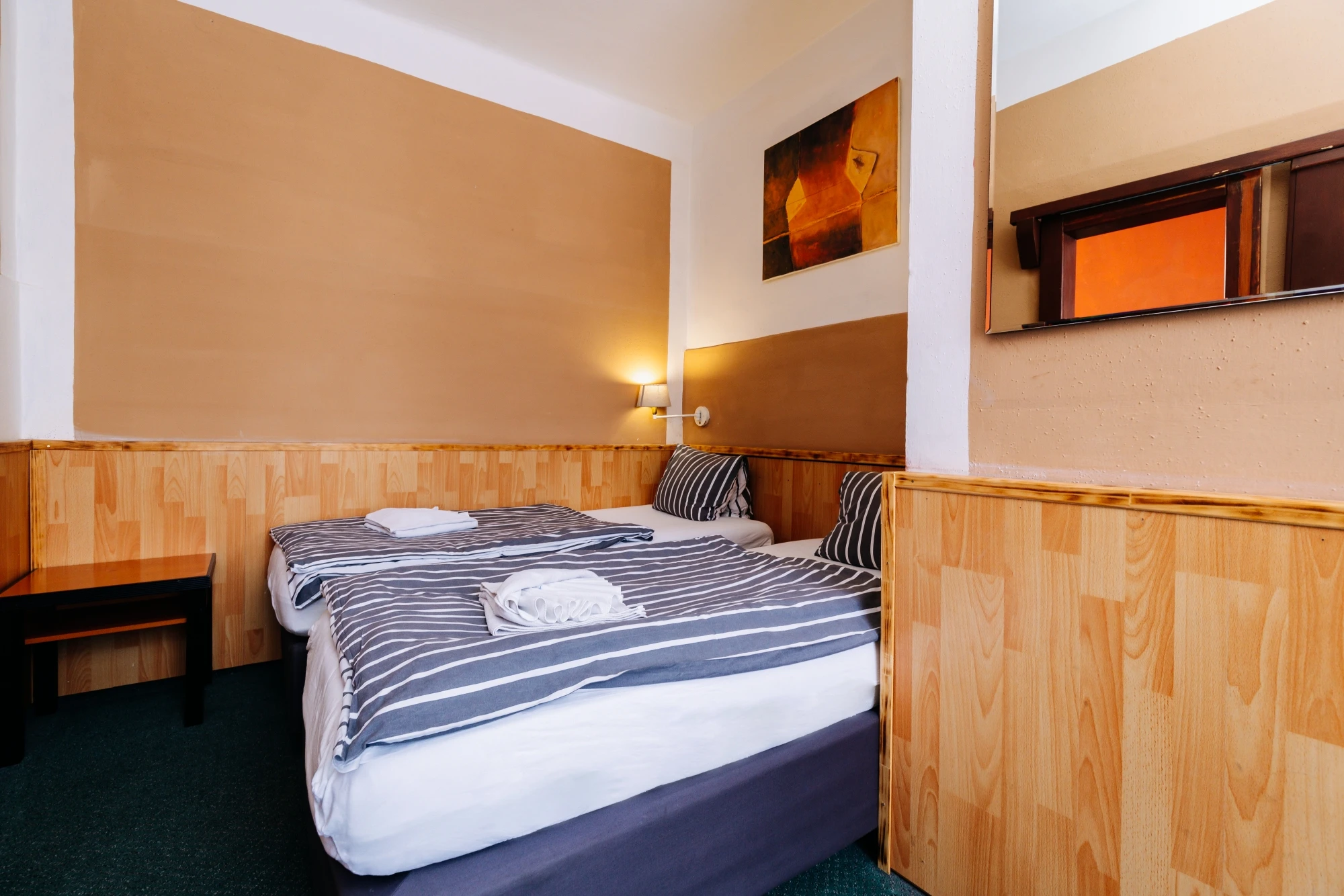 - Dvoulůžkový pokoj: Může být vybaven manželskou postelí nebo dvěma samostatnými lůžky, dle přání hosta. Cena od 1200 Kč za noc.