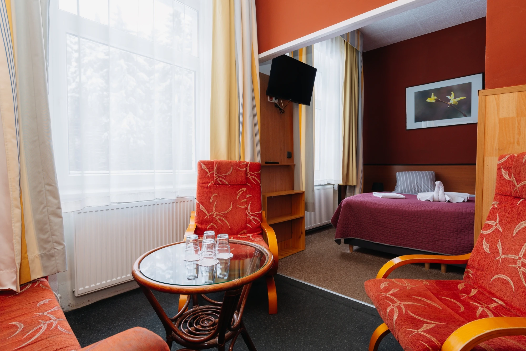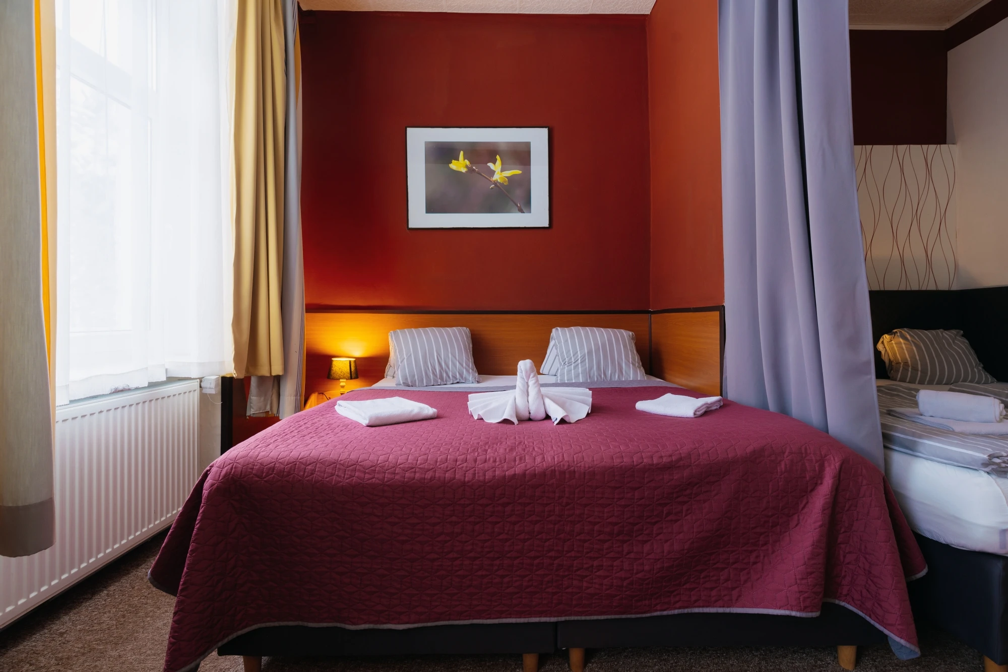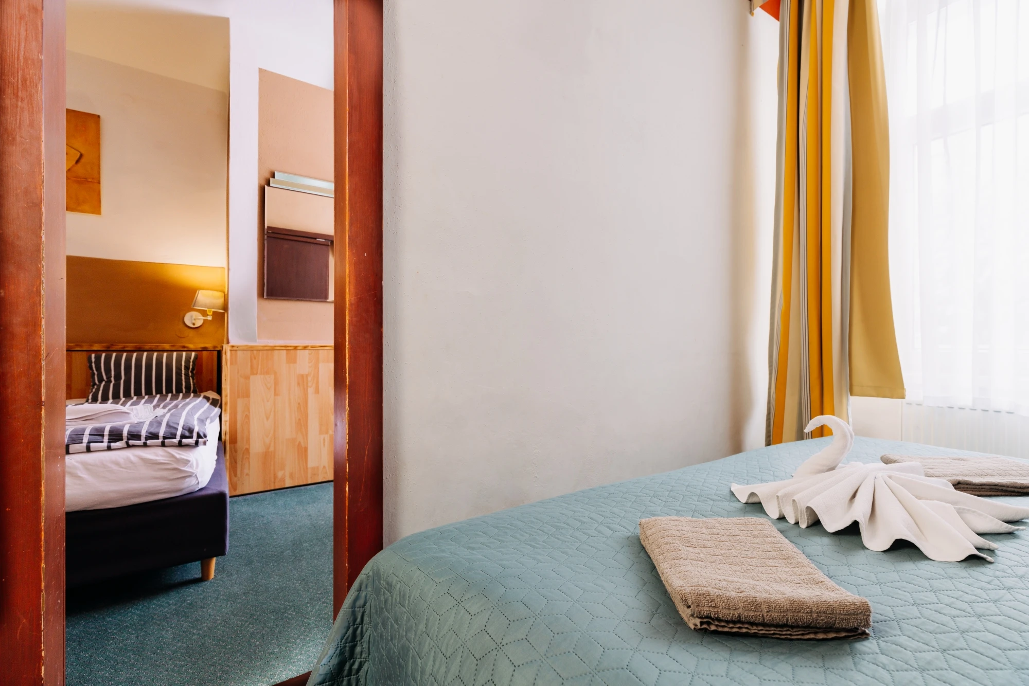 - Čtyřlůžkový pokoj: Apartmánový pokoj s manželskou postelí a dvěma samostatnými lůžky, vhodný pro rodiny. Cena od 1800 Kč za noc.