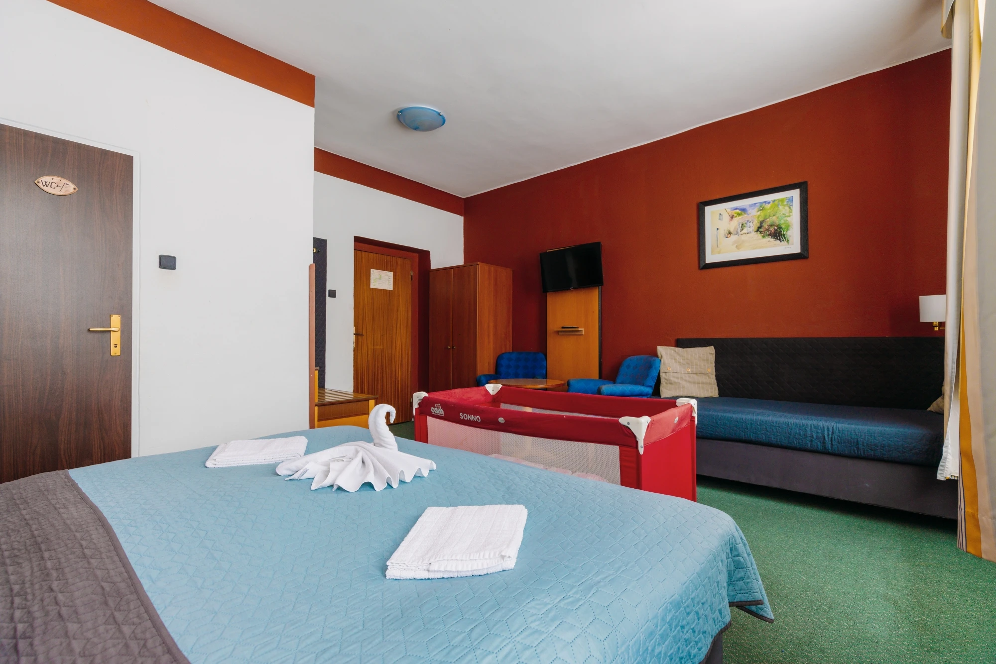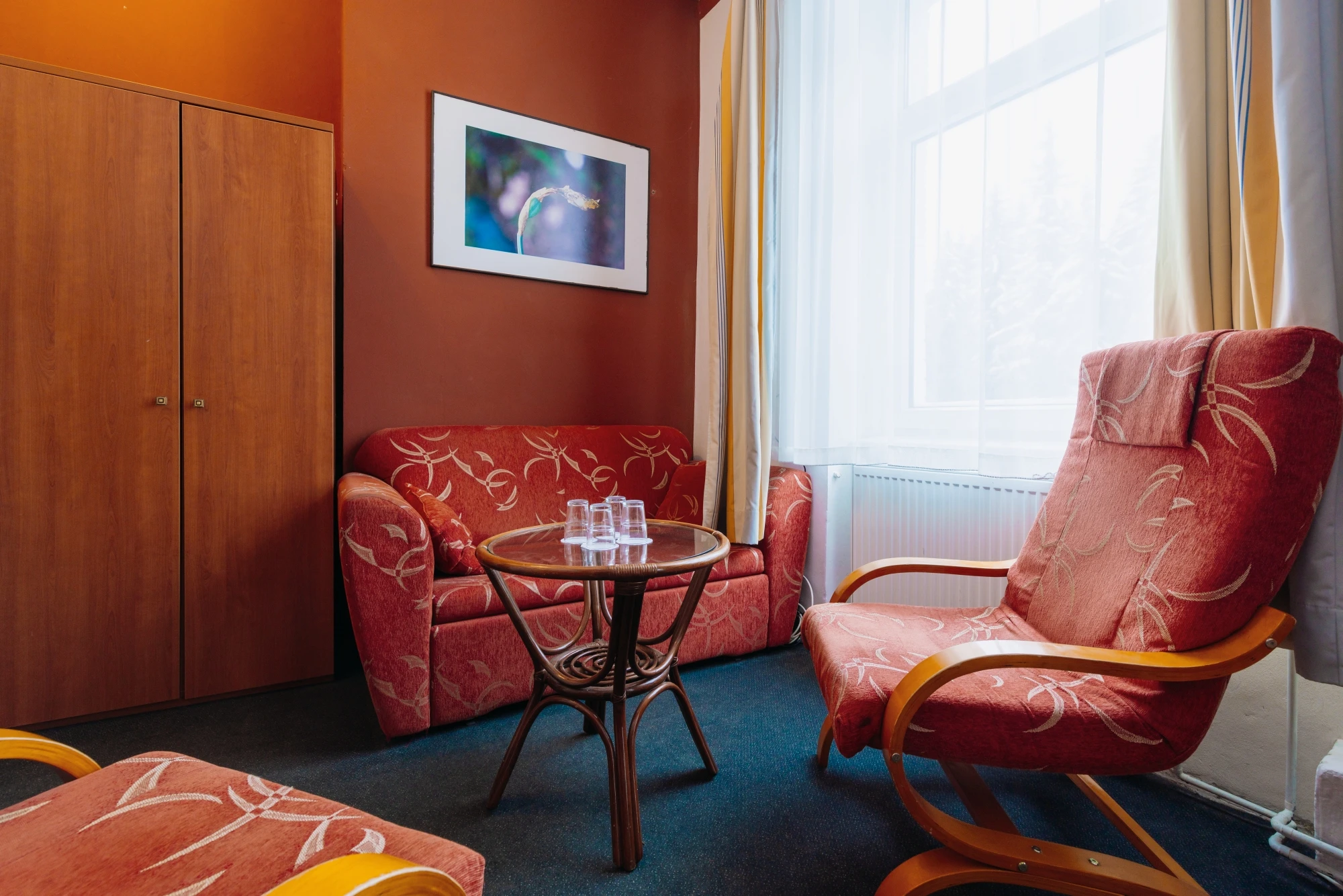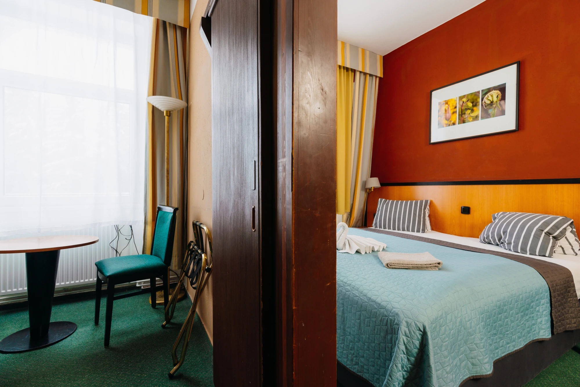 - Čtyřlůžkový pokoj: Apartmánový pokoj s manželskou postelí a dvěma samostatnými lůžky, vhodný pro rodiny. Cena od 1800 Kč za noc.