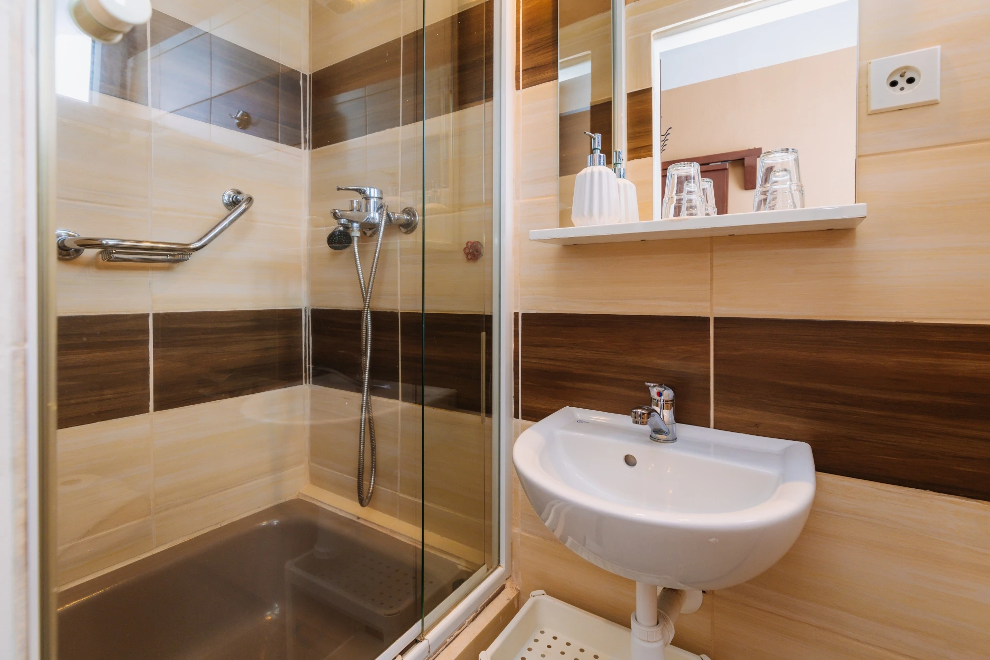 - Pokoje: Každý pokoj je vybaven vlastní koupelnou se sprchovým koutem.