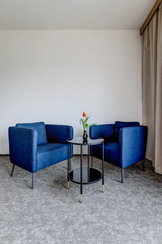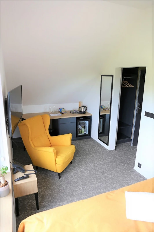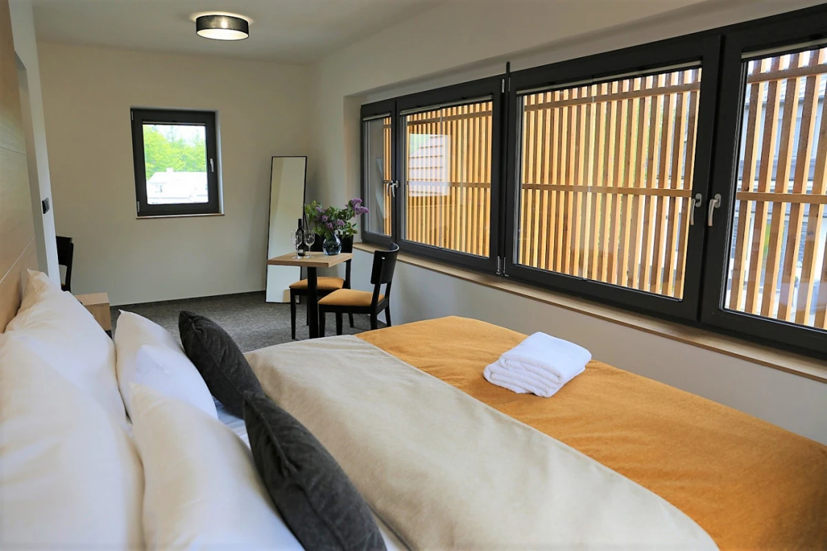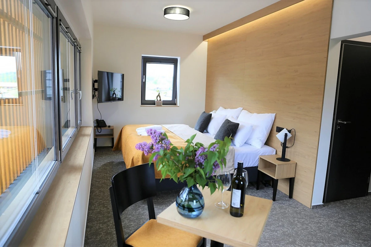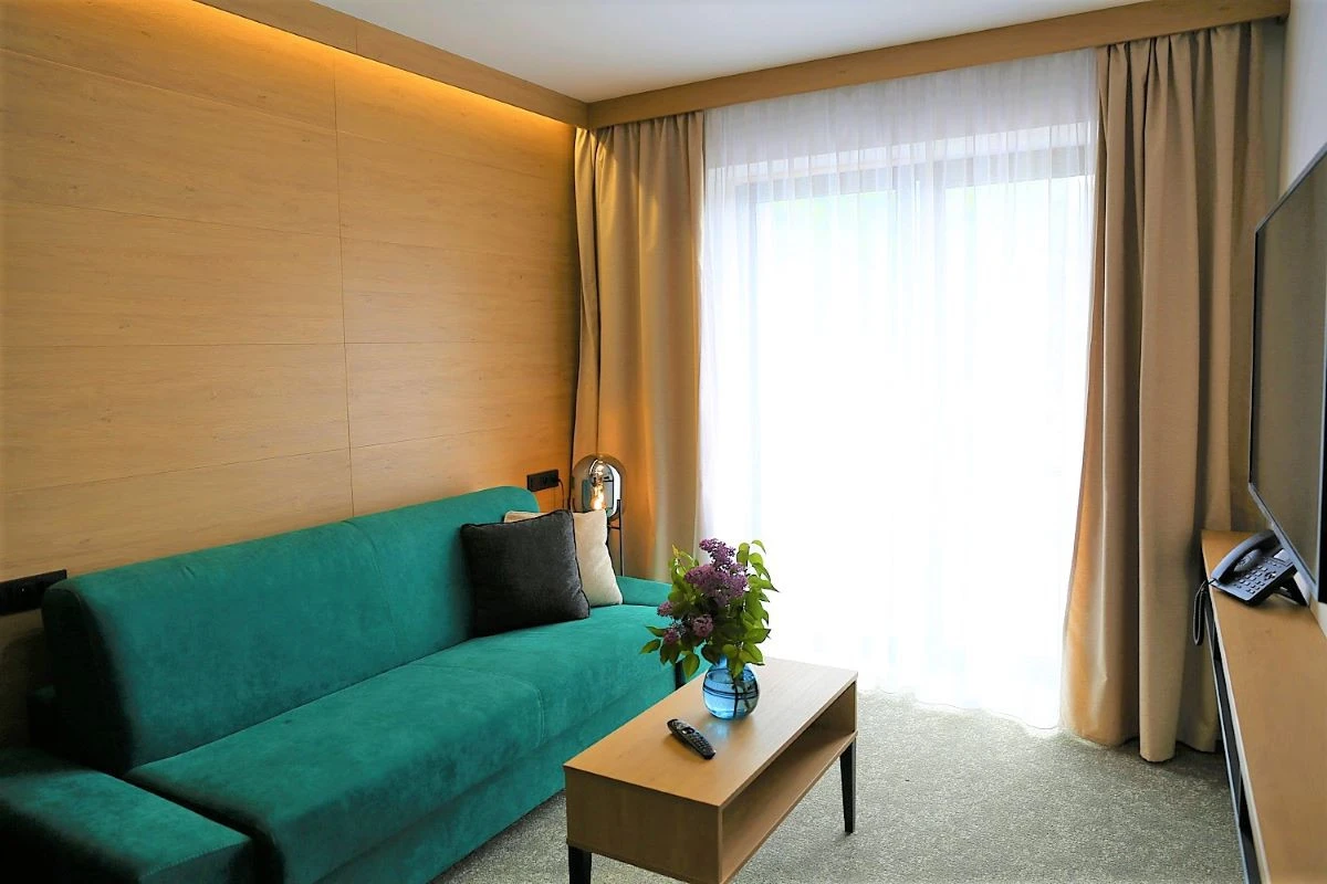 Apartmá má ložnici s manželskou postelí (180x200 cm) a obývací pokoj s pohovkou, kterou lze rozložit na plnohodnotnou postel (160x200 cm). Pokoje jsou vybaveny chytrou televizí, trezorem, minibarem a setem na přípravu kávy a čaje. Koupelna má sprchový kout, fén a toaletní potřeby. Apartmá je bezbariérové a umožňuje vstup na zahradu a do hotelové relaxační zóny.