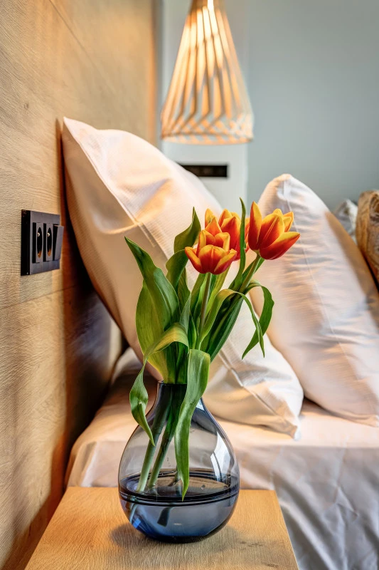 Pokoj má manželskou postel (180x200 cm), chytrou televizí, trezor, minibar a set na přípravu kávy a čaje. Koupelna je vybavena sprchou, fénem a toaletními potřebami. Pokoj má balkonové dveře s výhledem do zahrady a na okolní hory.