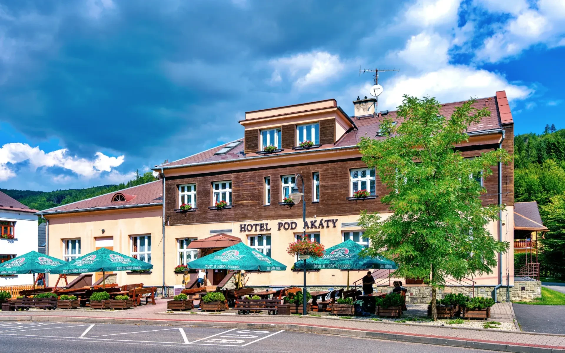 Hotel Pod Akáty v Dolní Lomné nabízí komfortní ubytování v horské oblasti s dostupností všech základních služeb. Hosté mají k dispozici pokoje s vlastním sociálním zařízením, televizi a připojení k internetu WiFi. Pro stravování je připravena hotelová restaurace s tradičními pokrmy.