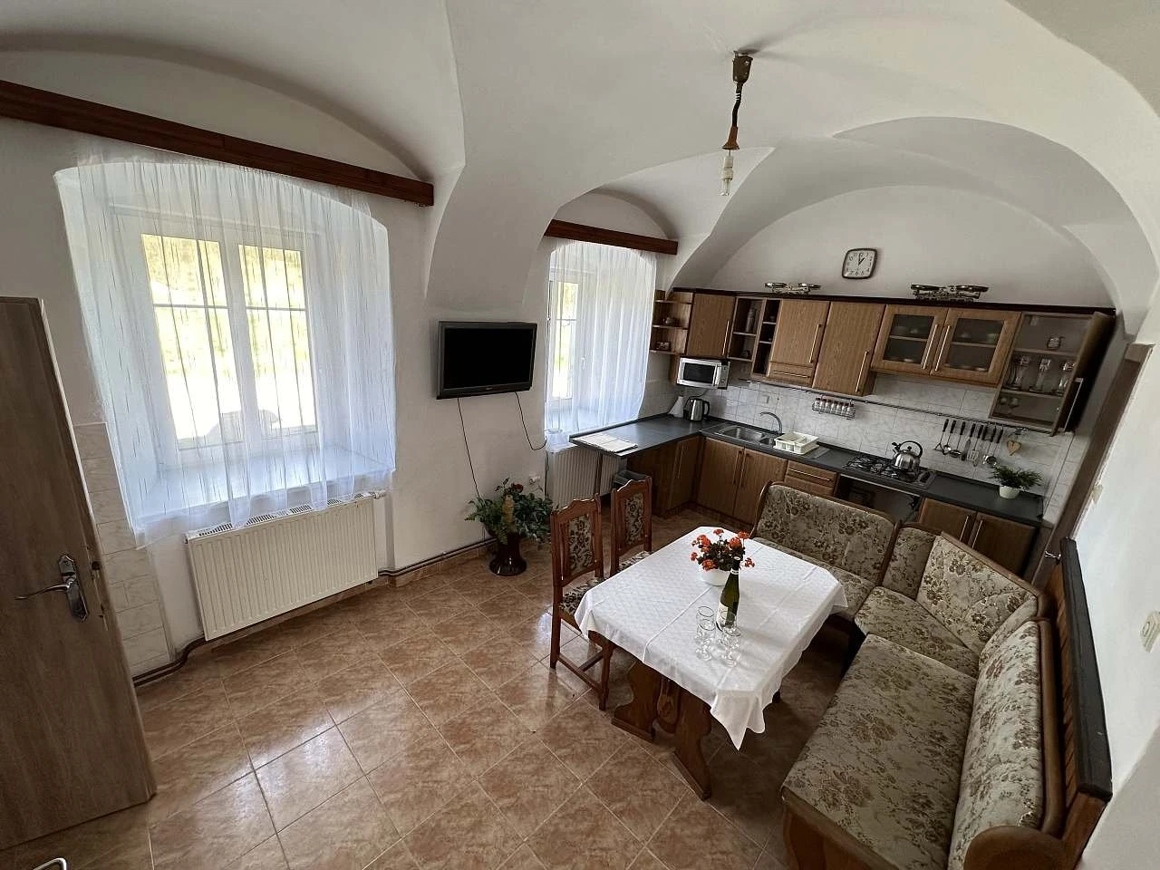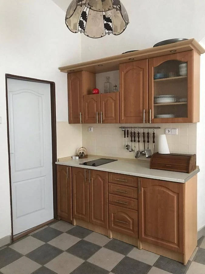 - Plně vybavená kuchyň: sporák, nádobí, základní suroviny (sůl, pepř, cukr, olej, čaj, káva)