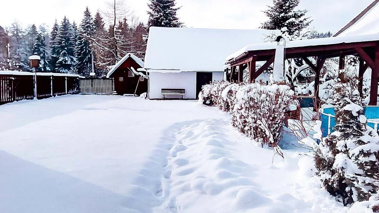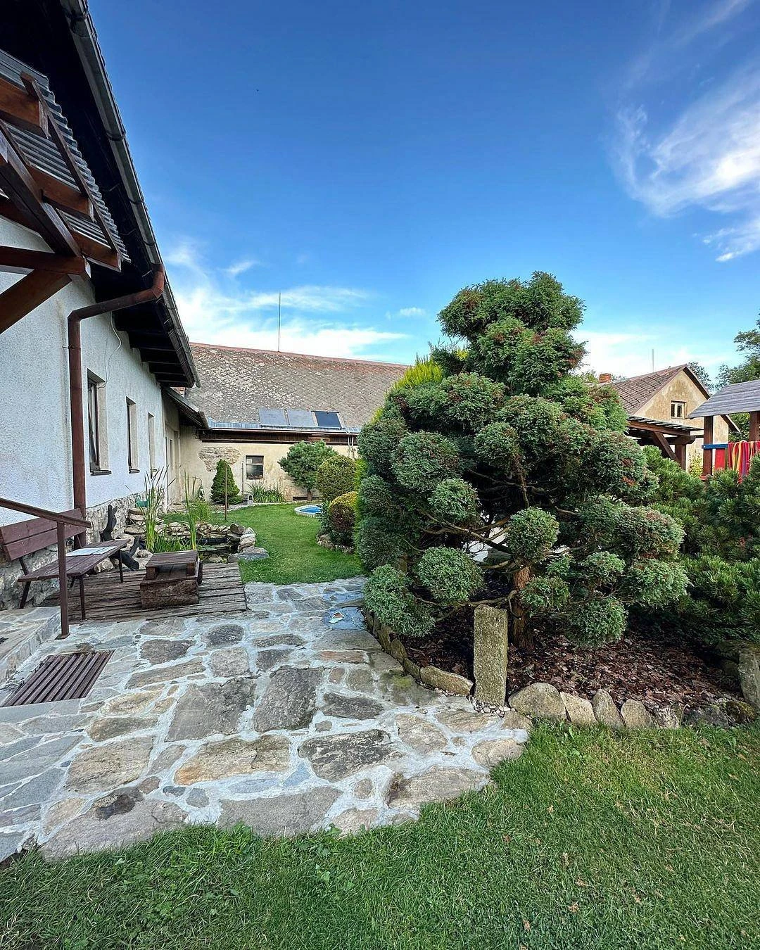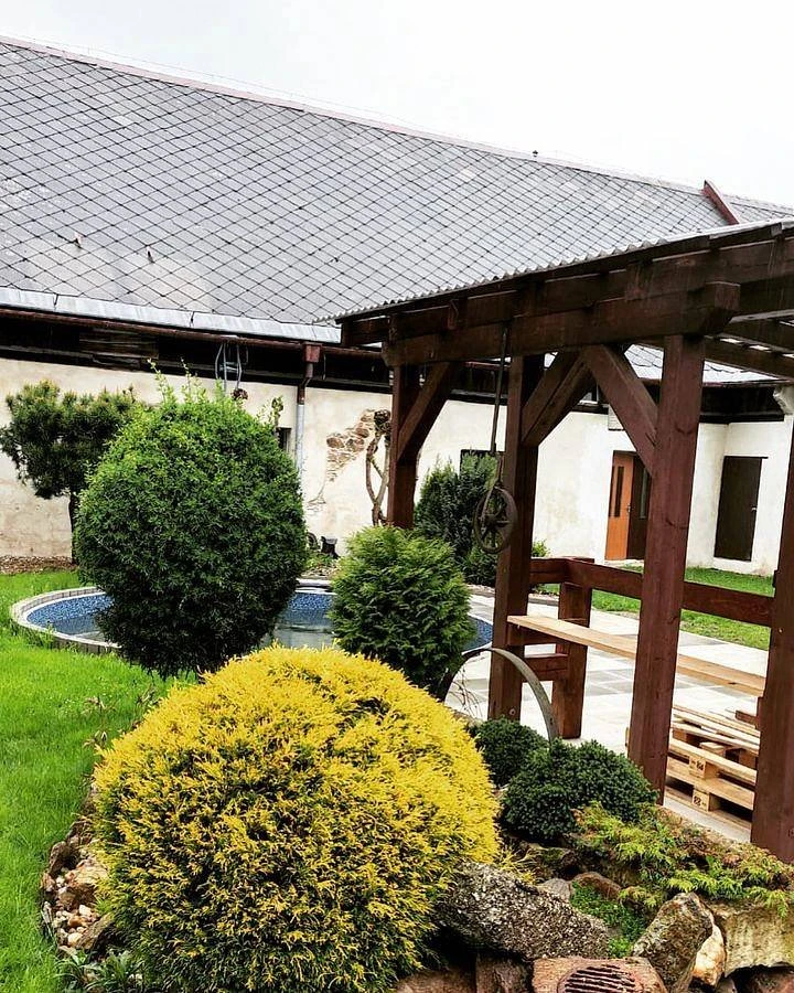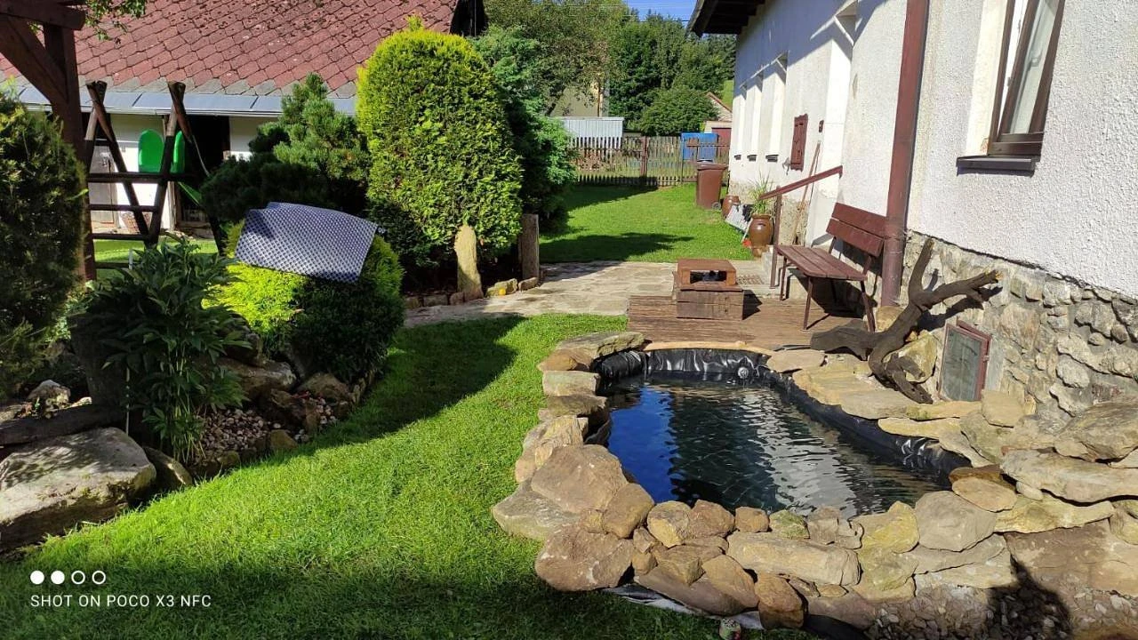 Součástí objektu je zahrada s bazénem, pergolou, krbem a sportovním vyžitím (basketbalový koš, skluzavka, houpačka, volejbalová síť). Dvůr je uzavřený, vhodný pro rodiny s dětmi. Stravování lze zajistit v blízkosti – kiosk U Staré školy (20 m), Penzion Klokočí nebo Hostinec U Janečků.