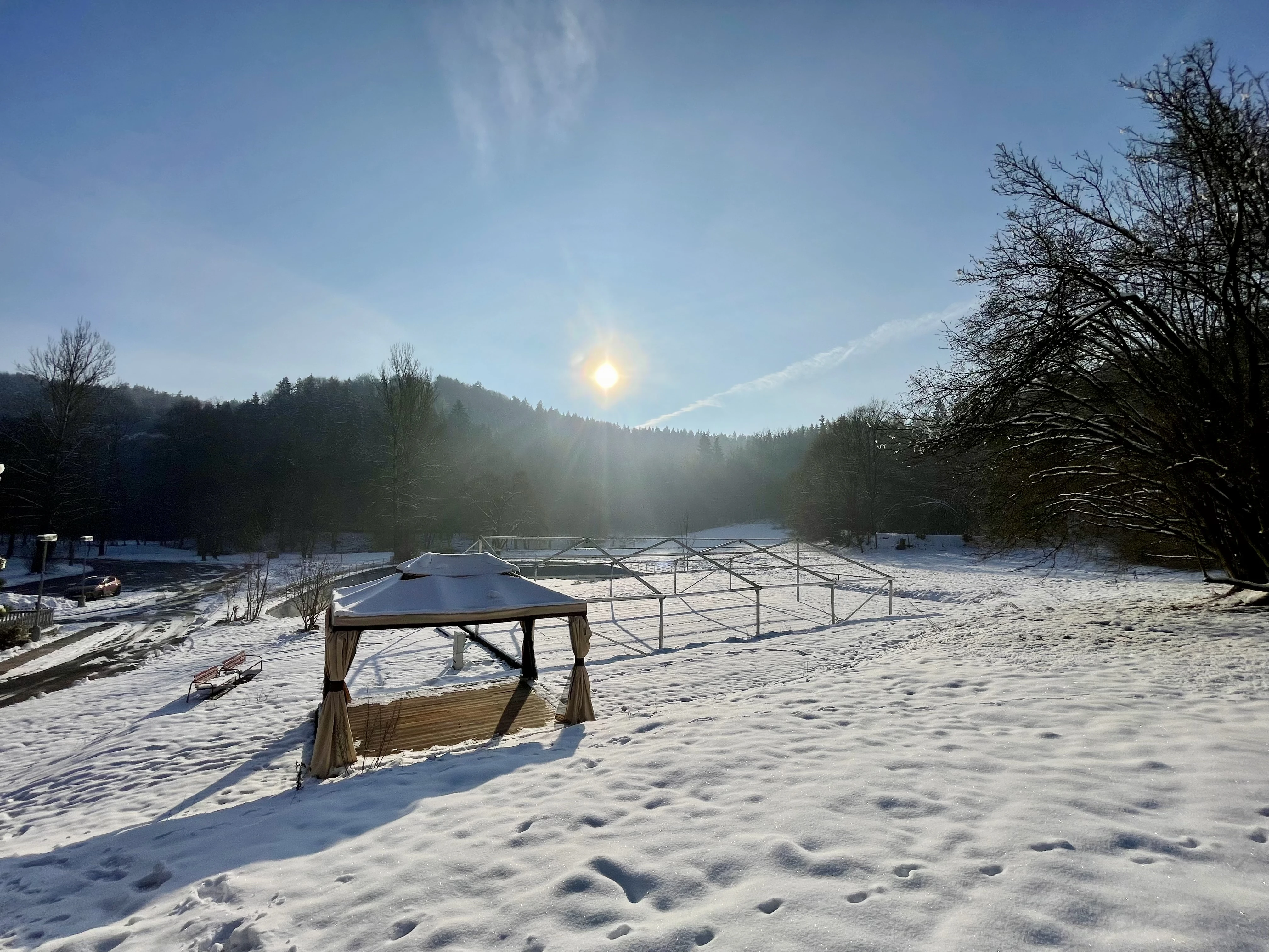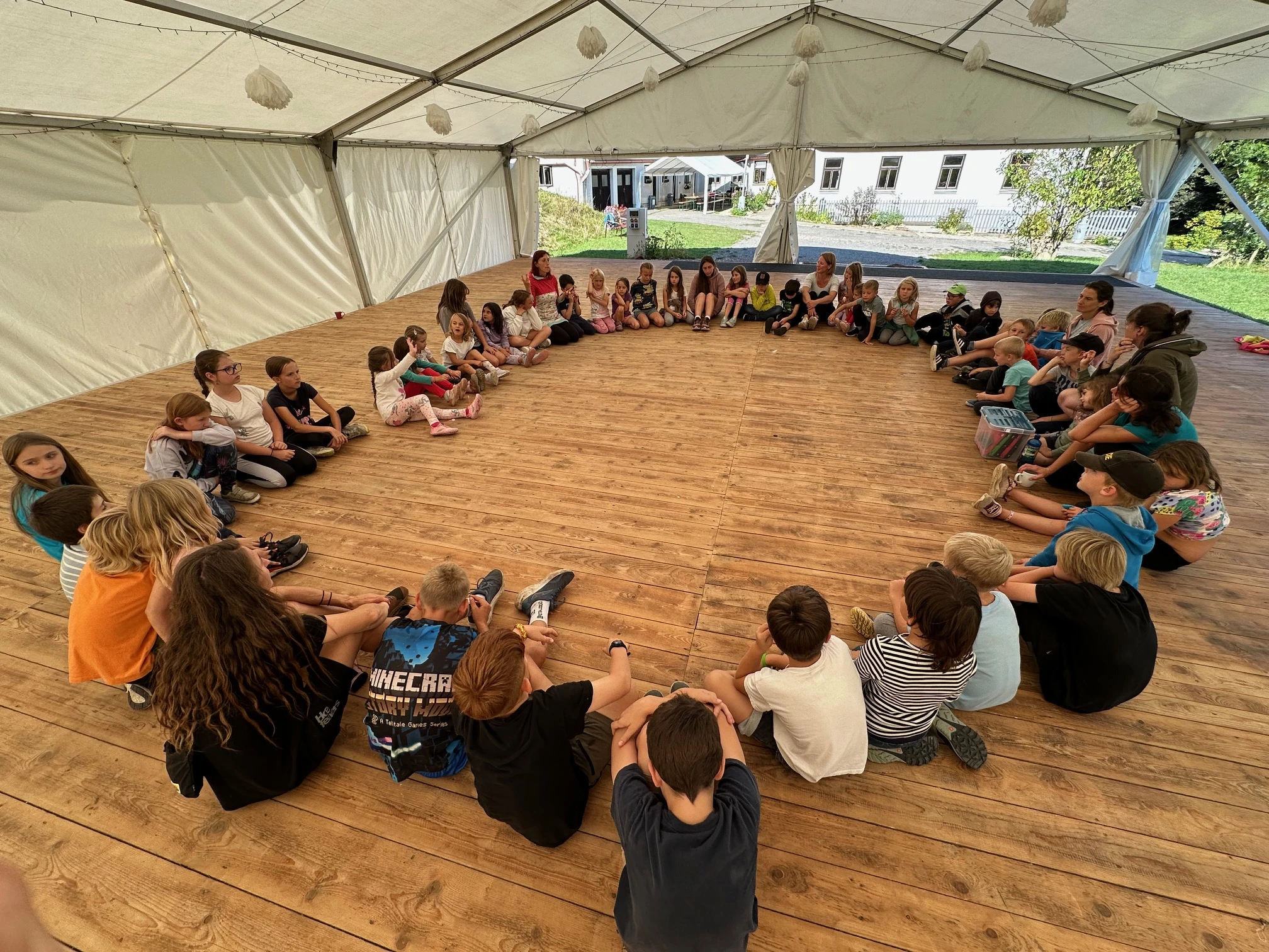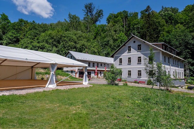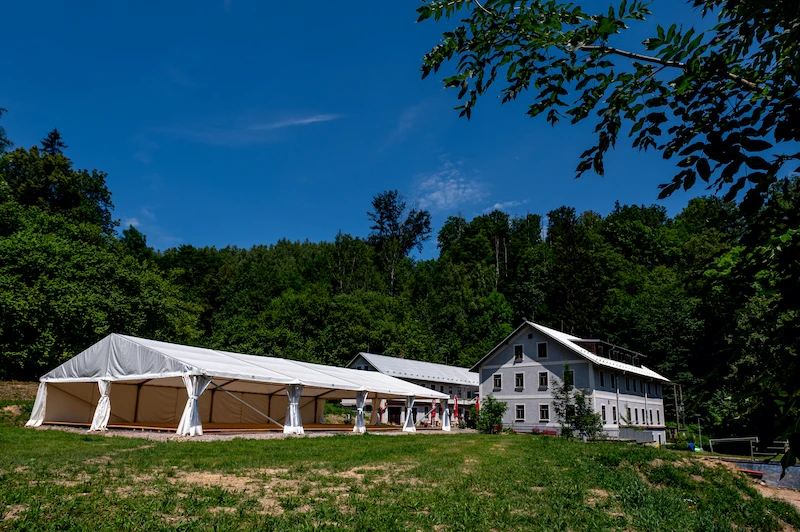 - Nabízí venkovní párty stan (240 m²) se dřevěnou podlahou pro zastřešené aktivity.
