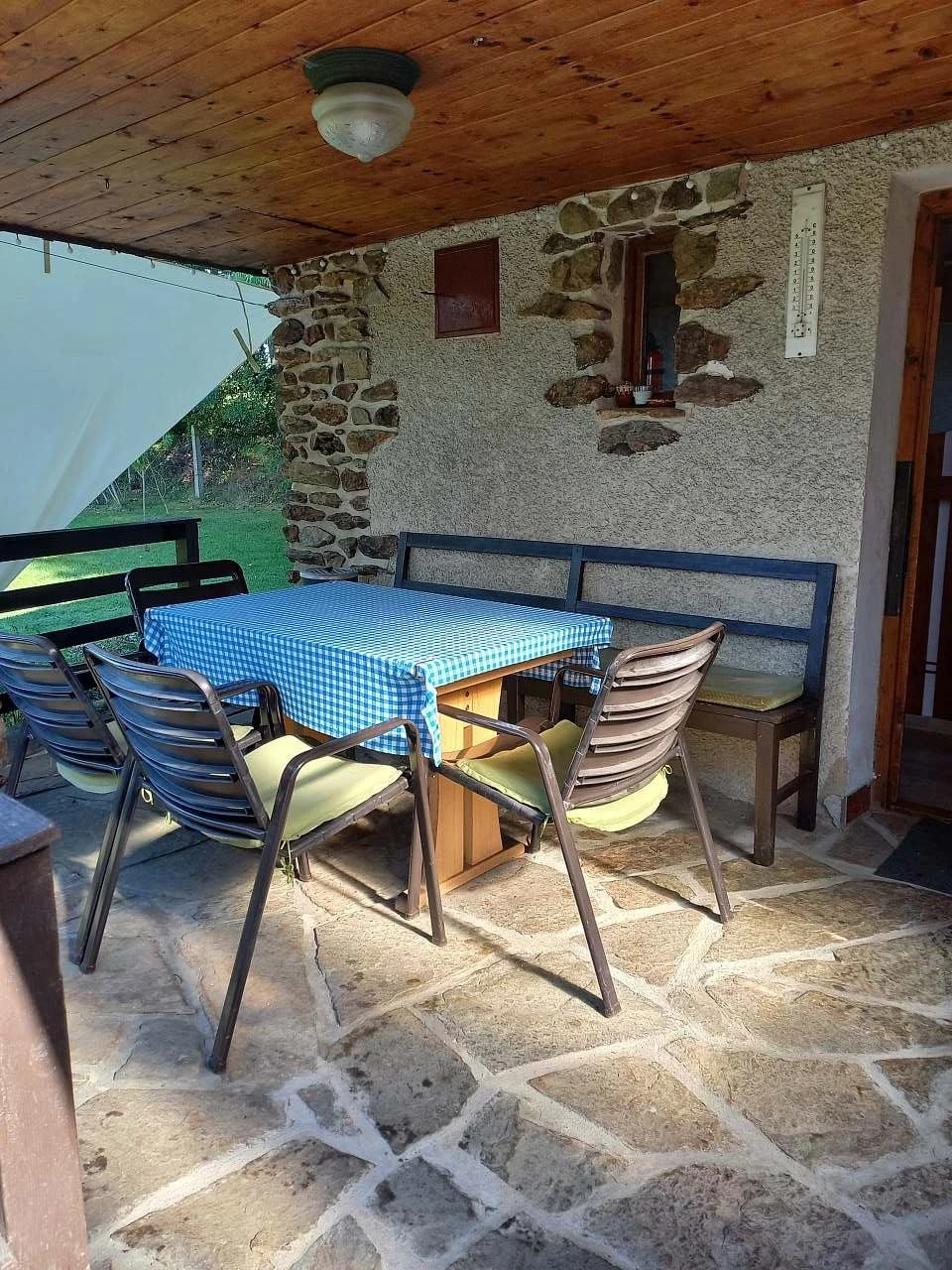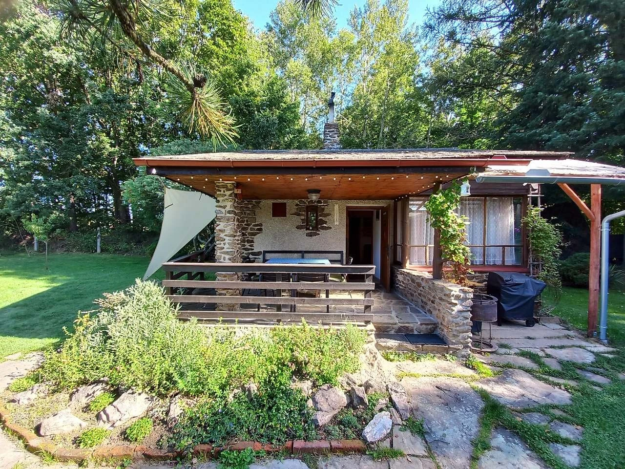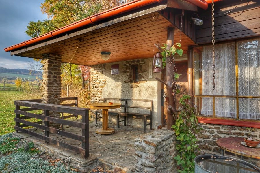 Vnitřní vybavení zahrnuje sprchový kout, kompletní zázemí pro pobyt a dostatek prostoru pro více osob. Venkovní část tvoří terasa se zahradním nábytkem, ohniště a gril, což umožňuje trávení času venku.