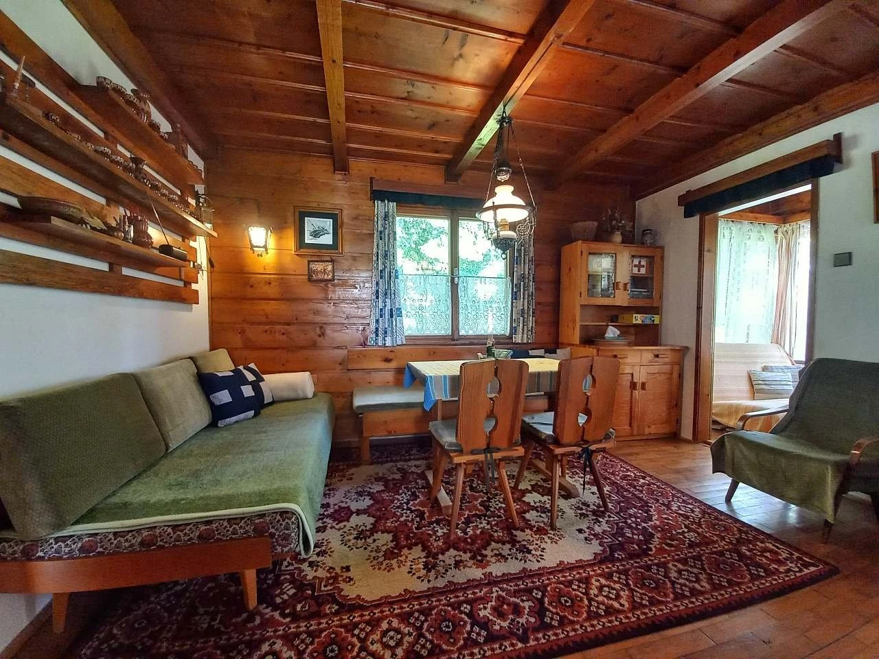 Dispozice zahrnuje obývací pokoj s kamny, posezením a rozkládacím kanapem (6. lůžko). Dále je k dispozici ložnice s manželskou postelí a menší pokoj se třemi samostatnými lůžky, úložnými prostory a skládacím stolem vhodným například pro práci nebo volnočasové aktivity. Součástí je také prosklená místnost (Kaffeezimmer), která slouží jako klidová zóna nebo čítárna a obsahuje knihovnu a informační materiály.