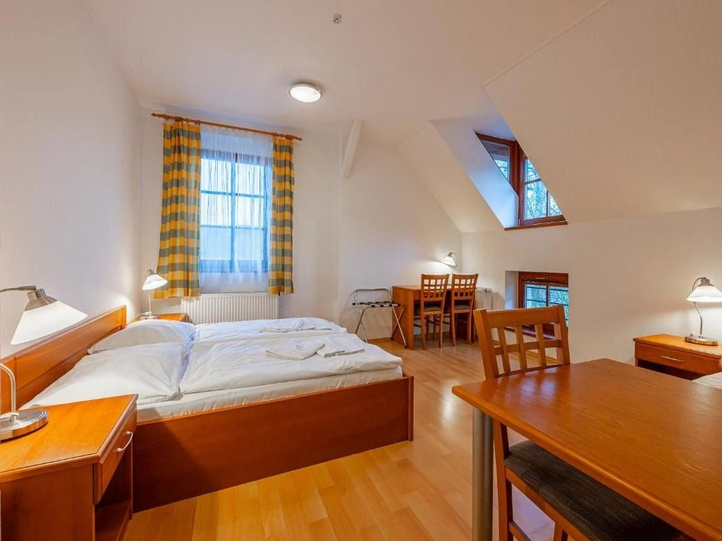 Dvoulůžkový bezbariérový pokoj je určen pro dvě osoby a tvoří jej jedna ložnice a samostatná koupelna s toaletou. V ložnici se nachází manželská postel a pracovní stůl. Součástí vybavení je televize a připojení k internetu přes Wi-Fi. Pokoj je upraven tak, aby umožňoval bezbariérový pohyb.Koupelna a toaletaKoupelna je vybavena sprchou, umyvadlem a toaletou. K dispozici jsou ručníky a fén. Prostor je přizpůsoben pro snadné užívání osobami s omezenou pohyblivostí.