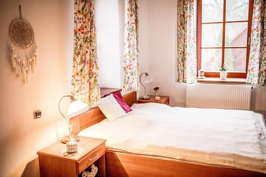 Ubytování poskytuje 20 lůžek a 14 přistýlek v 9 ložnicích s vlastní koupelnou a toaletou. K dispozici je 7 dvoulůžkových pokojů a 2 třílůžkové pokoje, přičemž do vybraných pokojů je možné přidat 1–3 přistýlky. Všechny pokoje mají pracovní stůl, televizi a připojení k internetu Wi-Fi. Pro rodiny s malými dětmi je možnost zajistit dětské postýlky.