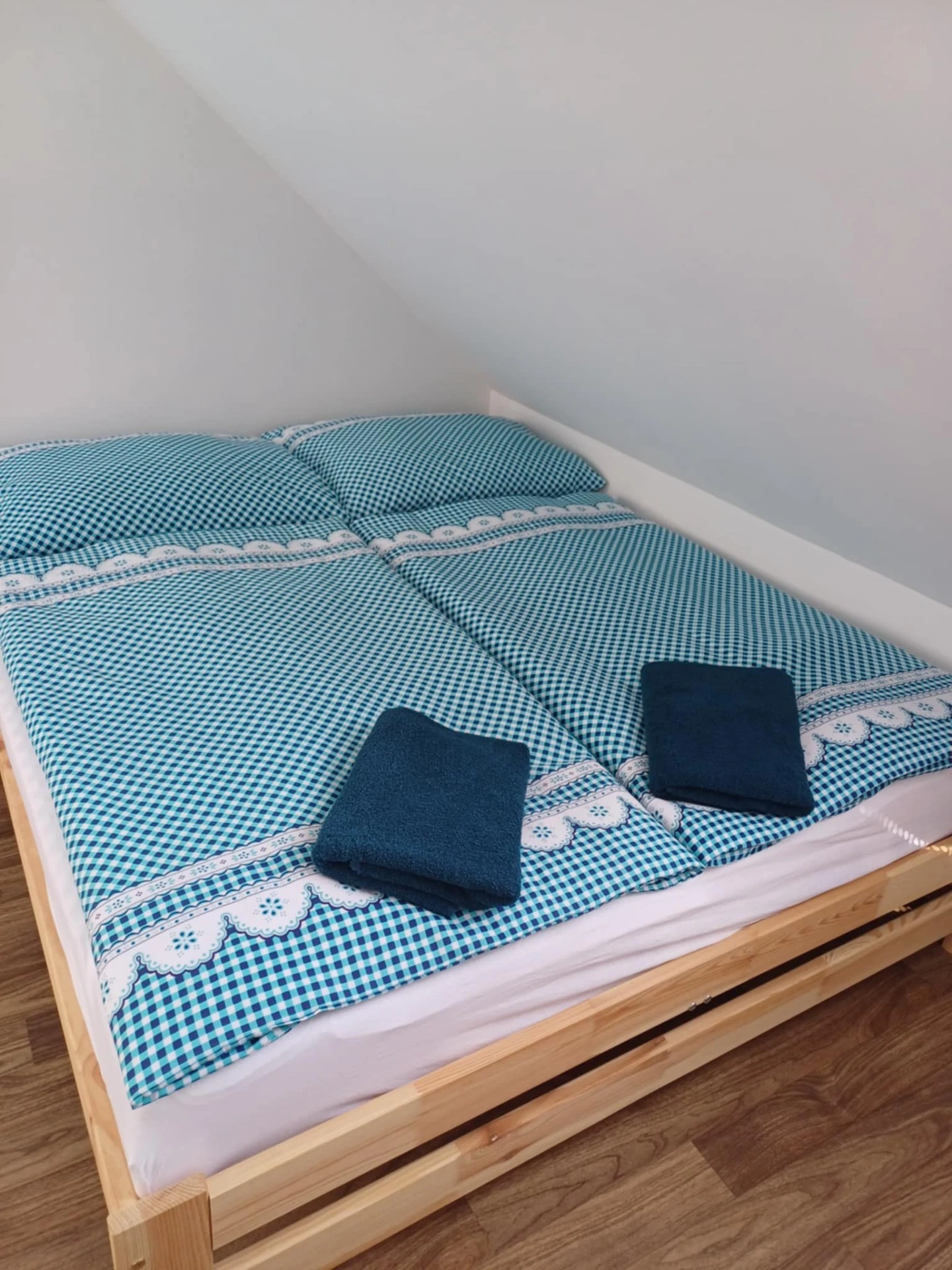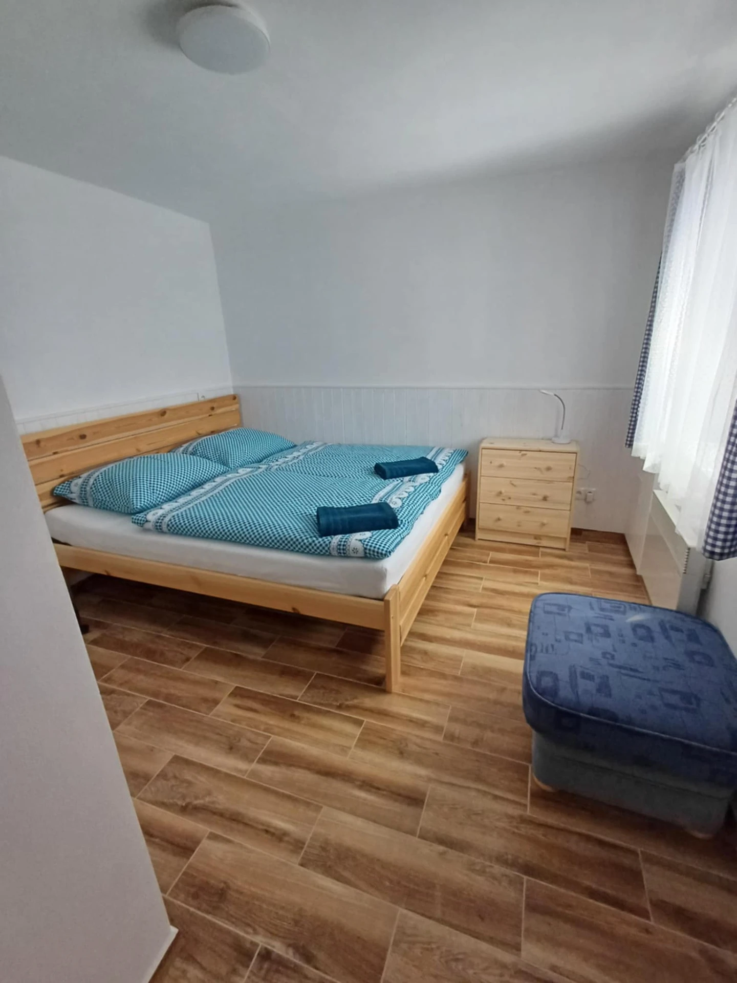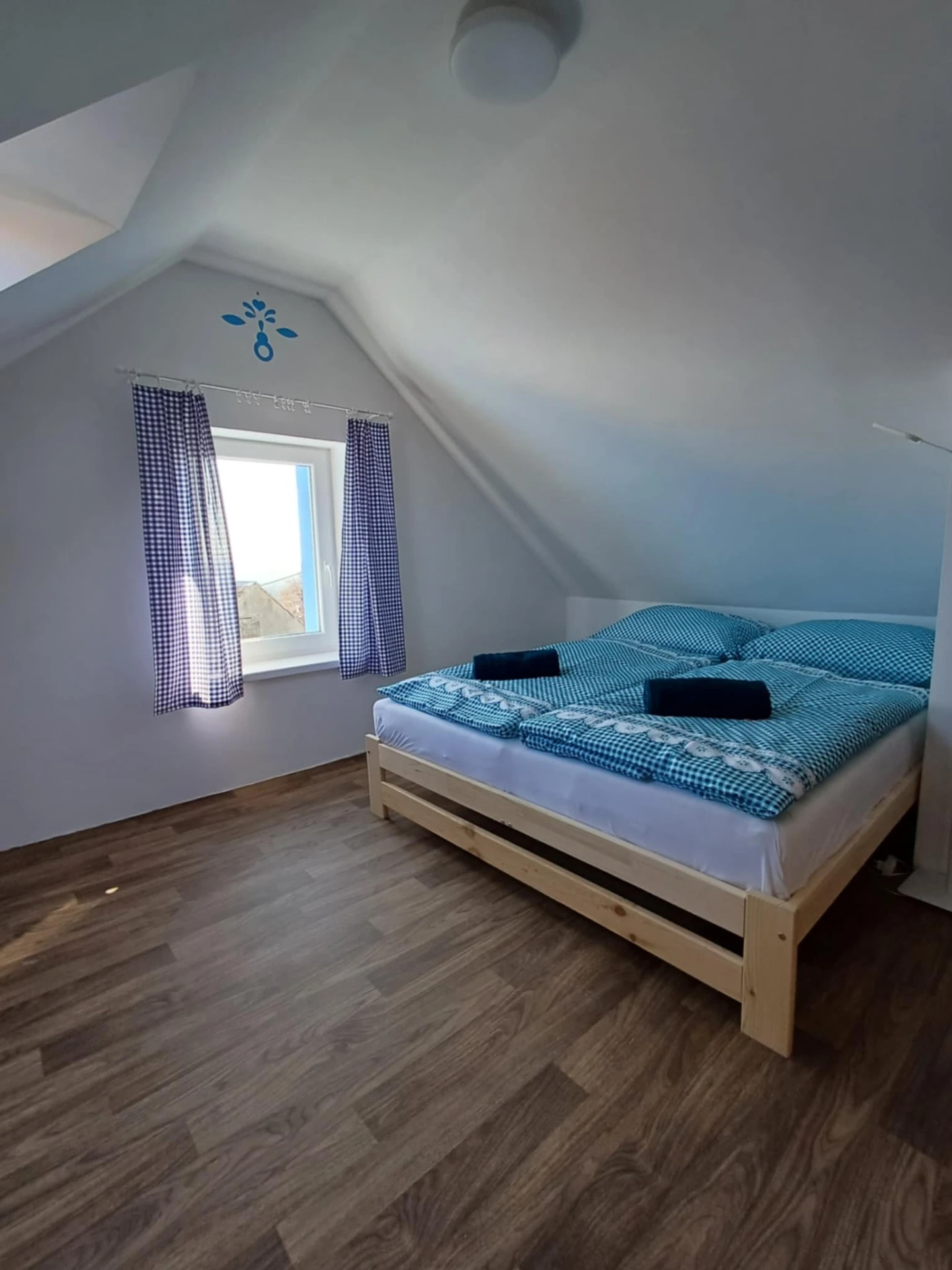 - Přízemí: dvoulůžkový pokoj s manželskou postelí a vlastním WC