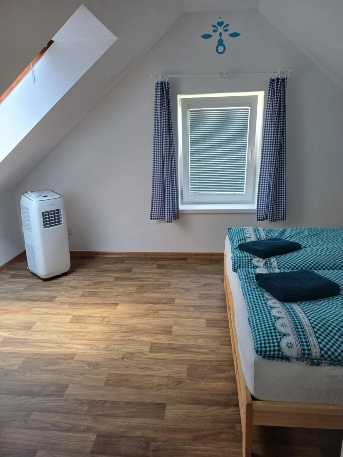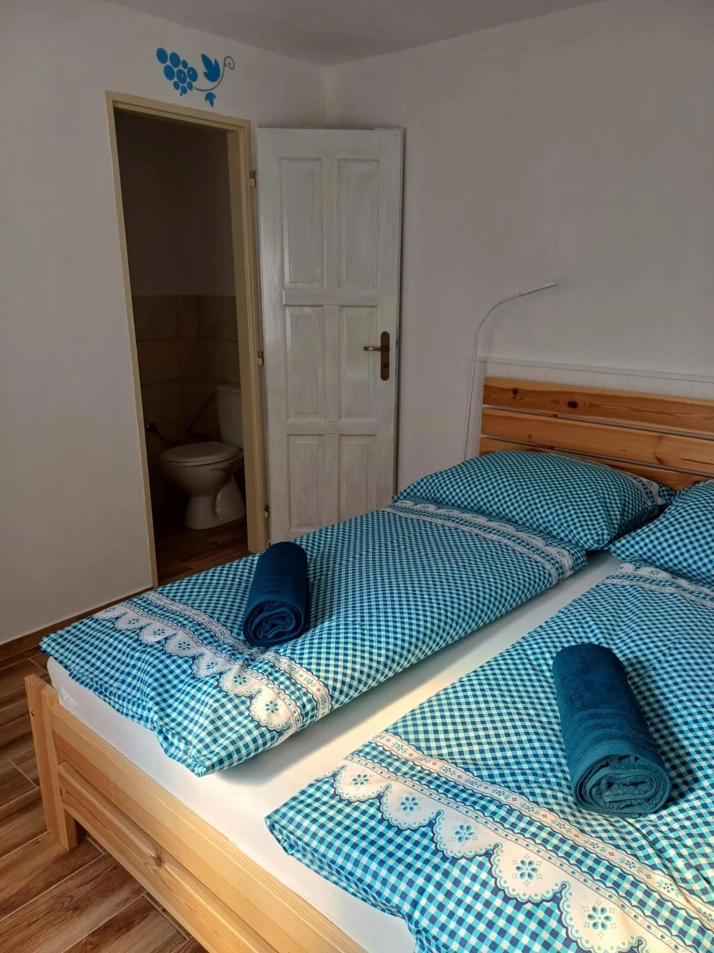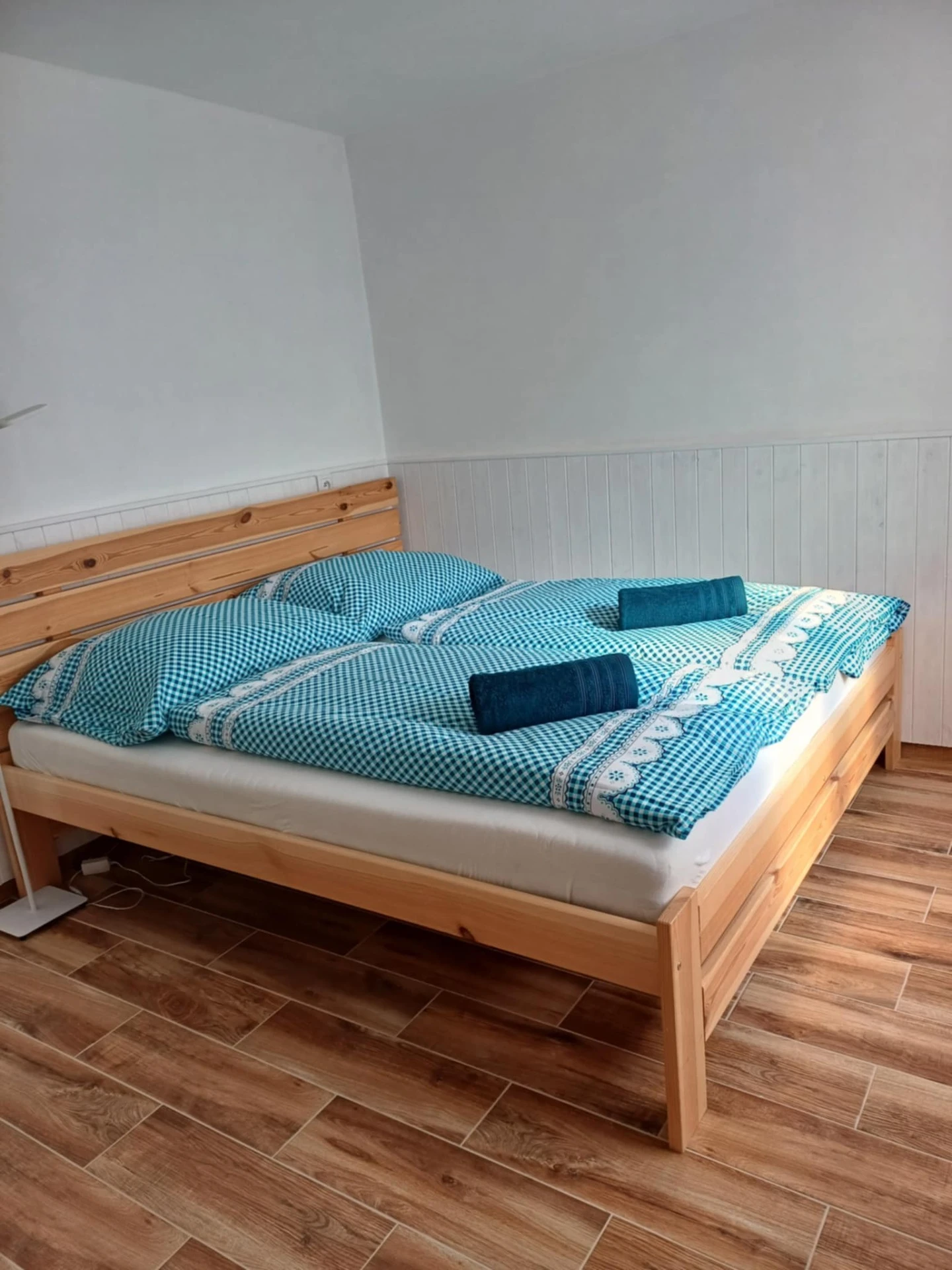 - Přízemí: dvoulůžkový pokoj s manželskou postelí a vlastním WC
