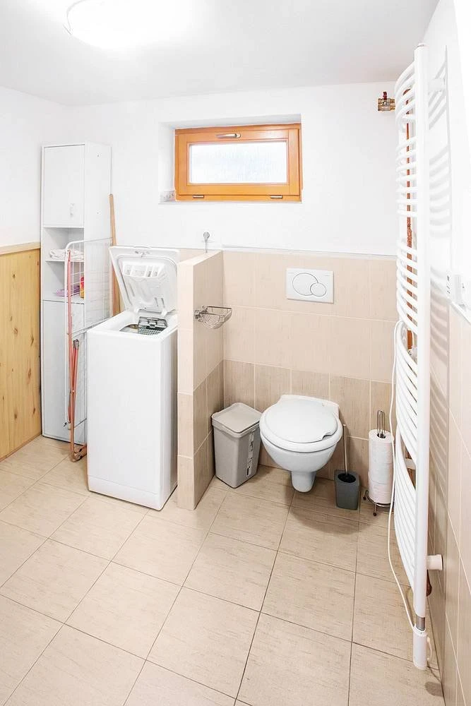 Součástí objektu je koupelna se sprchovým koutem, WC a pračkou. Vytápění je řešeno centrálním ústředním topením, s možností přitápění v kamnech ve vstupní místnosti.