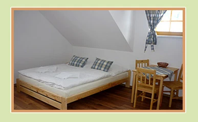Ubytování tvoří 3 samostatné apartmány s kapacitou až 8 osob. Každý apartmán je vybaven vlastní koupelnou se sprchovým koutem a WC a má kuchyňku se základním vybavením – sklokeramická plotýnka, lednička, mikrovlnná trouba a rychlovarná konvice.