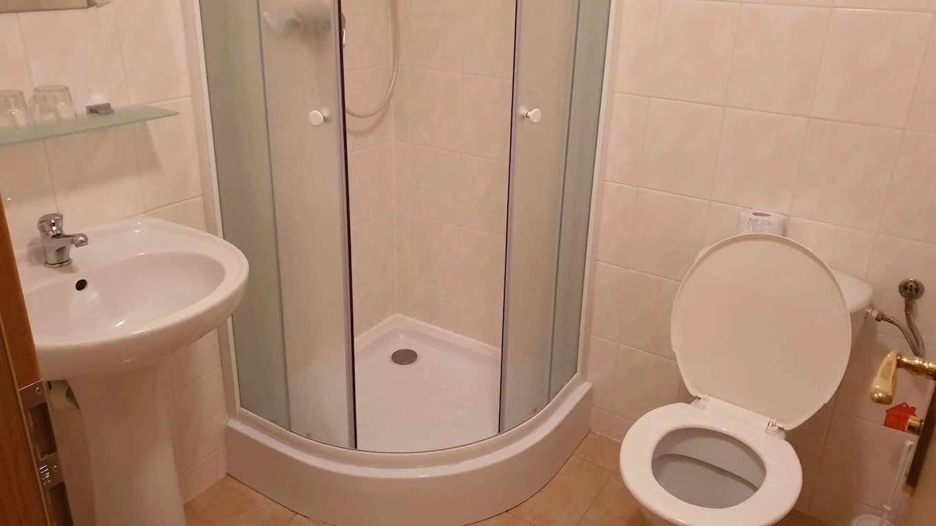 Pokoj má vlastní koupelnu s toaletou. Koupelna je vybavena sprchovým koutem, umyvadlem a toaletou. Hostům jsou k dispozici ručníky.