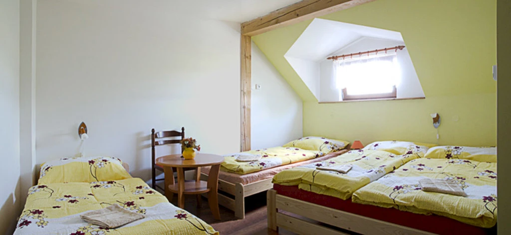 - Žlutý pokoj – 1 manželská postel, 2 samostatná lůžka