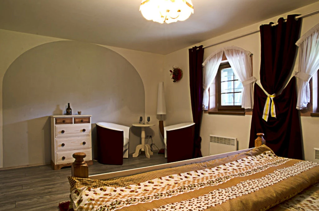 - Romantický pokoj – 1 velká manželská postel, lednička na pokoji, trezor