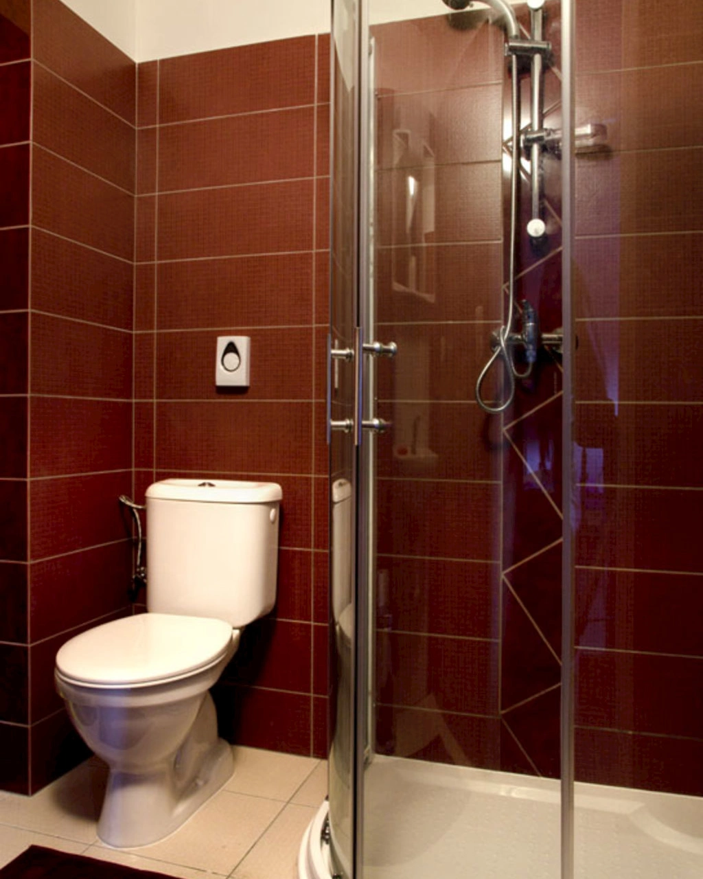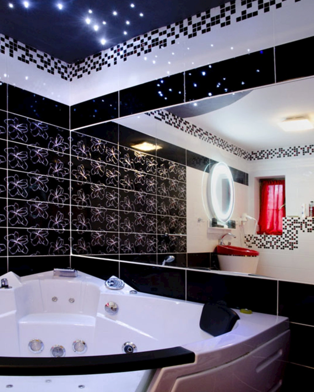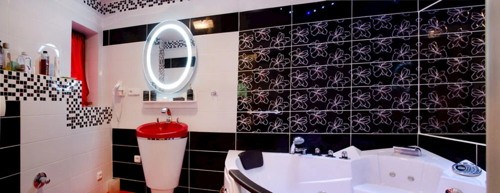 Pokoj má samostatnou koupelnu s bidetem a velkou rohovou vanou pro 2 osoby (hydromasáž, mikromasáž, světelná terapie, rádio, LED osvětlení).