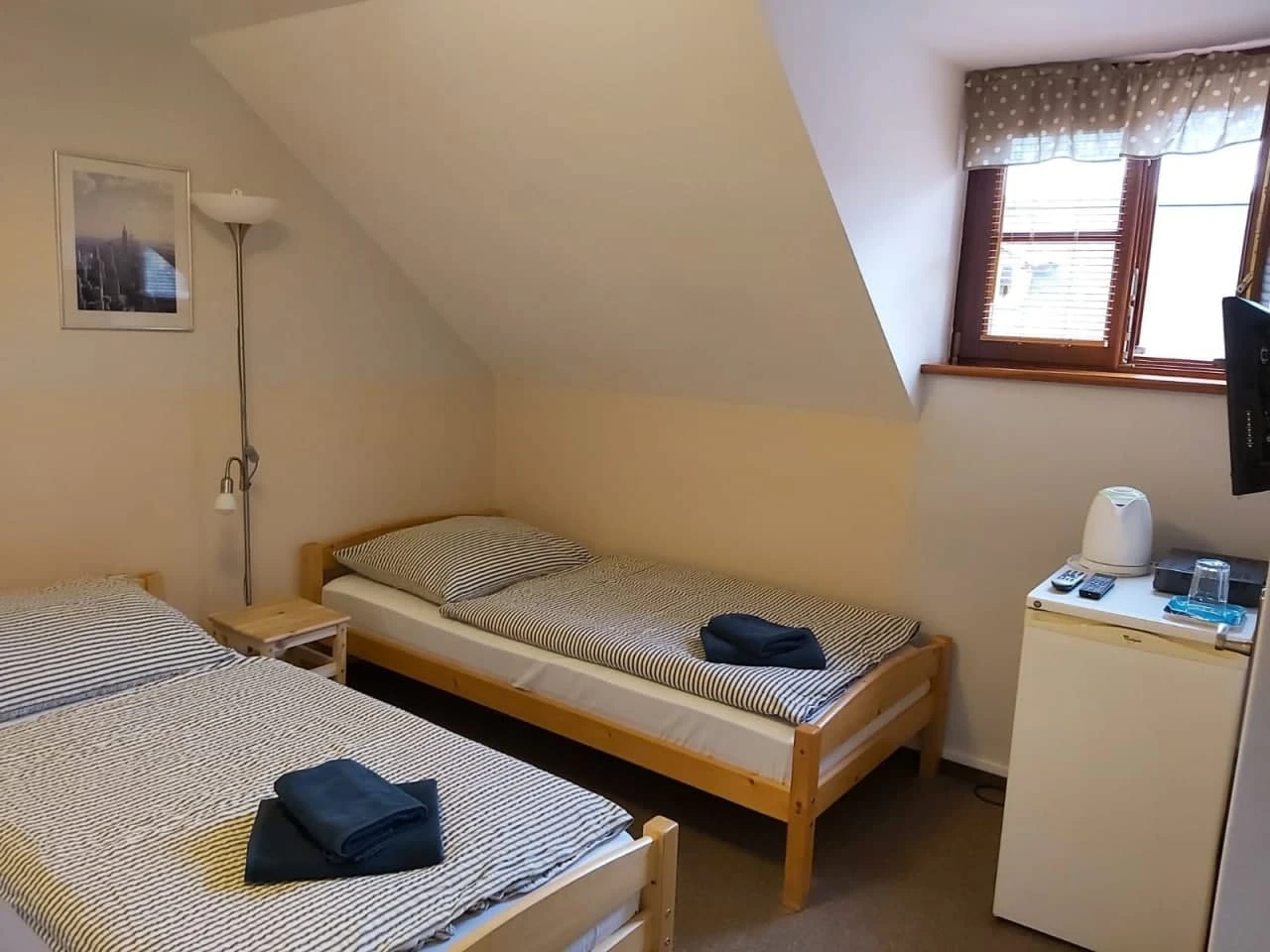 Třílůžkový pokoj nabízí vlastní koupelnu, rychlovarnou konvici a výhled do zahrady. Vhodný pro menší skupiny nebo rodiny.