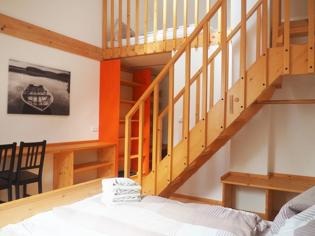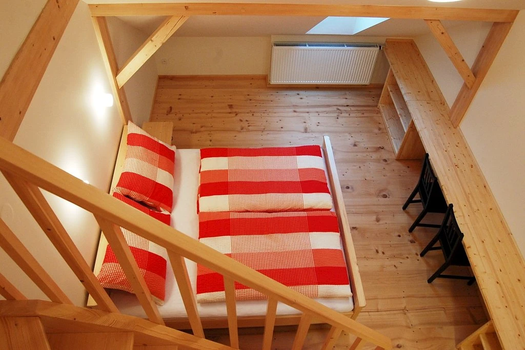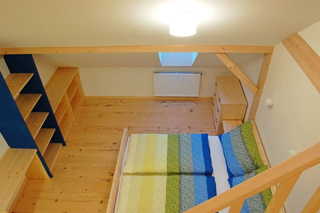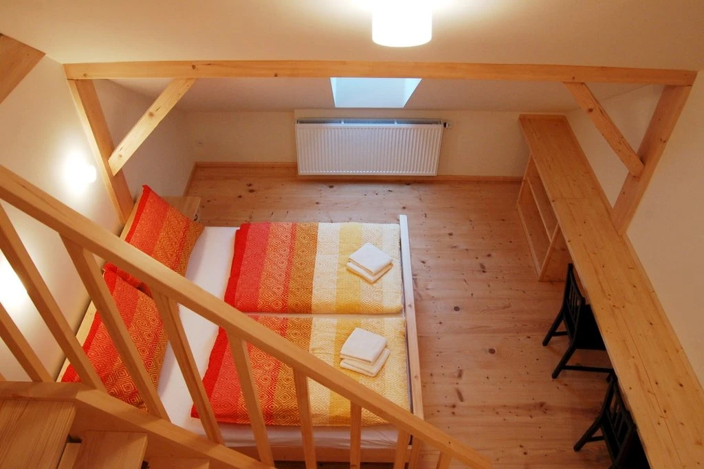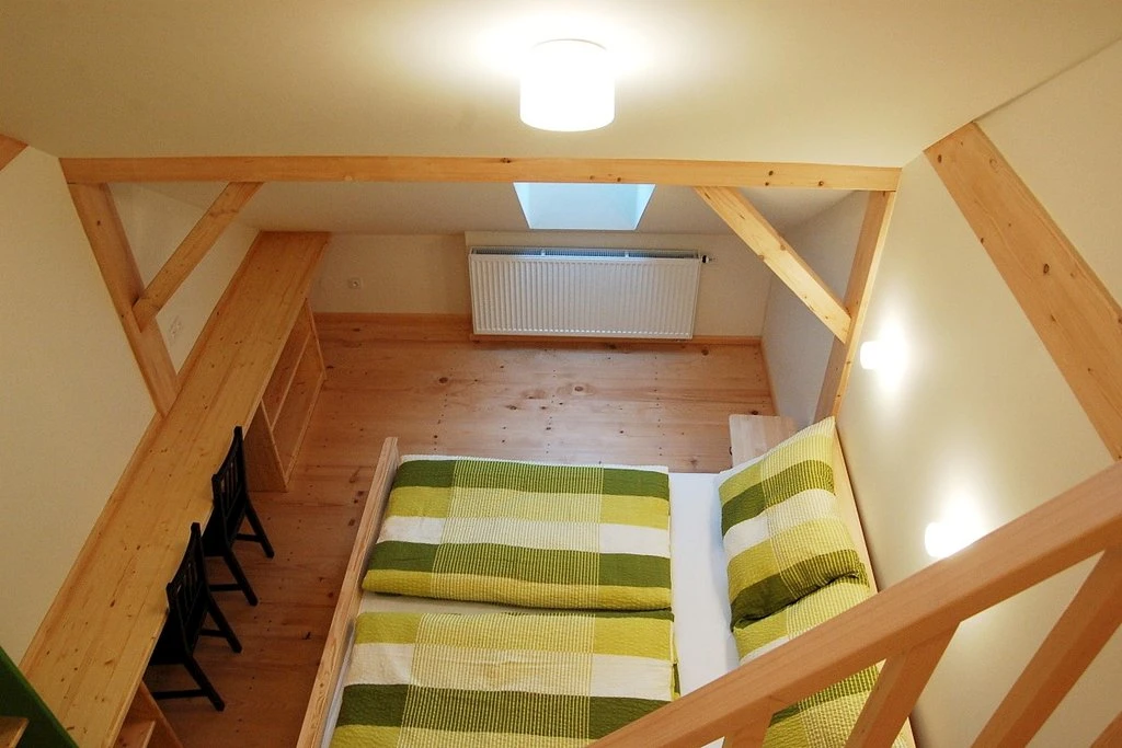 Má kromě střešních oken i okna ve stěně a je vybaven vlastní kuchyňkou.Apartmán je určen pro 4 osoby s možností přistýlky.K dispozici je vlastní sociální zařízení- koupelna s umyvadlem, toaletou a sprchovým koutem.V apartmánu je připojení k internetu prostřednictvím wi-fi a je zde televize.