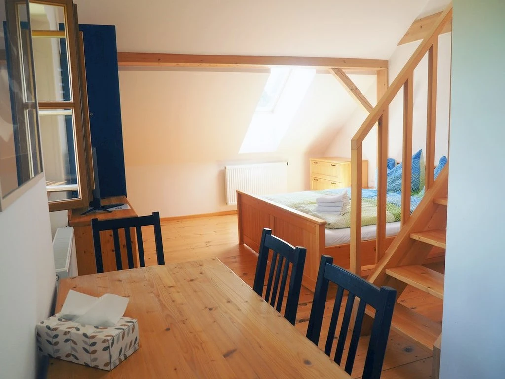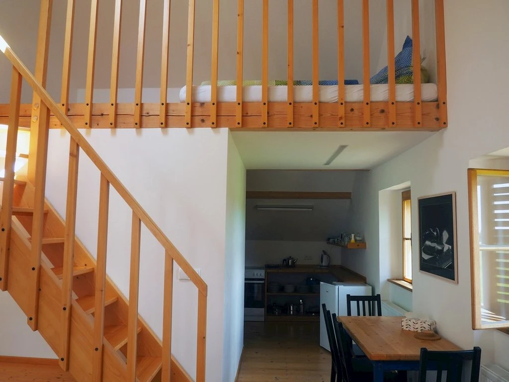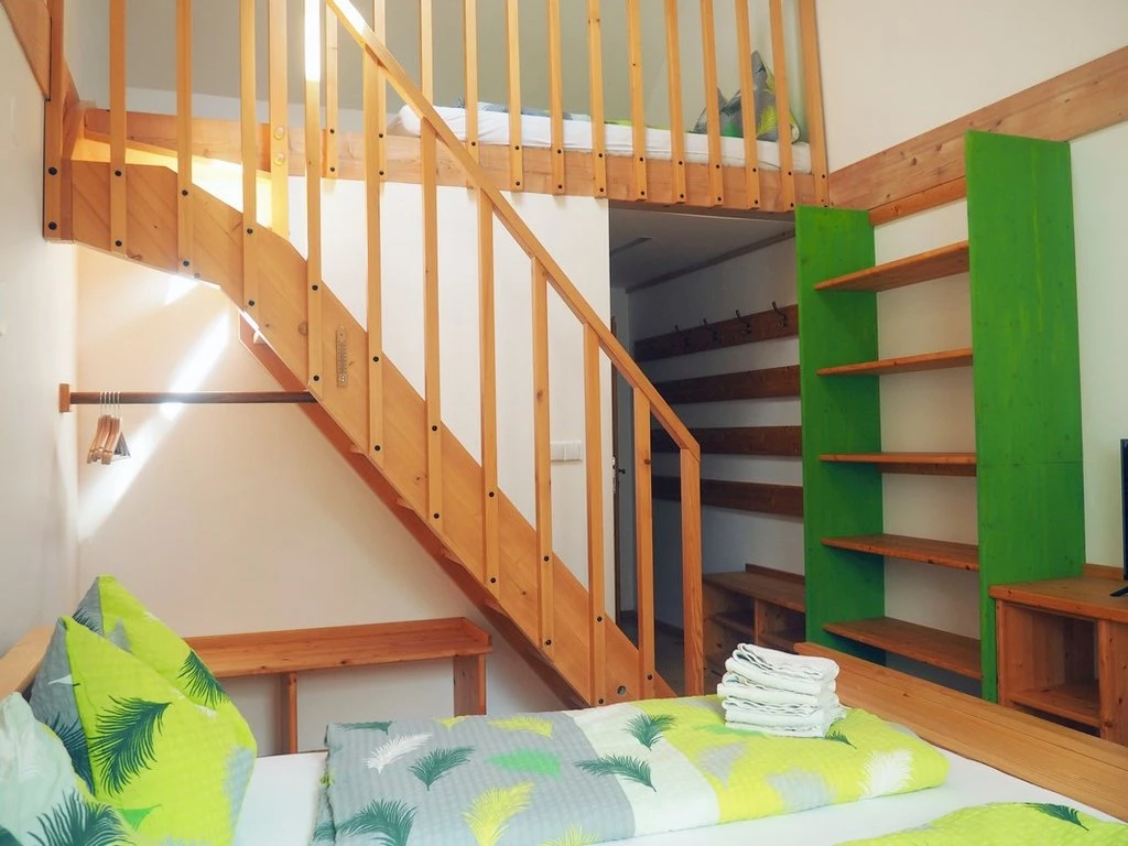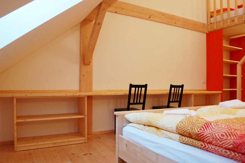 Má kromě střešních oken i okna ve stěně a je vybaven vlastní kuchyňkou.Apartmán je určen pro 4 osoby s možností přistýlky.K dispozici je vlastní sociální zařízení- koupelna s umyvadlem, toaletou a sprchovým koutem.V apartmánu je připojení k internetu prostřednictvím wi-fi a je zde televize.