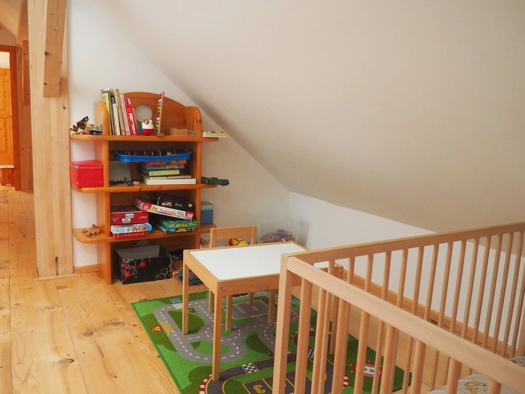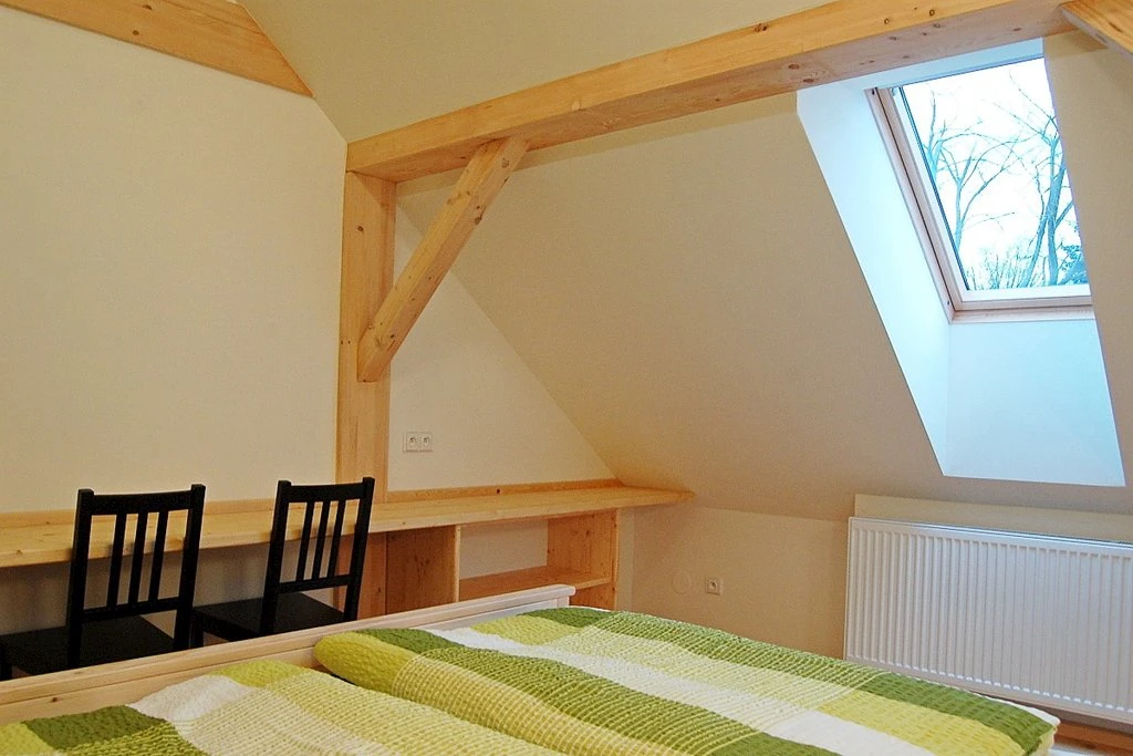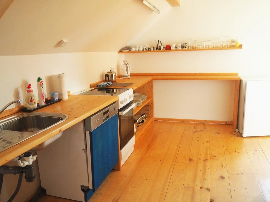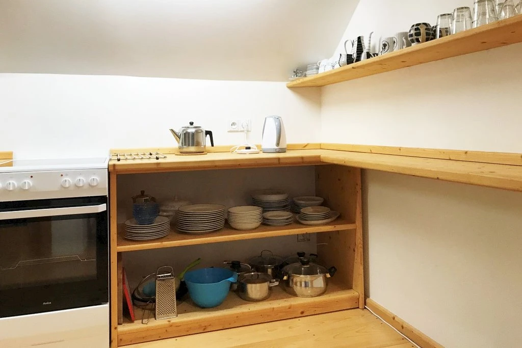 Má kromě střešních oken i okna ve stěně a je vybaven vlastní kuchyňkou.