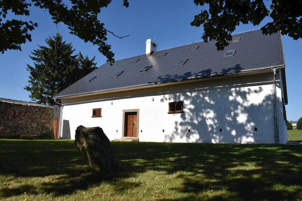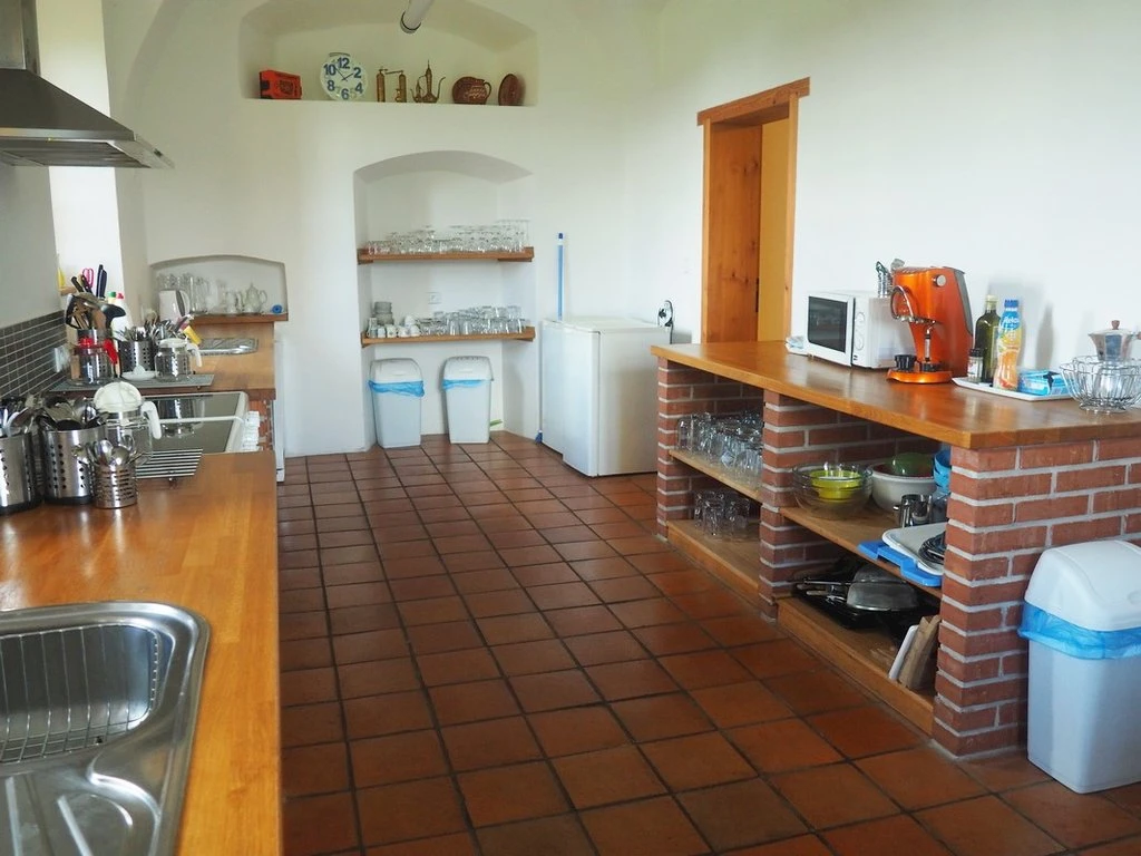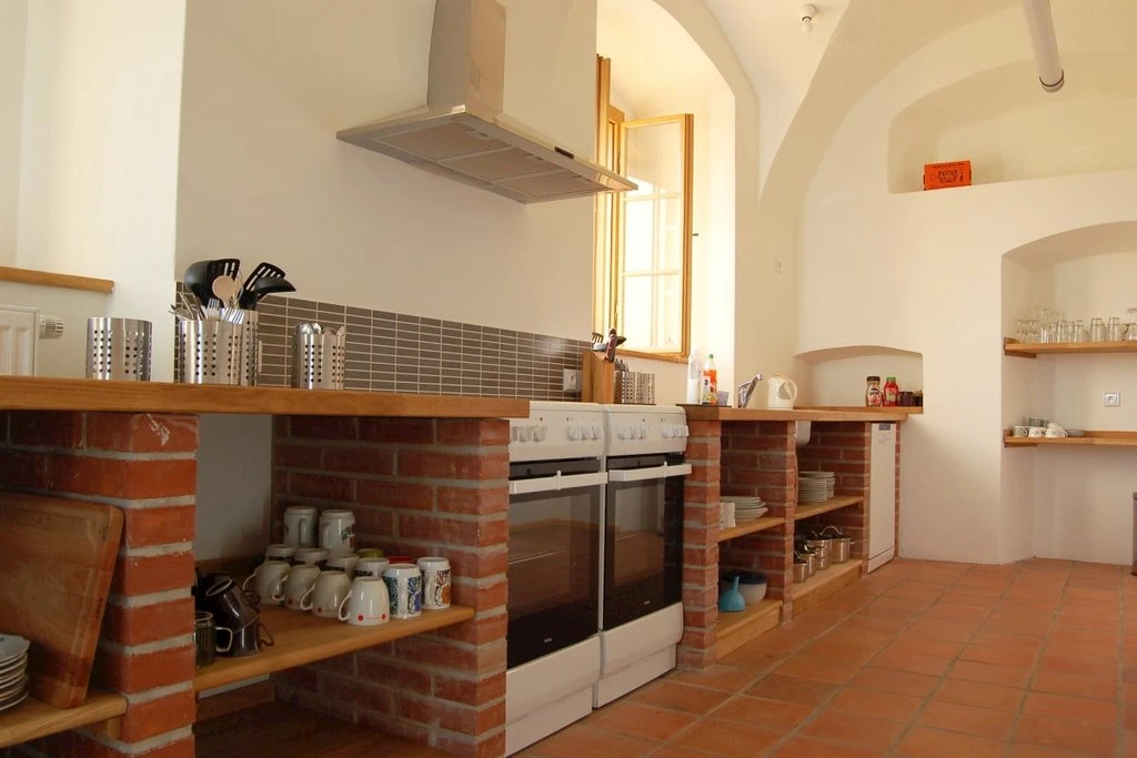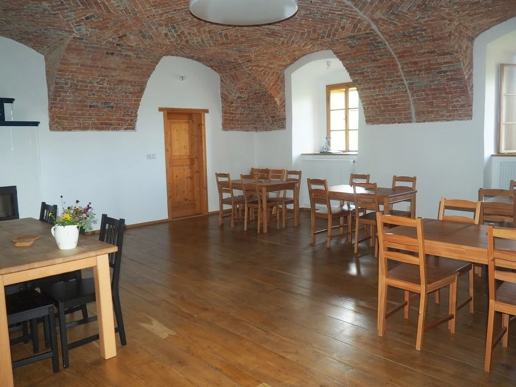 Společenská místnost – slouží jako jídelna a prostor pro setkávání, vybavena kachlovými kamny a sousedí s velkou kuchyní.