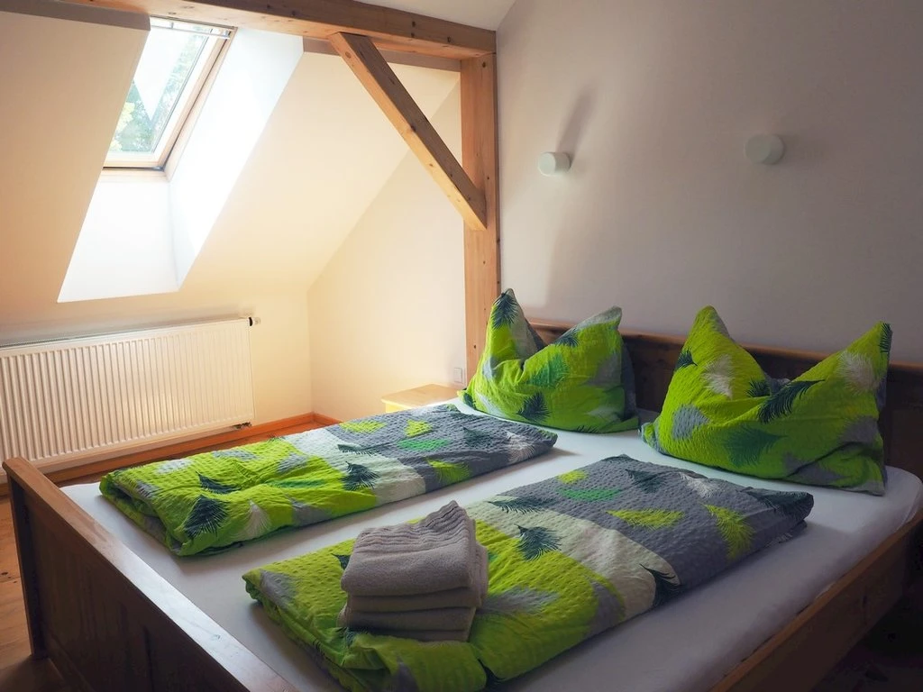 Zelený pokoj – 1. patro, pro 4 osoby s možností přistýlky, vlastní koupelna se sprchou, umyvadlem a toaletou, Wi-Fi připojení a televize.