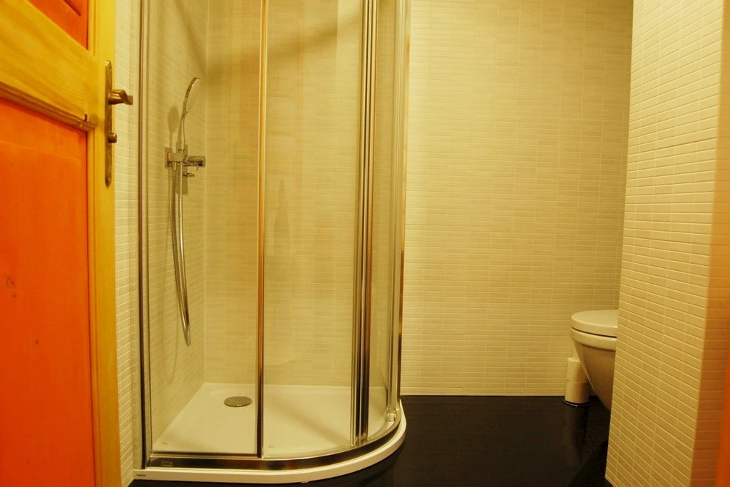 Oranžový pokoj – 1. patro, pro 4 osoby s možností přistýlky, vlastní koupelna se sprchou, umyvadlem a toaletou, Wi-Fi připojení a televize.