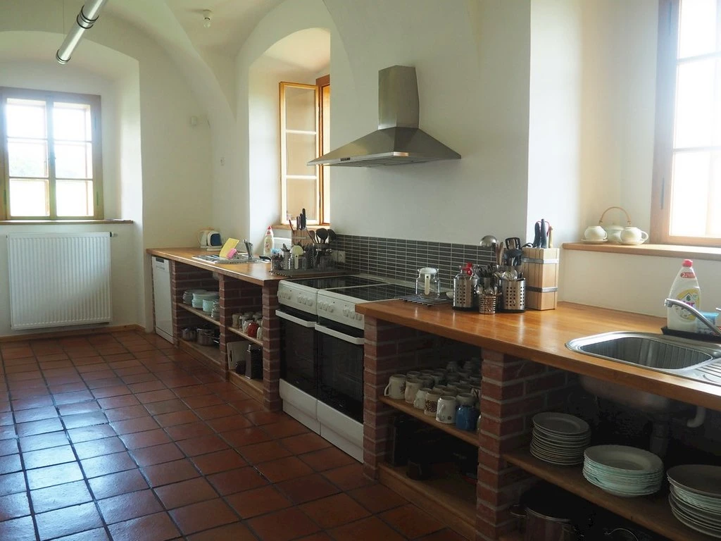 Kuchyně pro ubytované – 2 nezávislé kuchyňské linky, 2 sporáky, 2 myčky, standardní vybavení, každý pokoj má vlastní lednici.