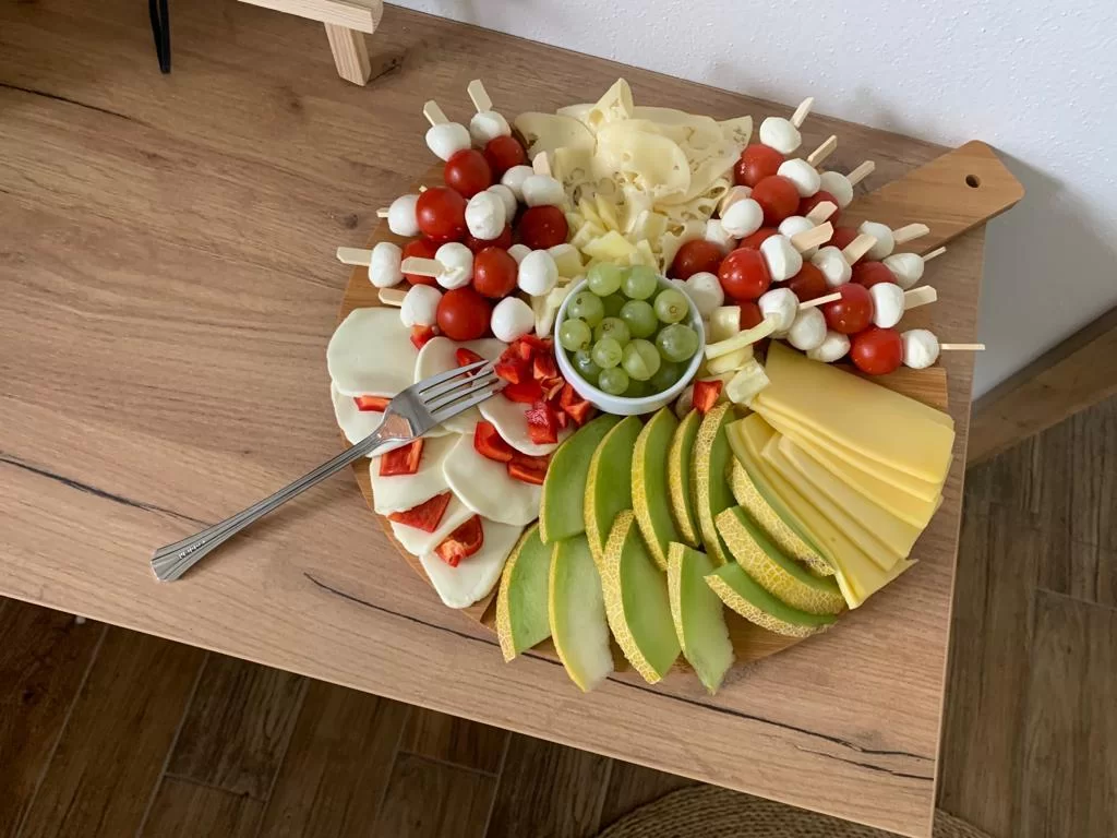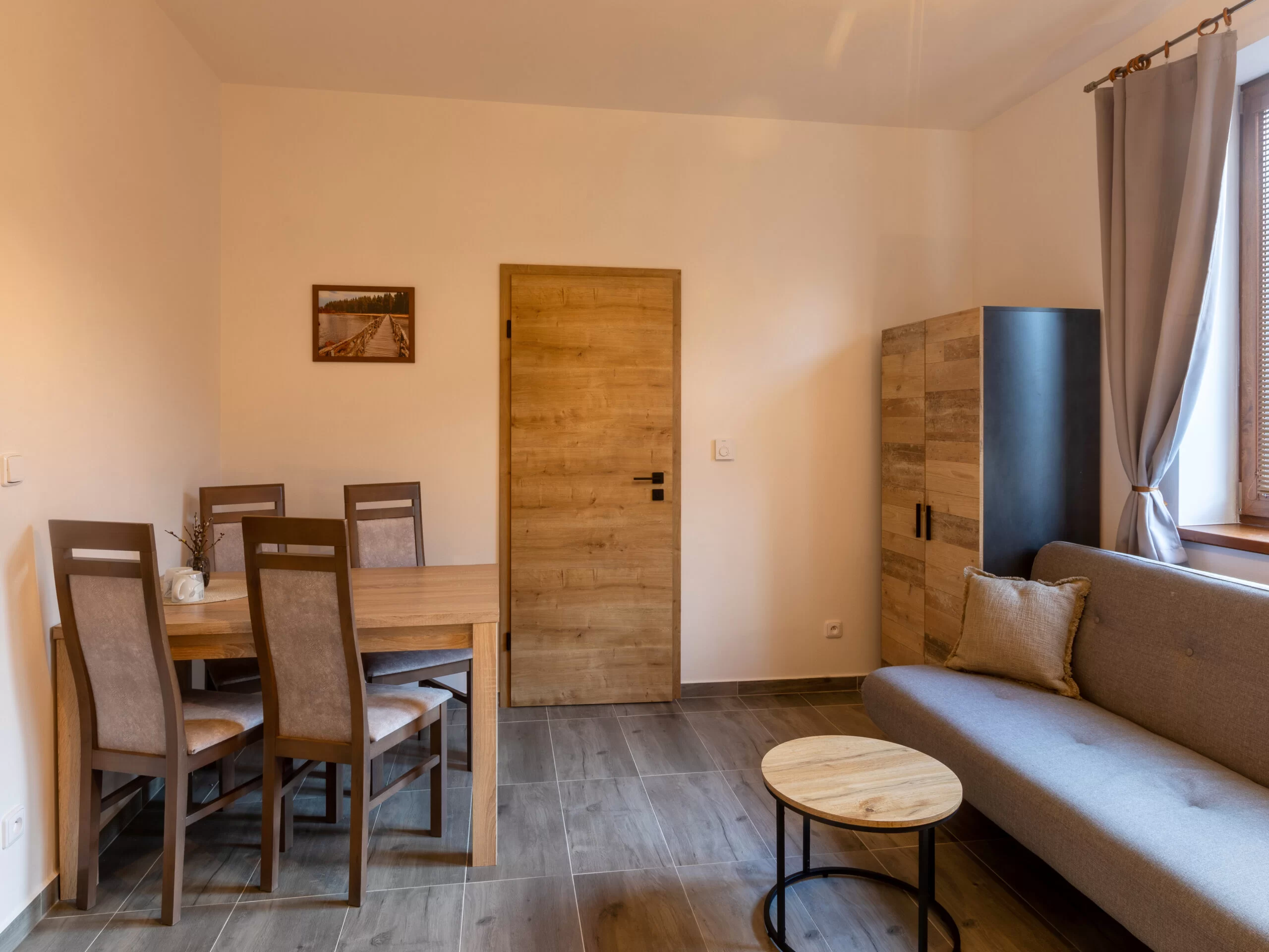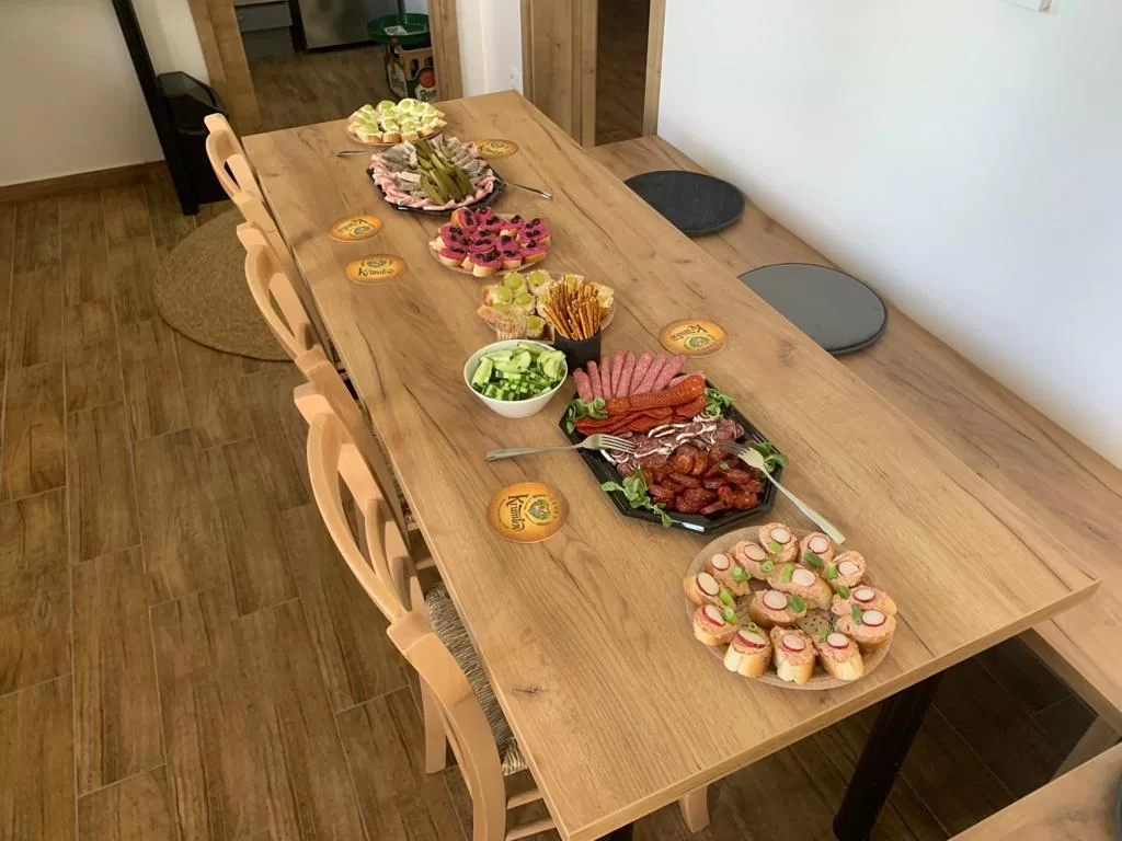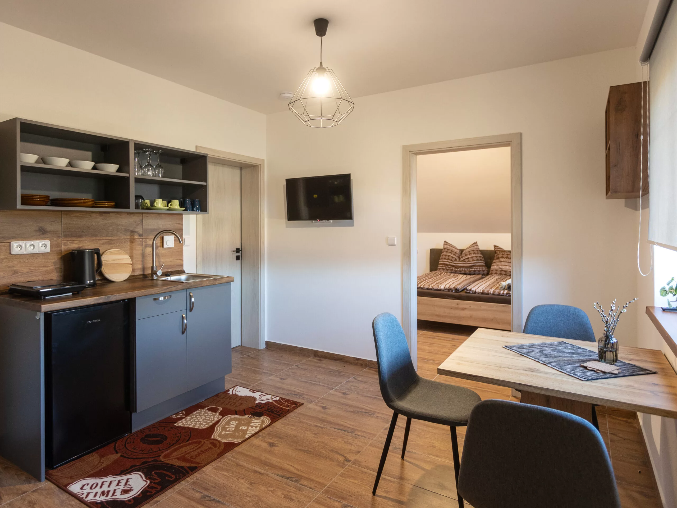 Součástí apartmánu je Smart TV 32" (nástěnná), stůl se židlemi, odkládací stolek, lampa, šatní skříň, zatemňovací rolety (blackout) a plně vybavený kuchyňský kout pro vlastní vaření.