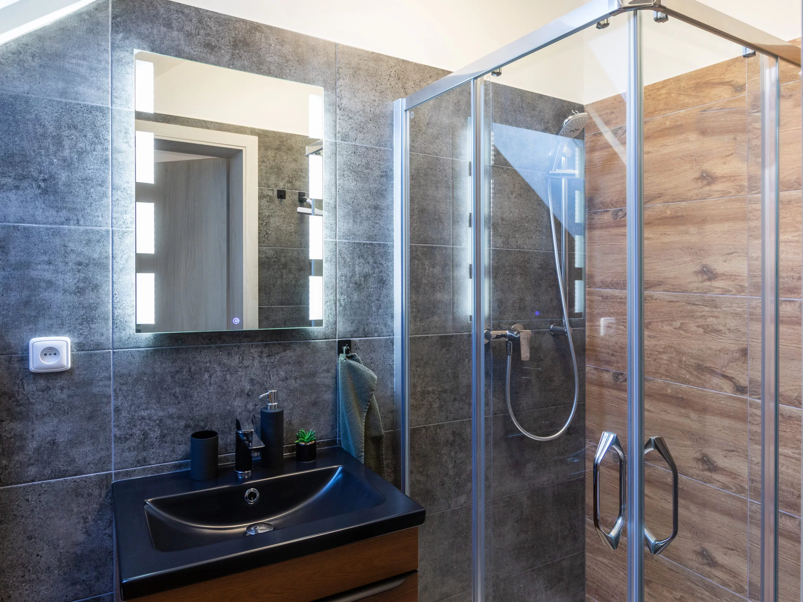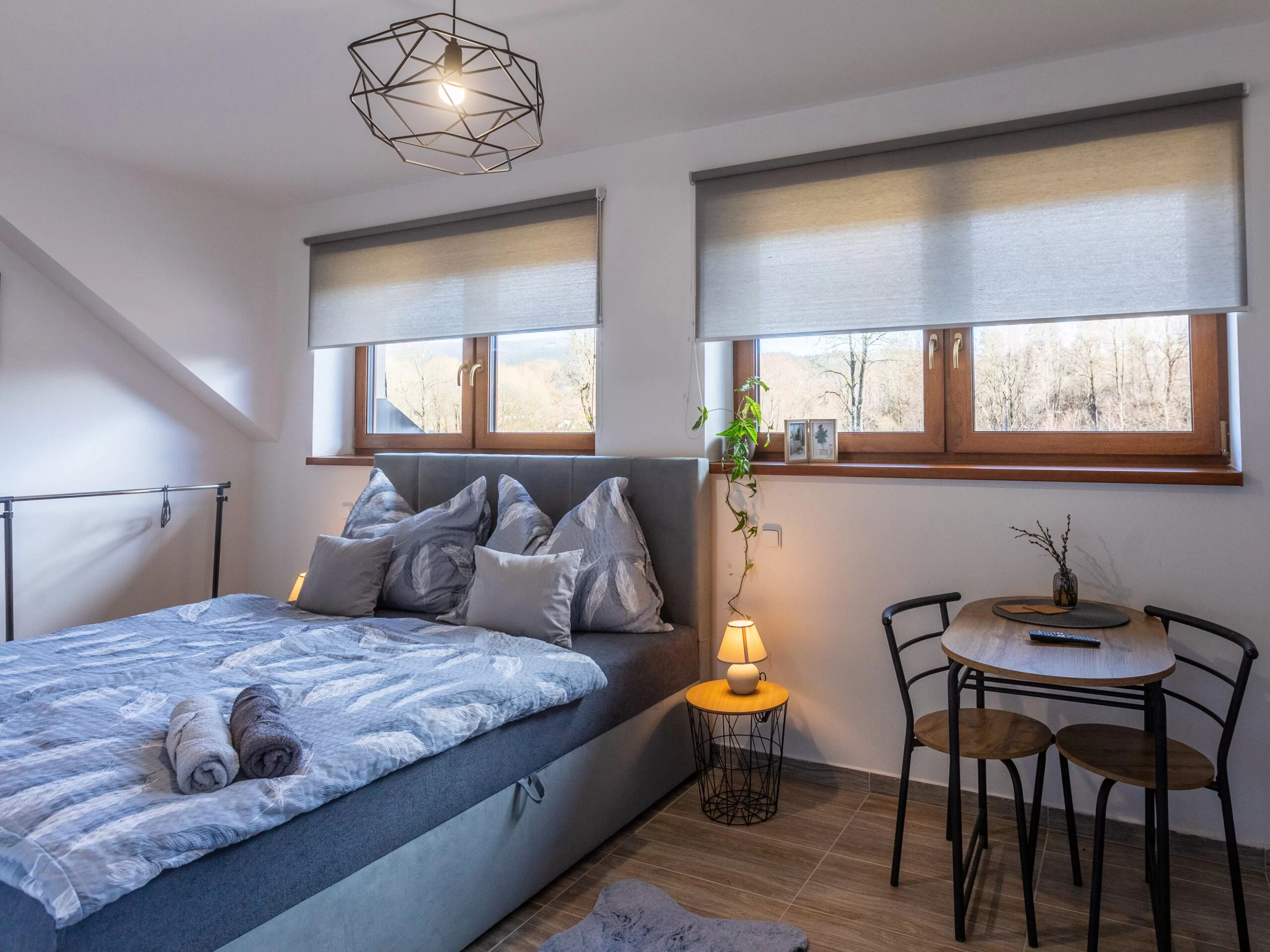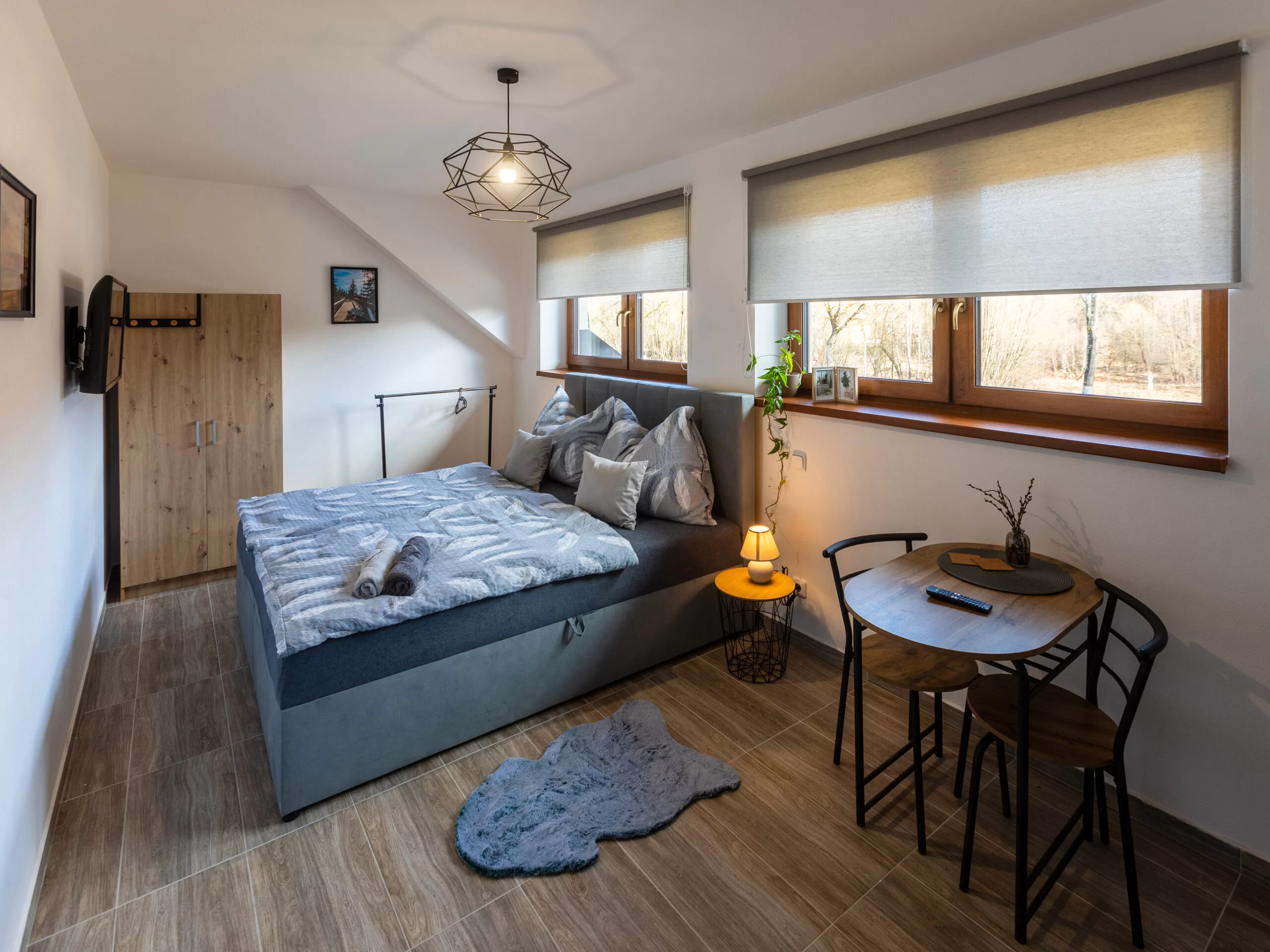 | Studio Grey | 20 m² | 2 osoby | 1× king 180×200 | Smart TV 80", blackout rolety, podlahové topení | kuchyňský kout | ano (sprcha, WC) | 2 600 Kč / noc |
