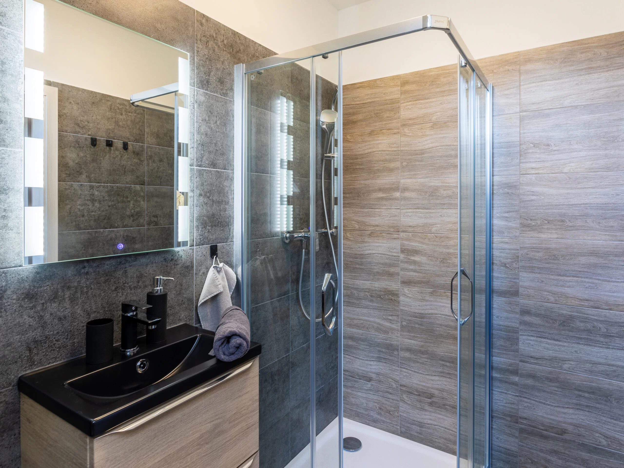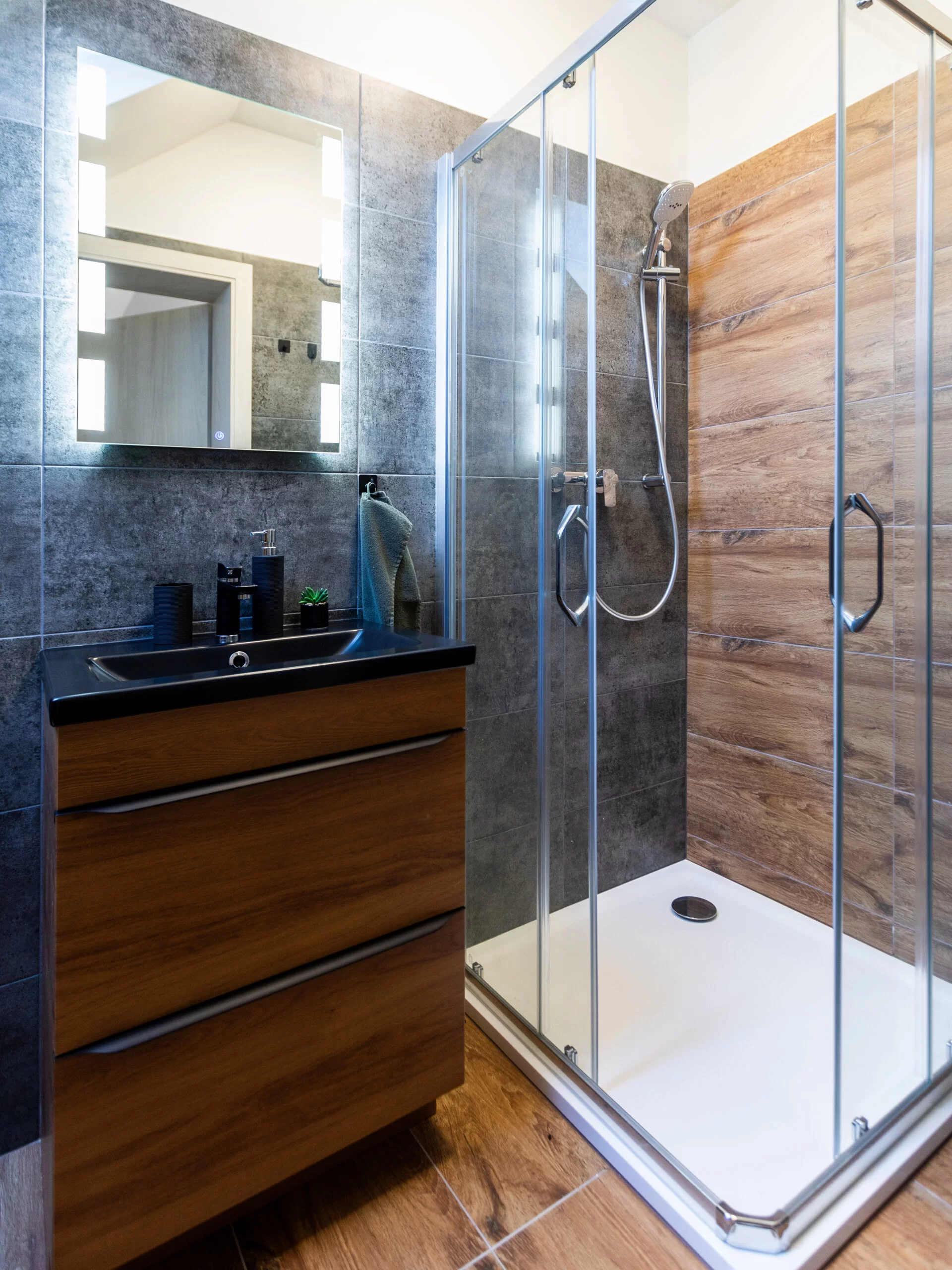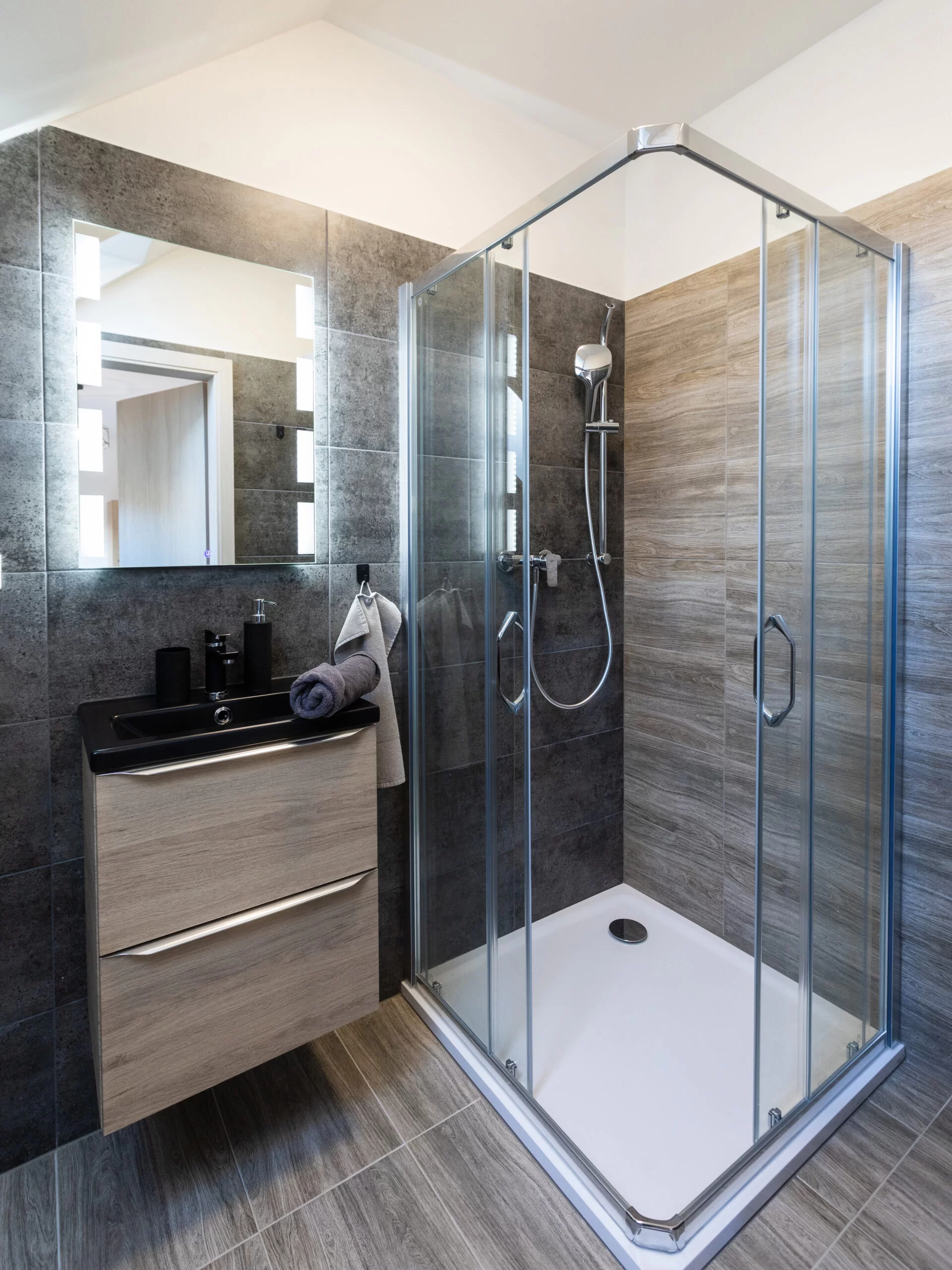 | Studio Grey | 20 m² | 2 osoby | 1× king 180×200 | Smart TV 80", blackout rolety, podlahové topení | kuchyňský kout | ano (sprcha, WC) | 2 600 Kč / noc |