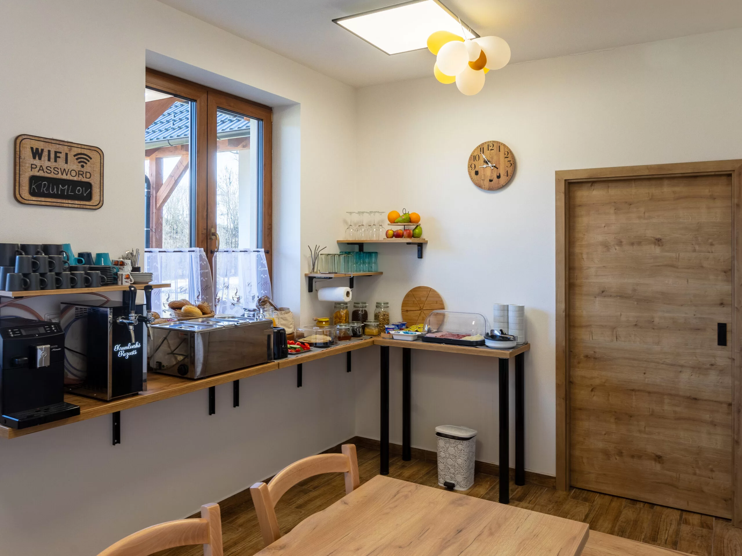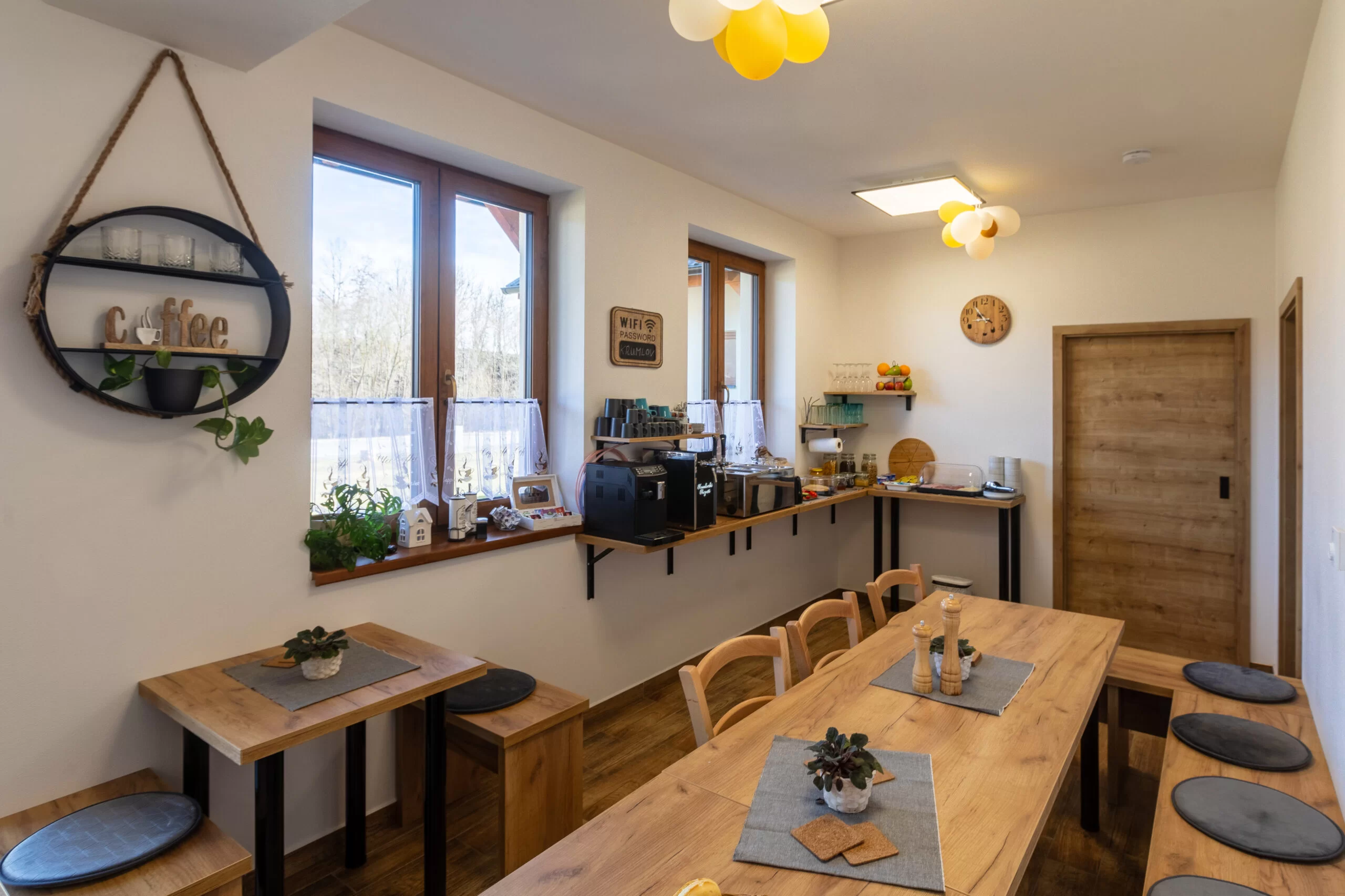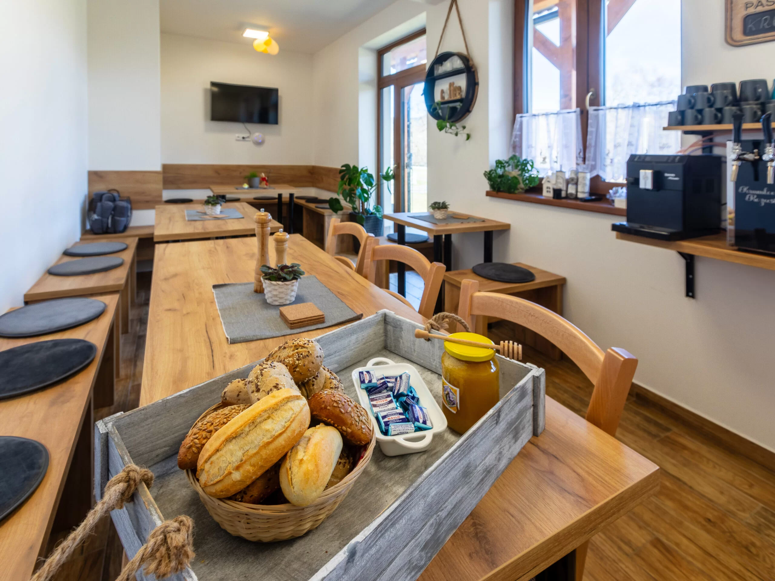 K dispozici je Smart TV 32", stůl a židle, šatní skříň a zatemňovací rolety (blackout). Kuchyň je dostupná ve společné místnosti penzionu a je plně vybavená pro vaření.