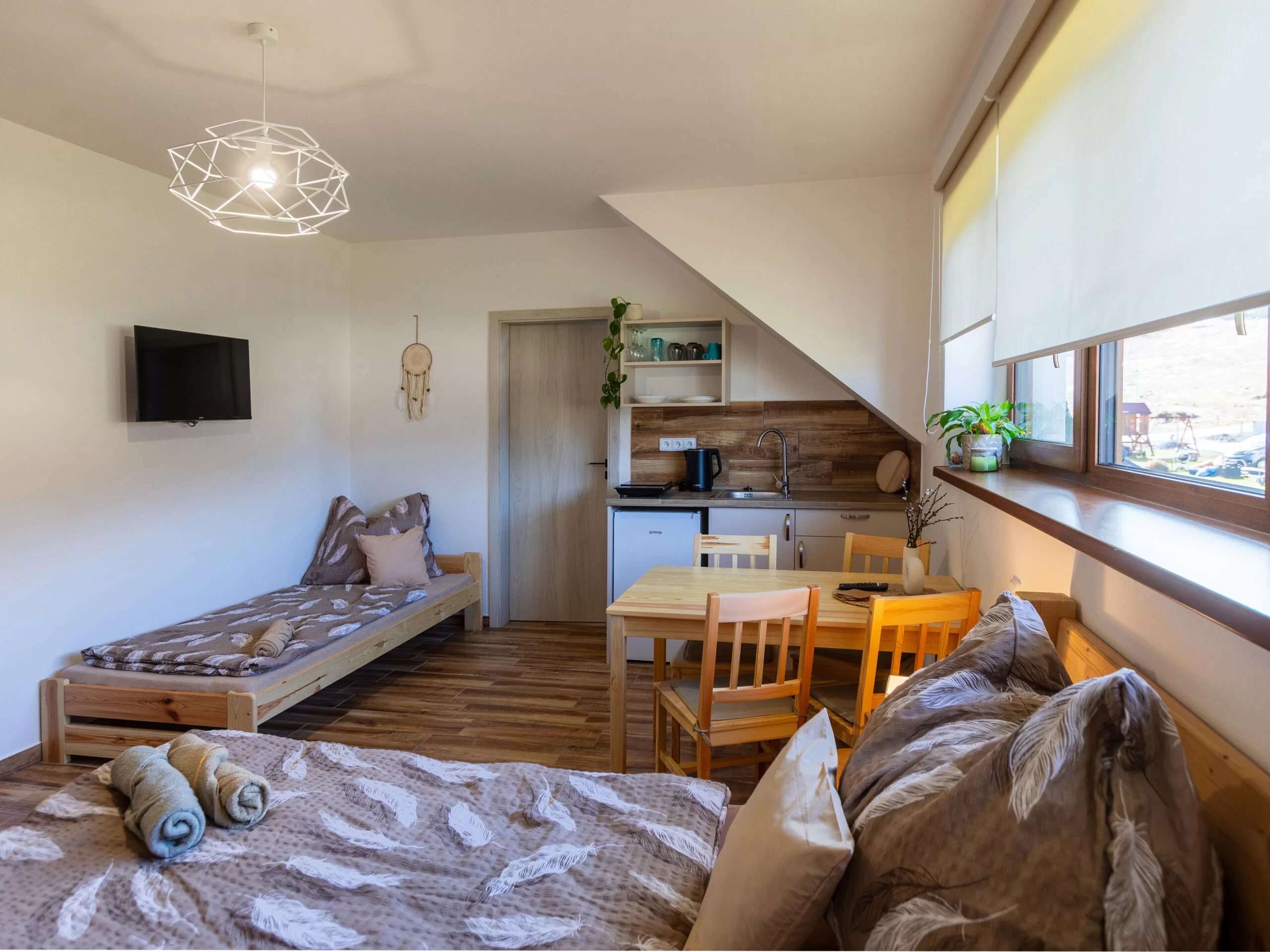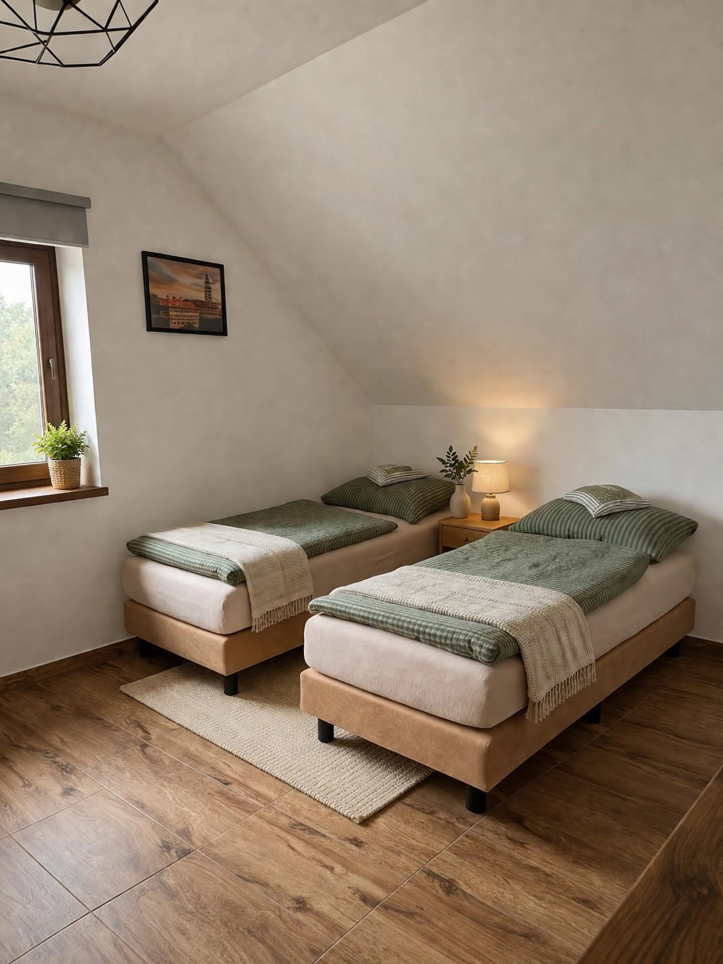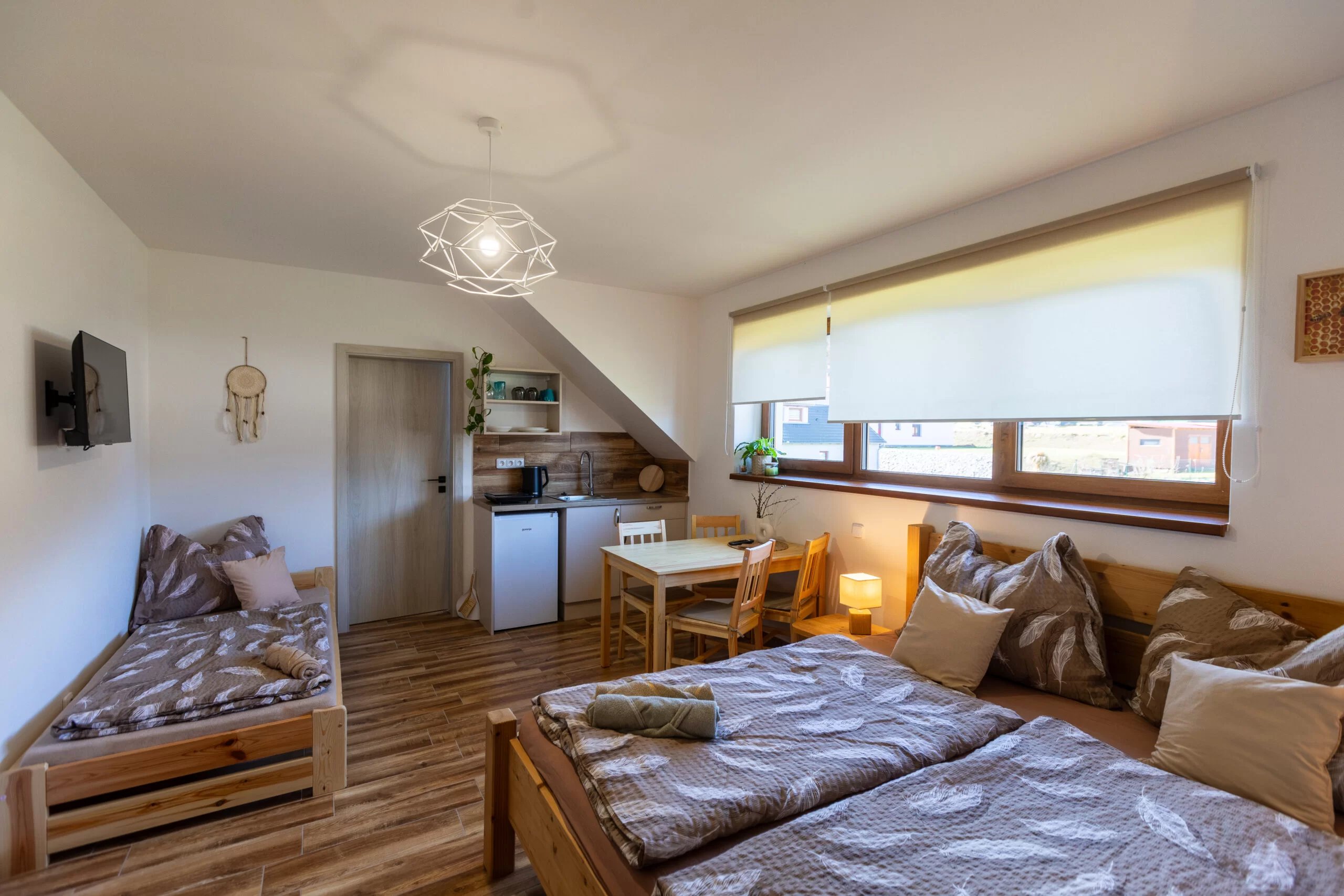 | Pokoj Skandi | 23 m² | 3–4 osoby | 1× 160×200 + 1× 90×200 + gauč 120×200 | Smart TV 32", blackout rolety, podlahové topení | sdílená kuchyň | ano (sprcha, WC) | 2 800 Kč / noc |