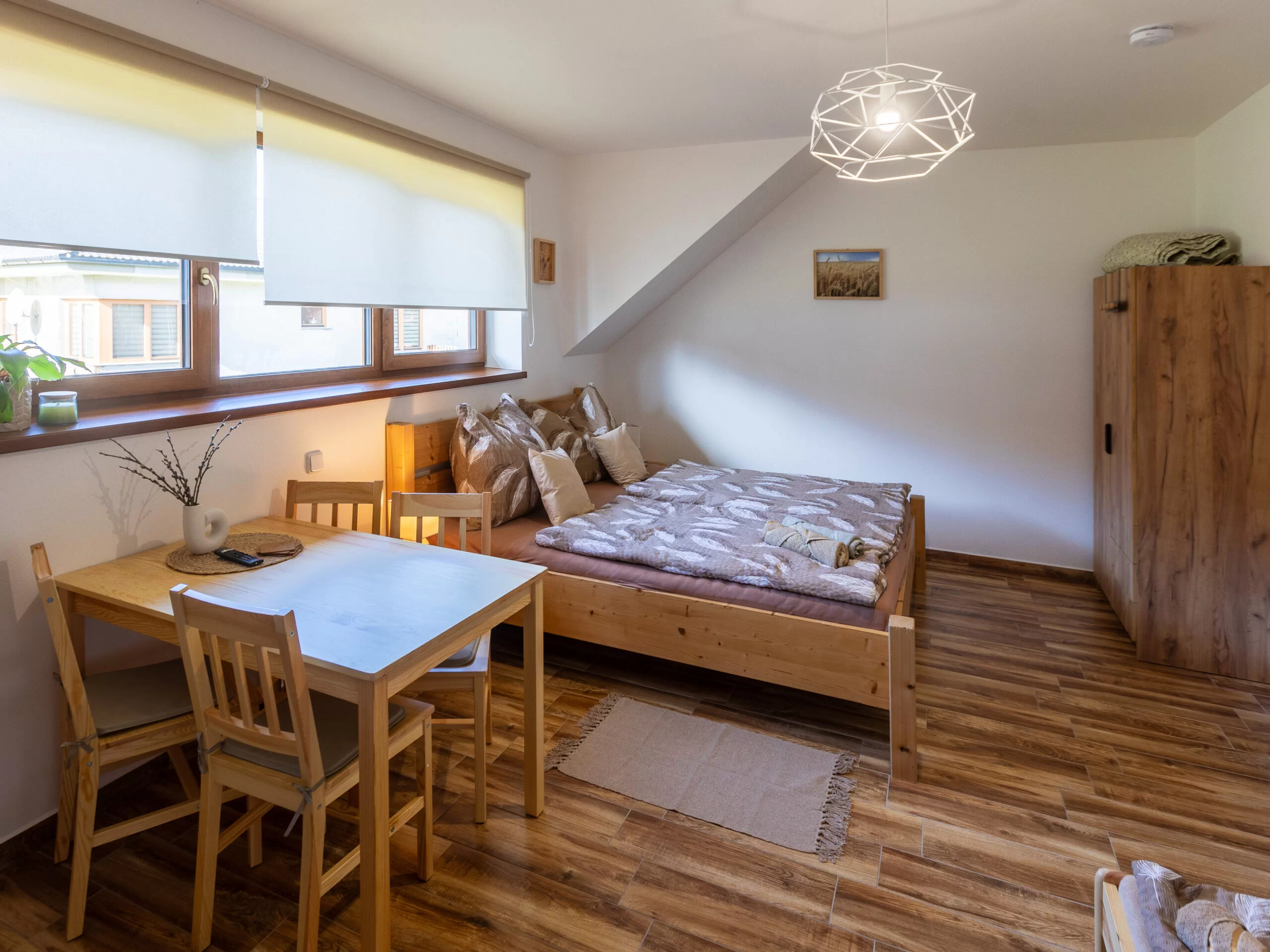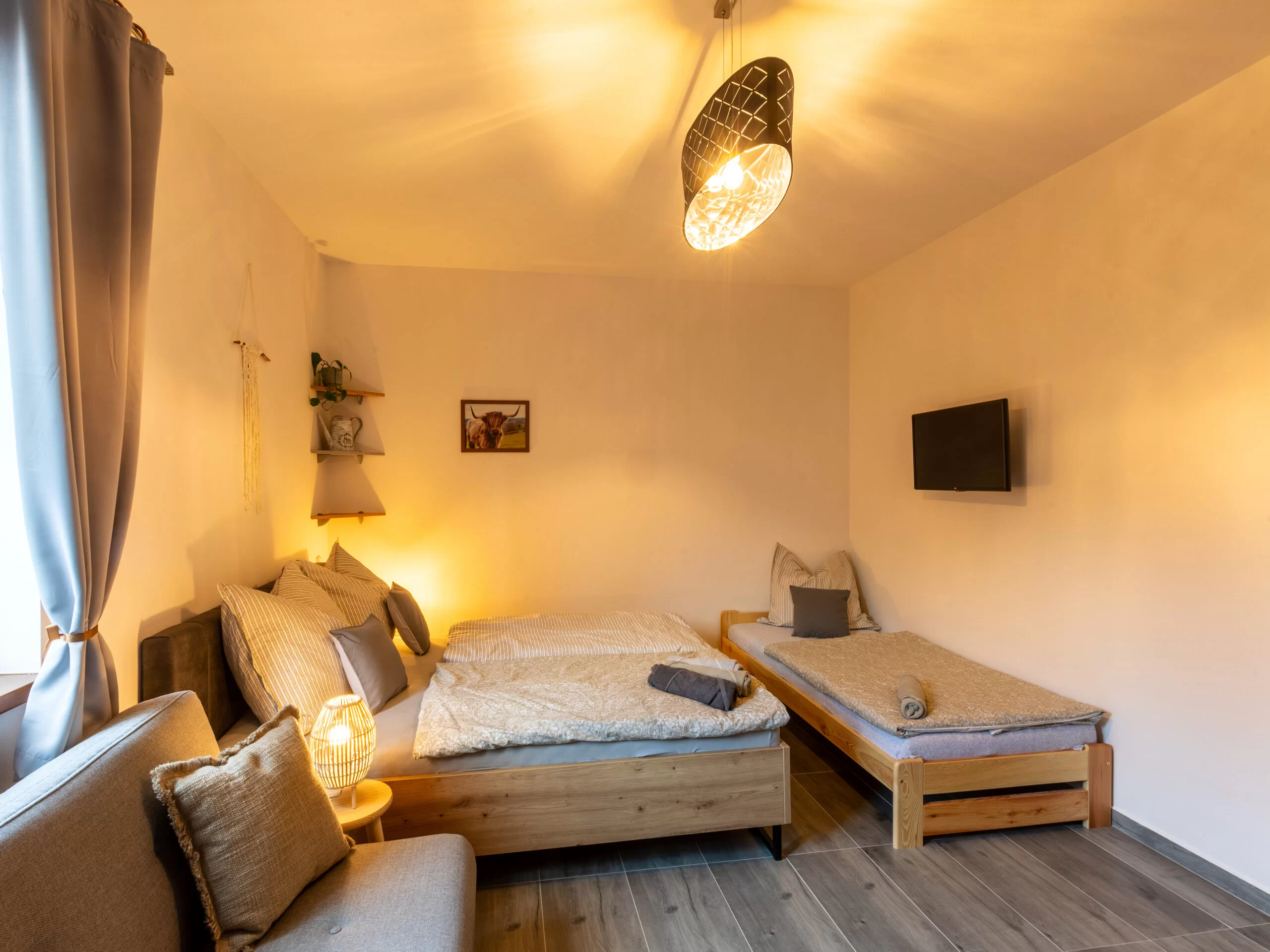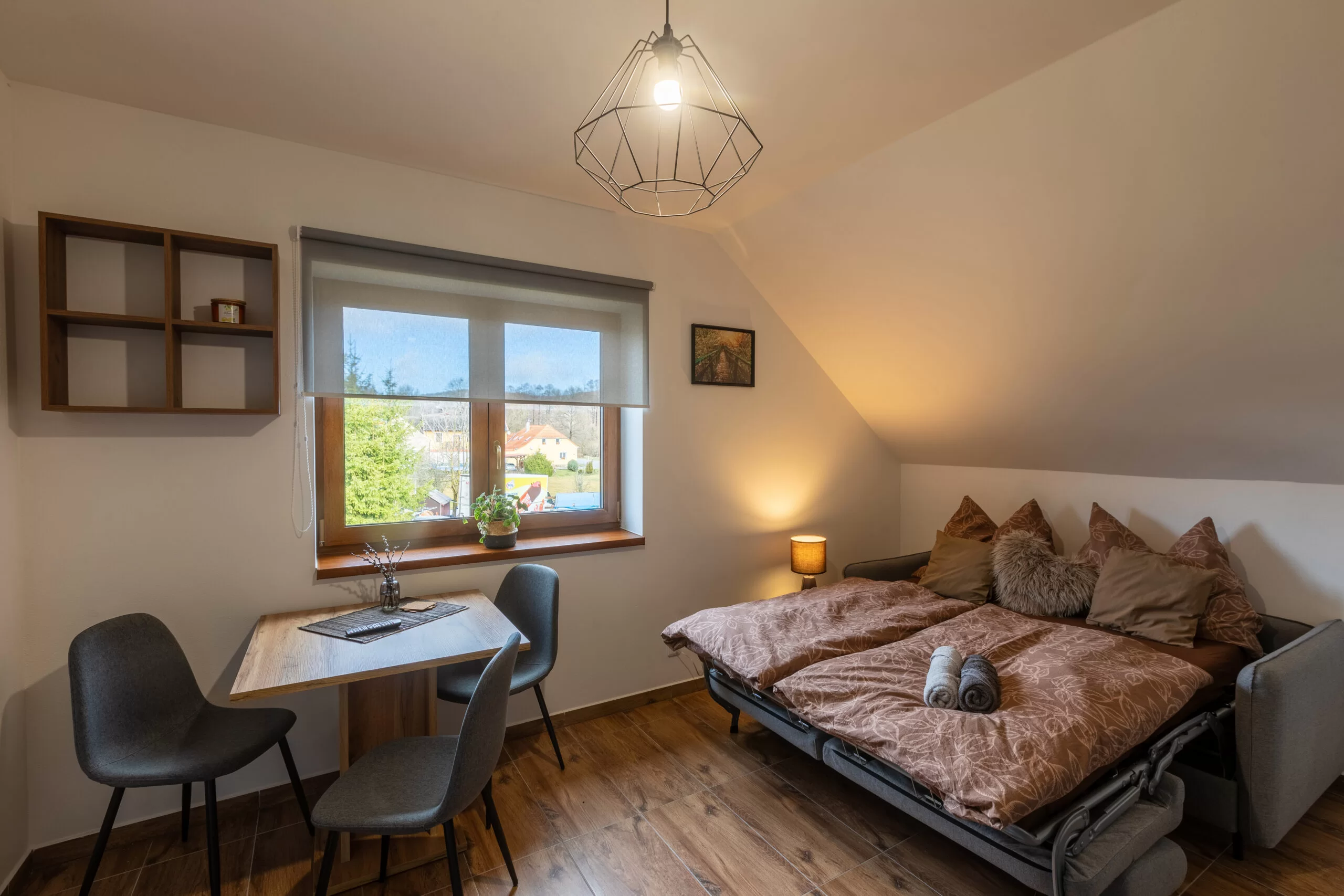 | Pokoj Skandi | 23 m² | 3–4 osoby | 1× 160×200 + 1× 90×200 + gauč 120×200 | Smart TV 32", blackout rolety, podlahové topení | sdílená kuchyň | ano (sprcha, WC) | 2 800 Kč / noc |