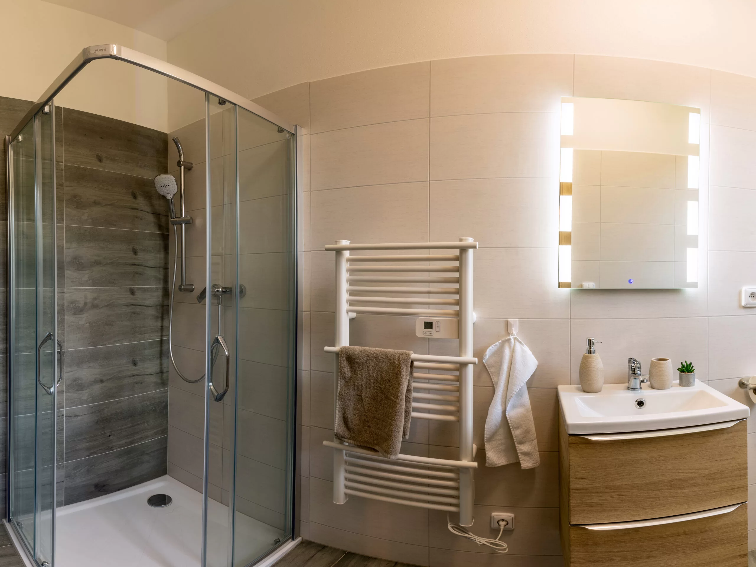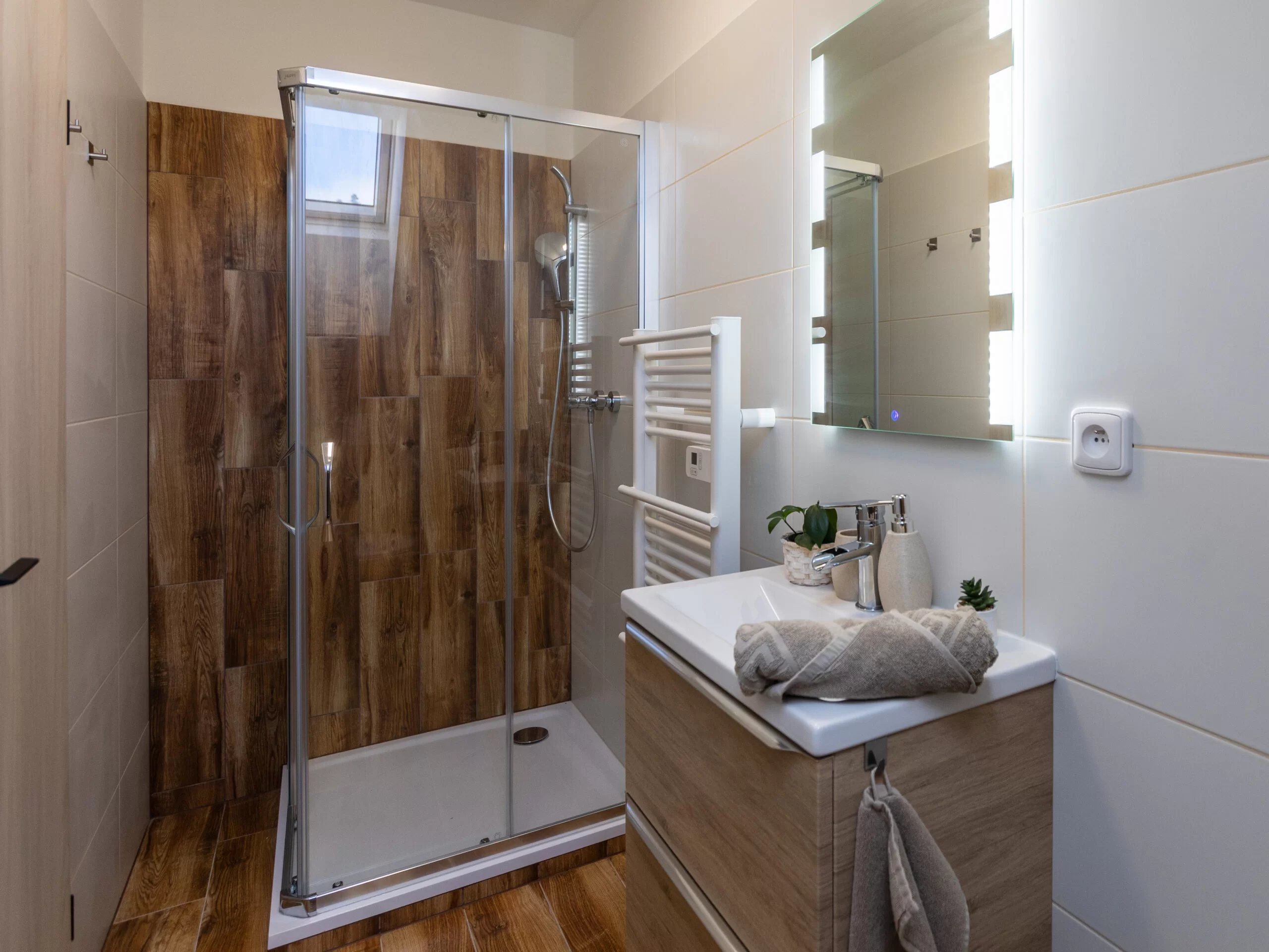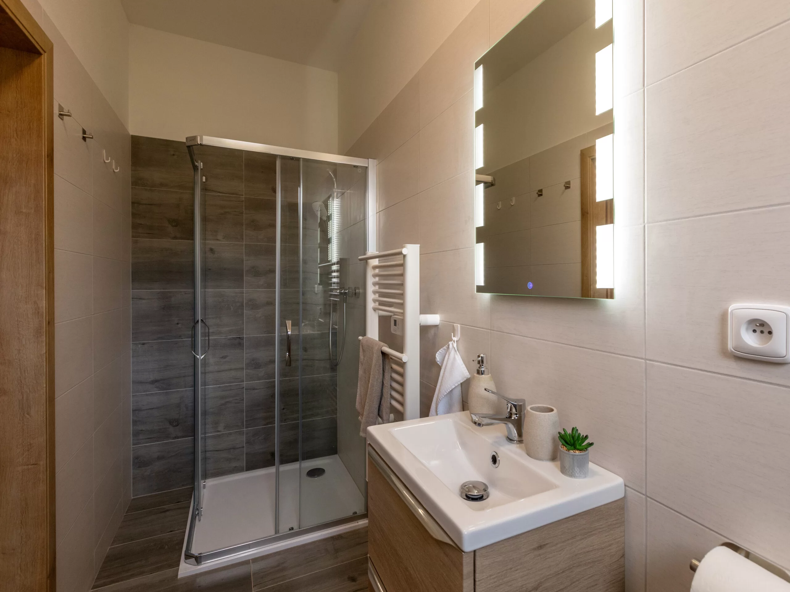 Součástí je vlastní koupelna, která obsahuje sprchový kout, toaletu, umyvadlo, zrcadlo a topný žebřík.