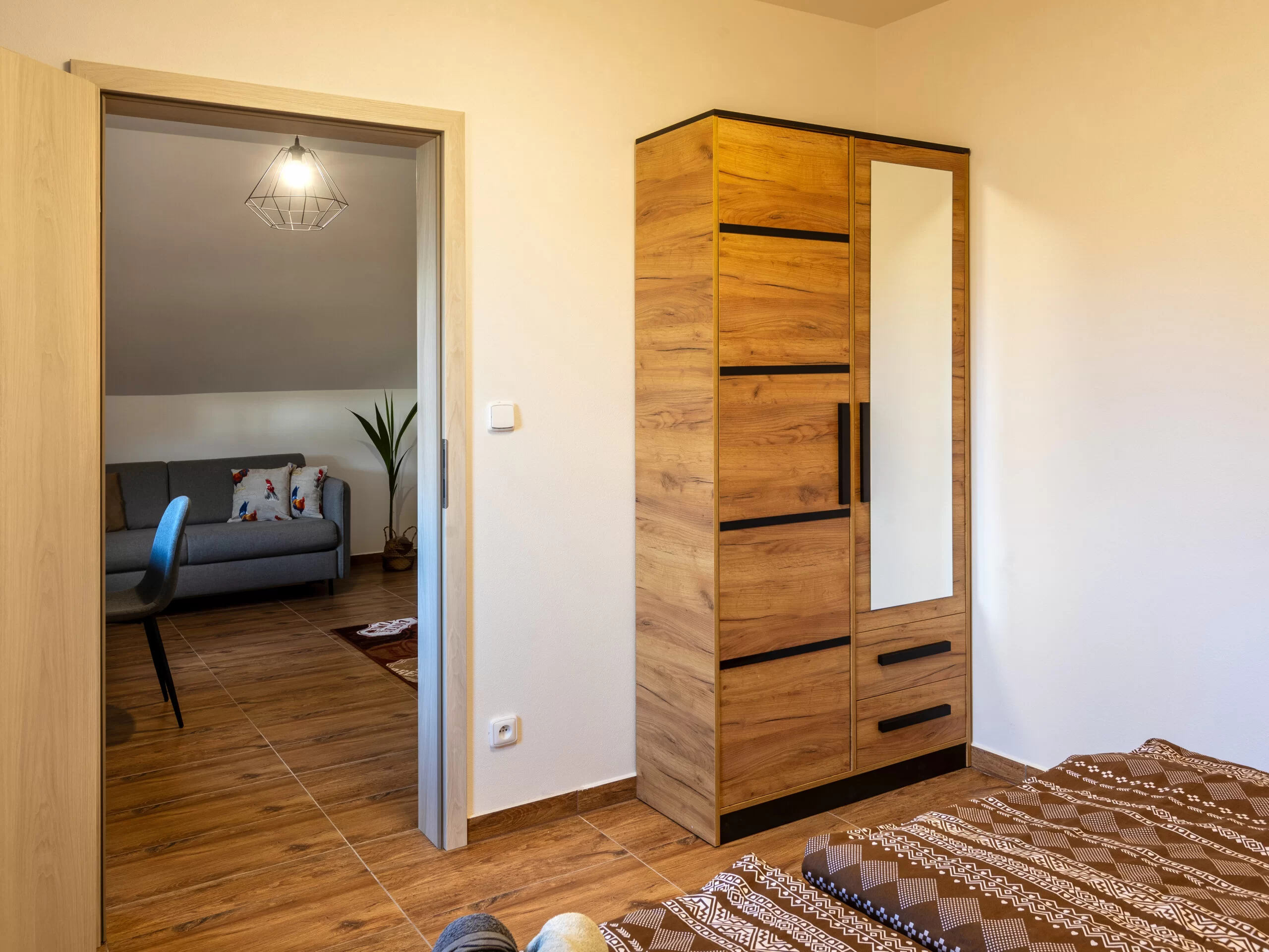 Je vybavený dvoulůžkovou postelí (160×200 cm) se zdravotní matrací, jednolůžkovou postelí (90×200 cm) a rozkládací pohovkou typu click-clack (120×200 cm).