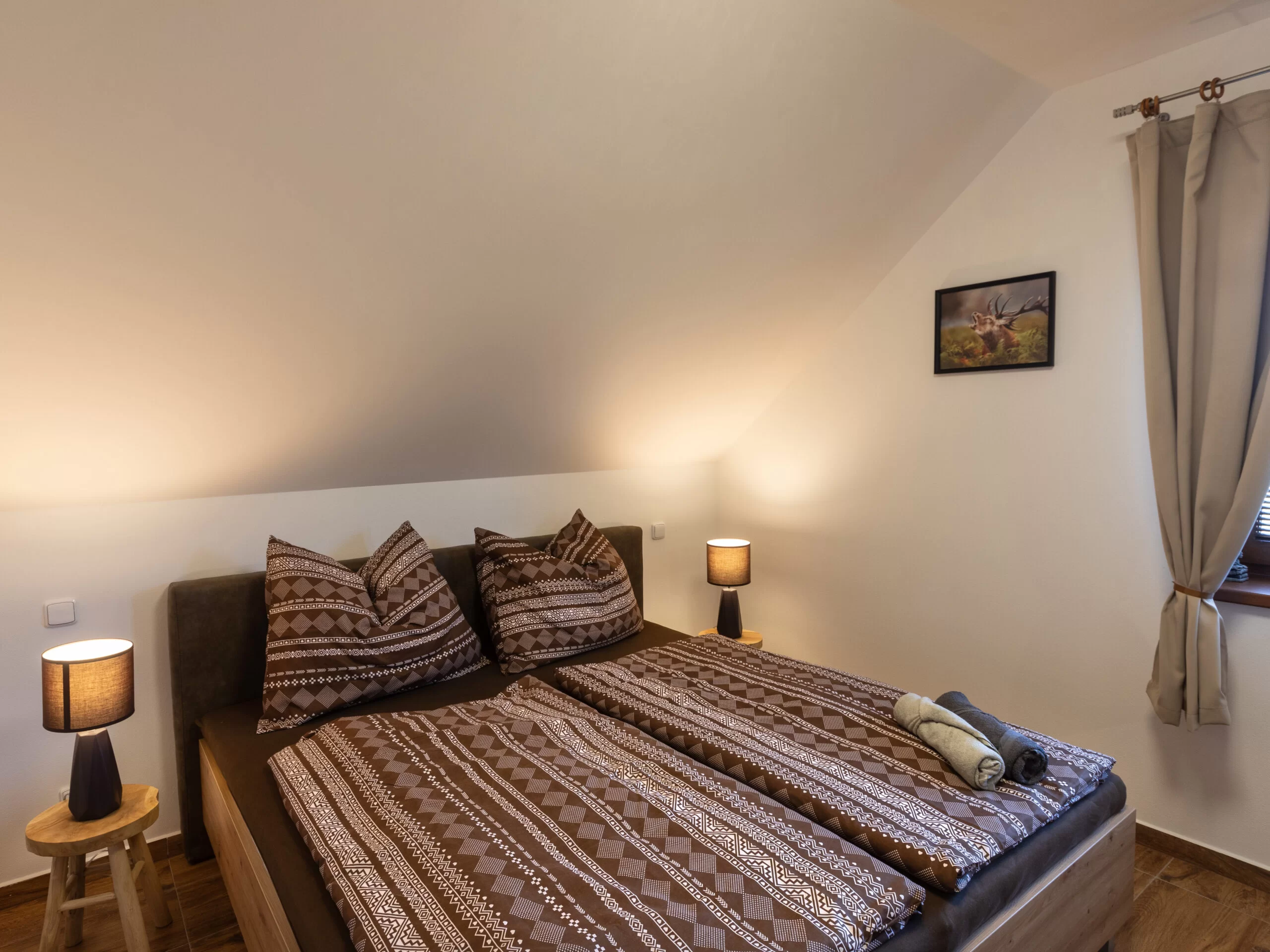 Je vybaveno dvoulůžkovou postelí king-boxspring (180×200 cm).