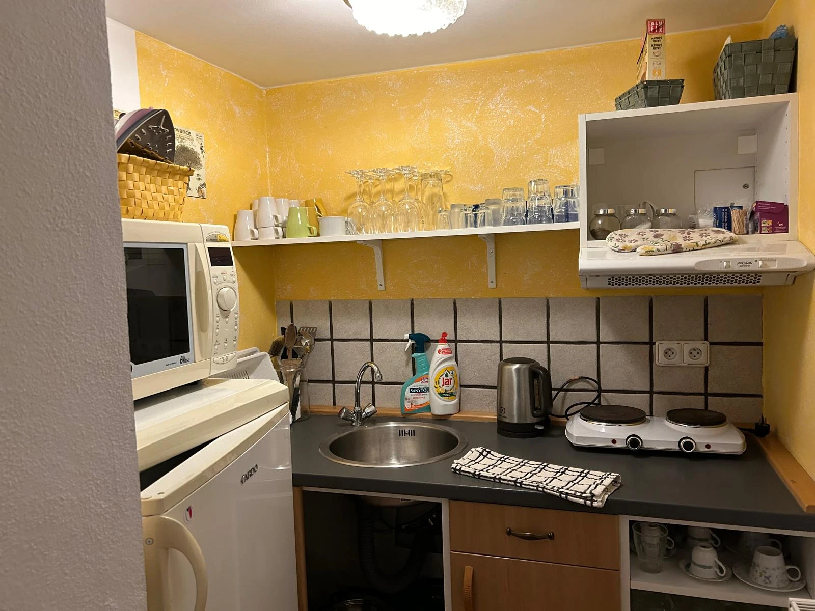 - Plně vybavená kuchyňka s nádobím, lednicí, elektrickým vařičem, mikrovlnnou troubou a rychlovarnou konvicí