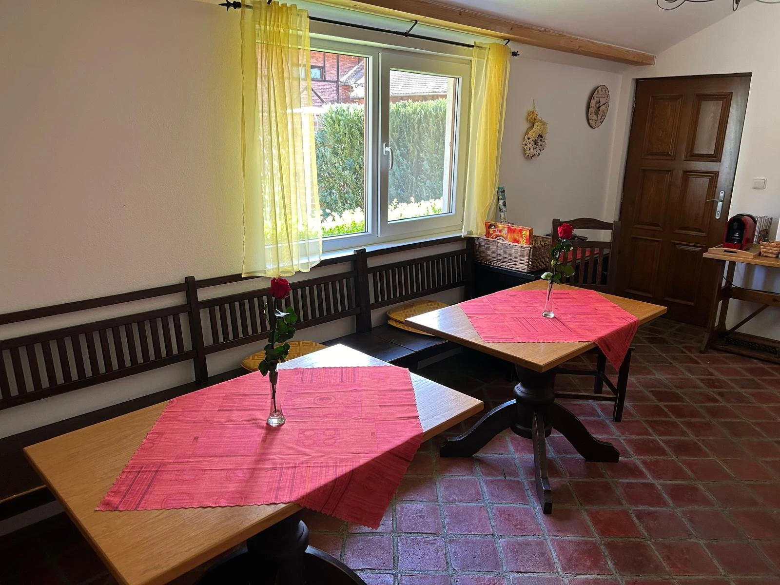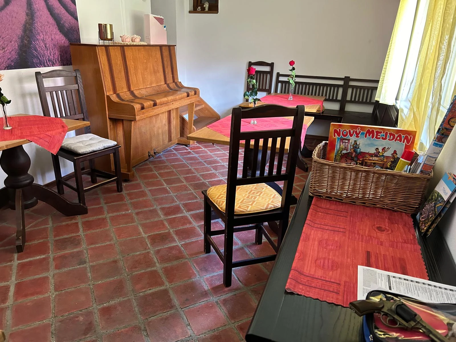 Hosté mohou využívat společnou kuchyňku, která je plně vybavená nádobím, lednicí, elektrickým vařičem, mikrovlnnou troubou a rychlovarnou konvicí. Společenská místnost nabízí společenské hry, piano, pingpongový stůl, notebook s internetem, automatická krbová kamna na pelety a kapslovač na kávu. K dispozici je také venkovní posezení pod pergolou s možností grilování, relaxační zóna s lehátky a trampolína s houpačkami pro děti.