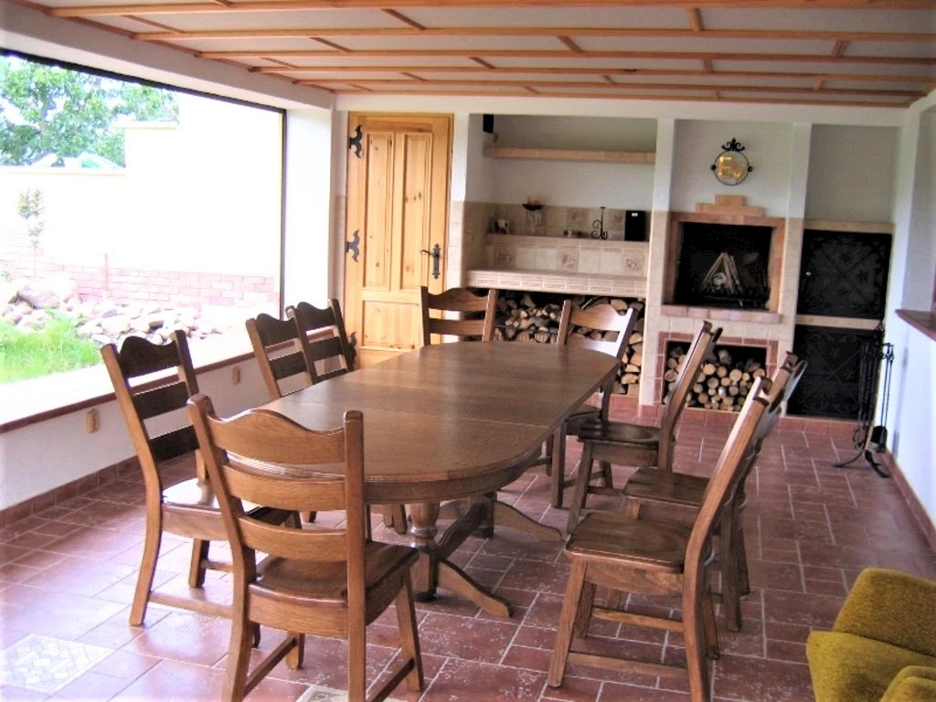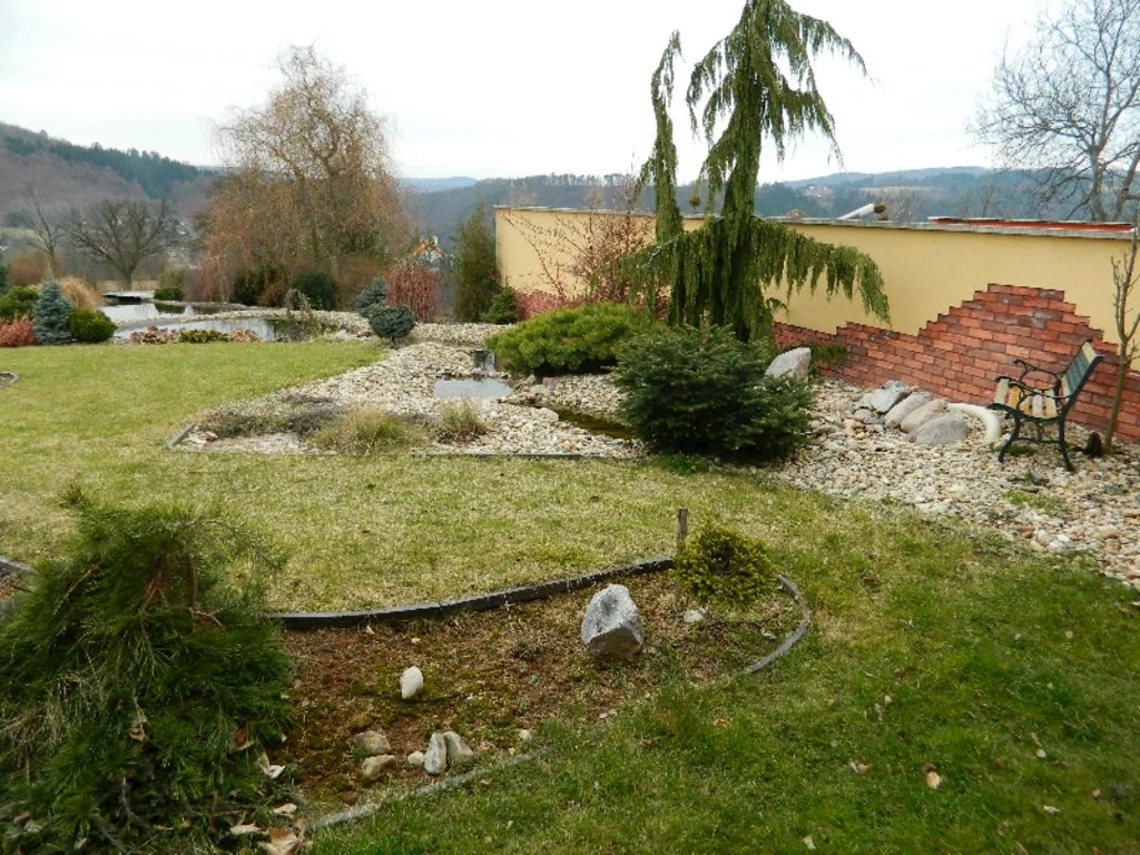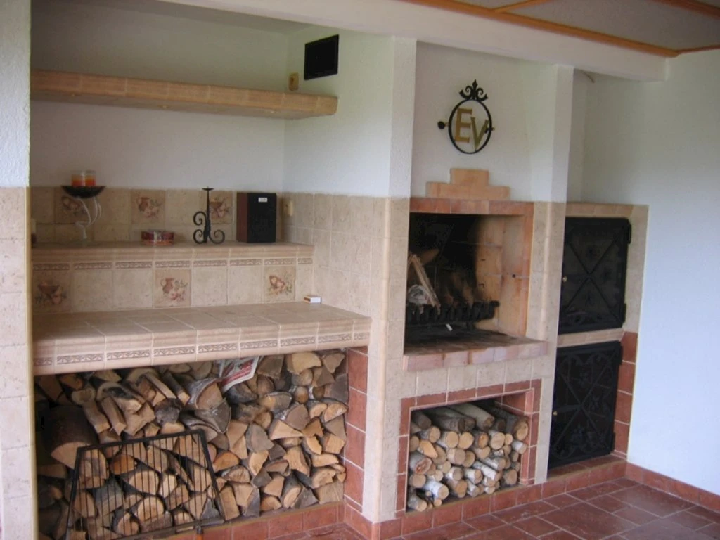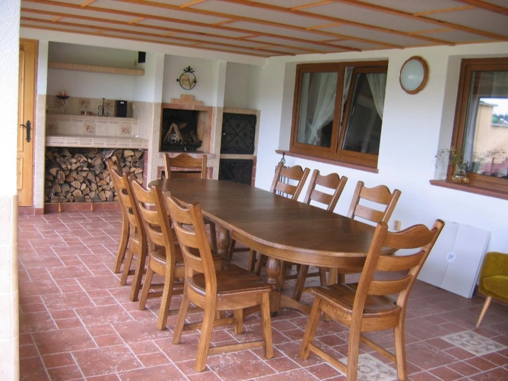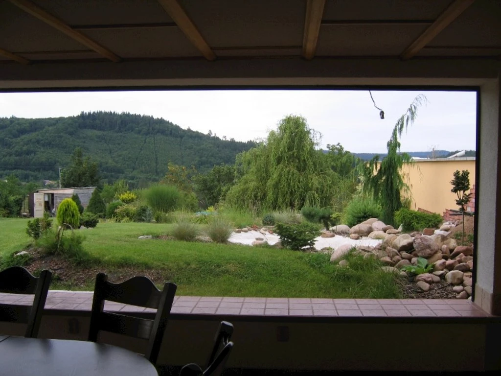 - Venkovní posezení, gril a ohniště na zahradě.