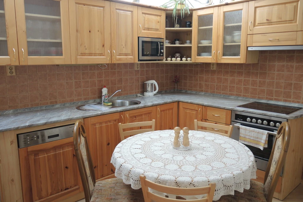 - Kuchyňský kout se sporákem, troubou, lednicí, mikrovlnnou troubou, rychlovarnou konvicí a jídelním stolem.