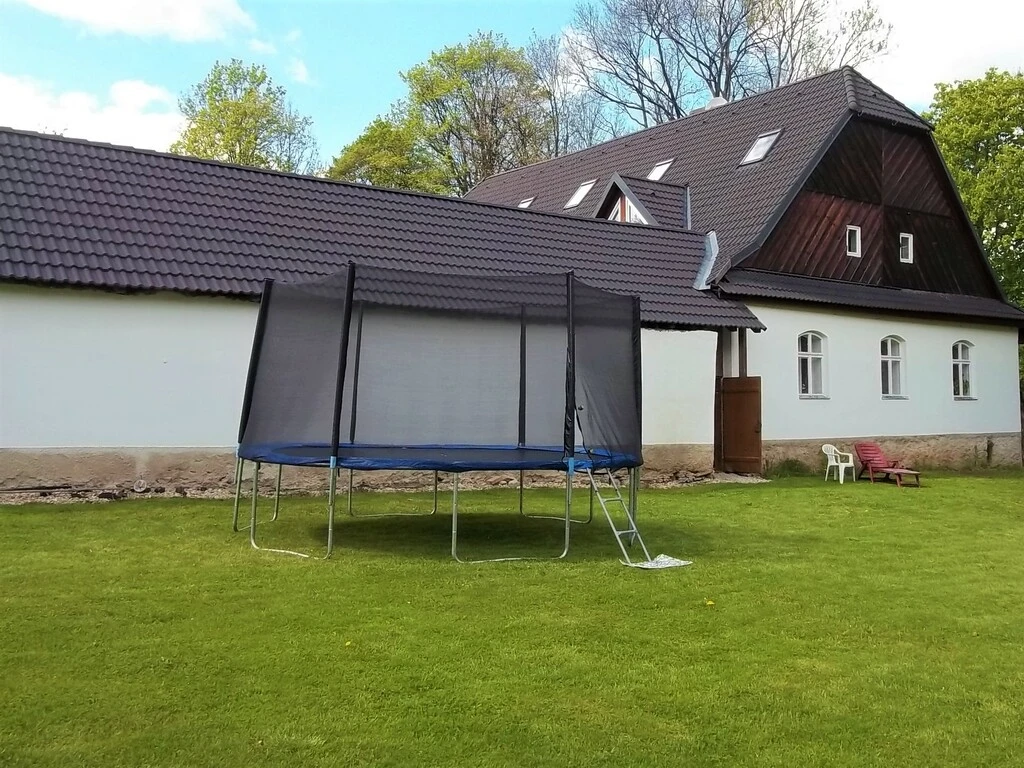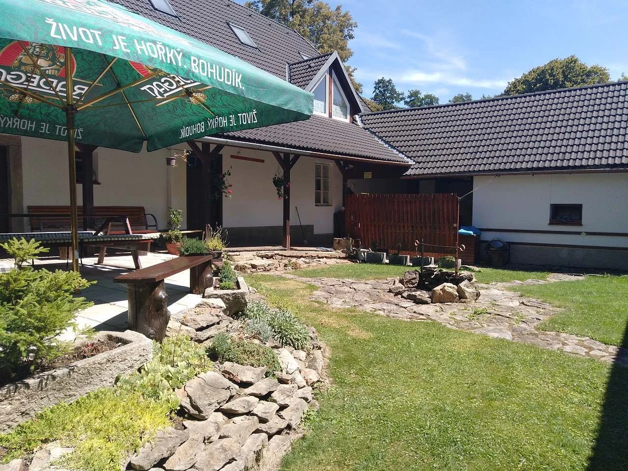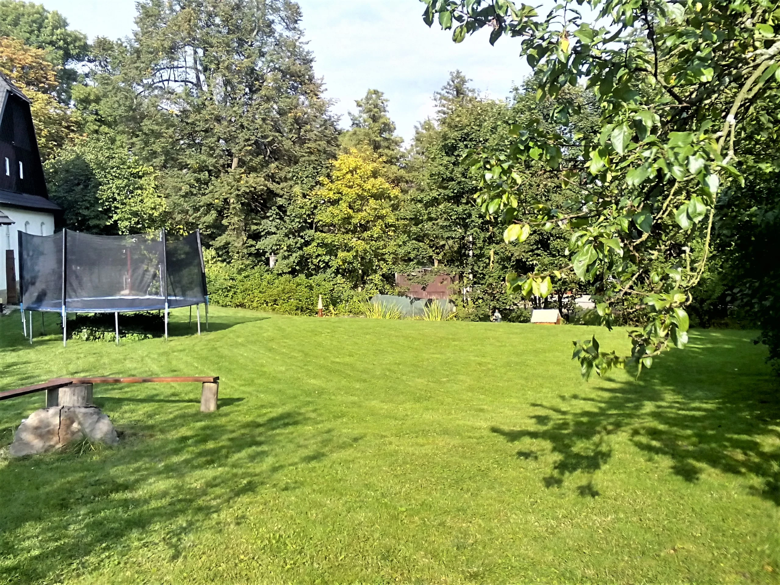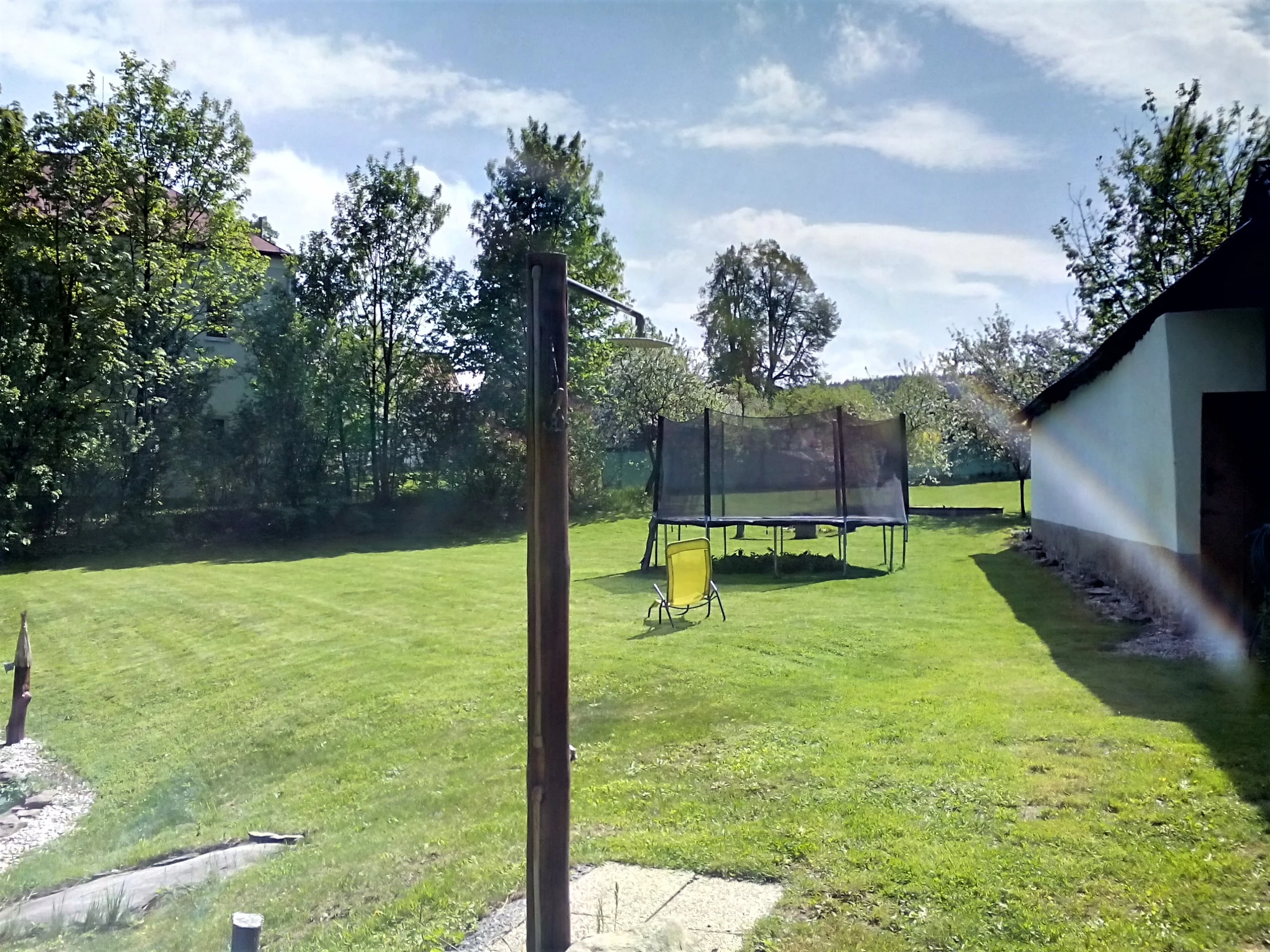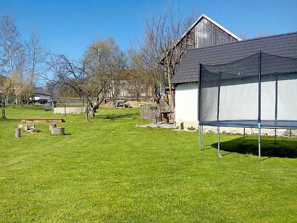 - Oplocená zahrada s bazény, trampolínou, pískovištěm, lehátky, ohništěm a posezením