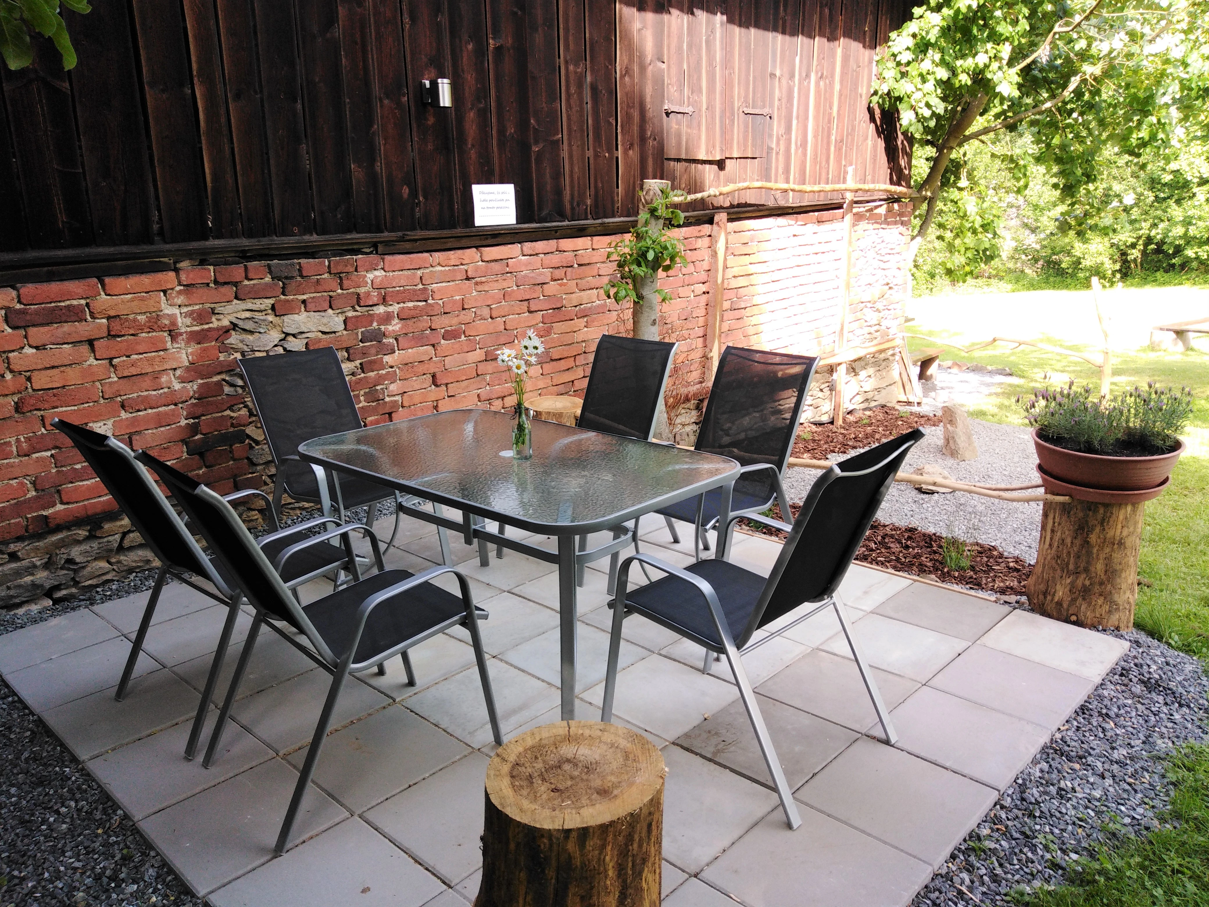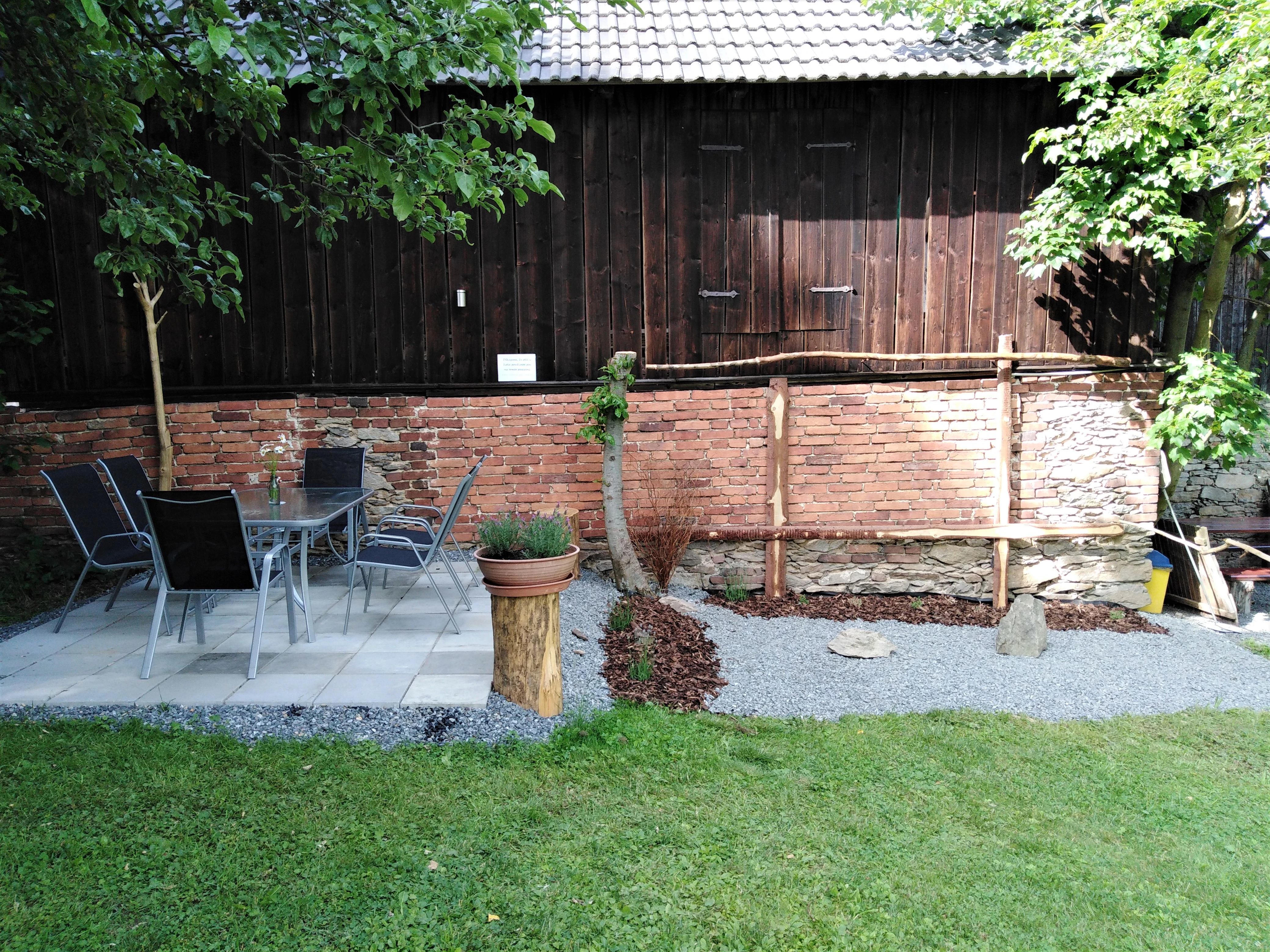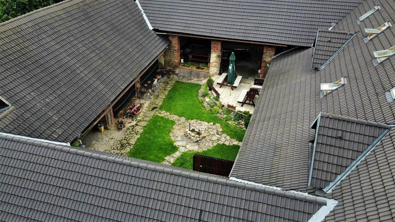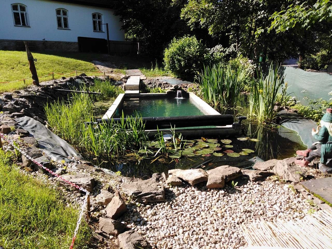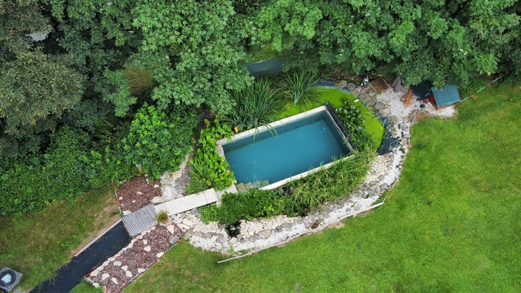 - Oplocená zahrada s bazény, trampolínou, pískovištěm, lehátky, ohništěm a posezením