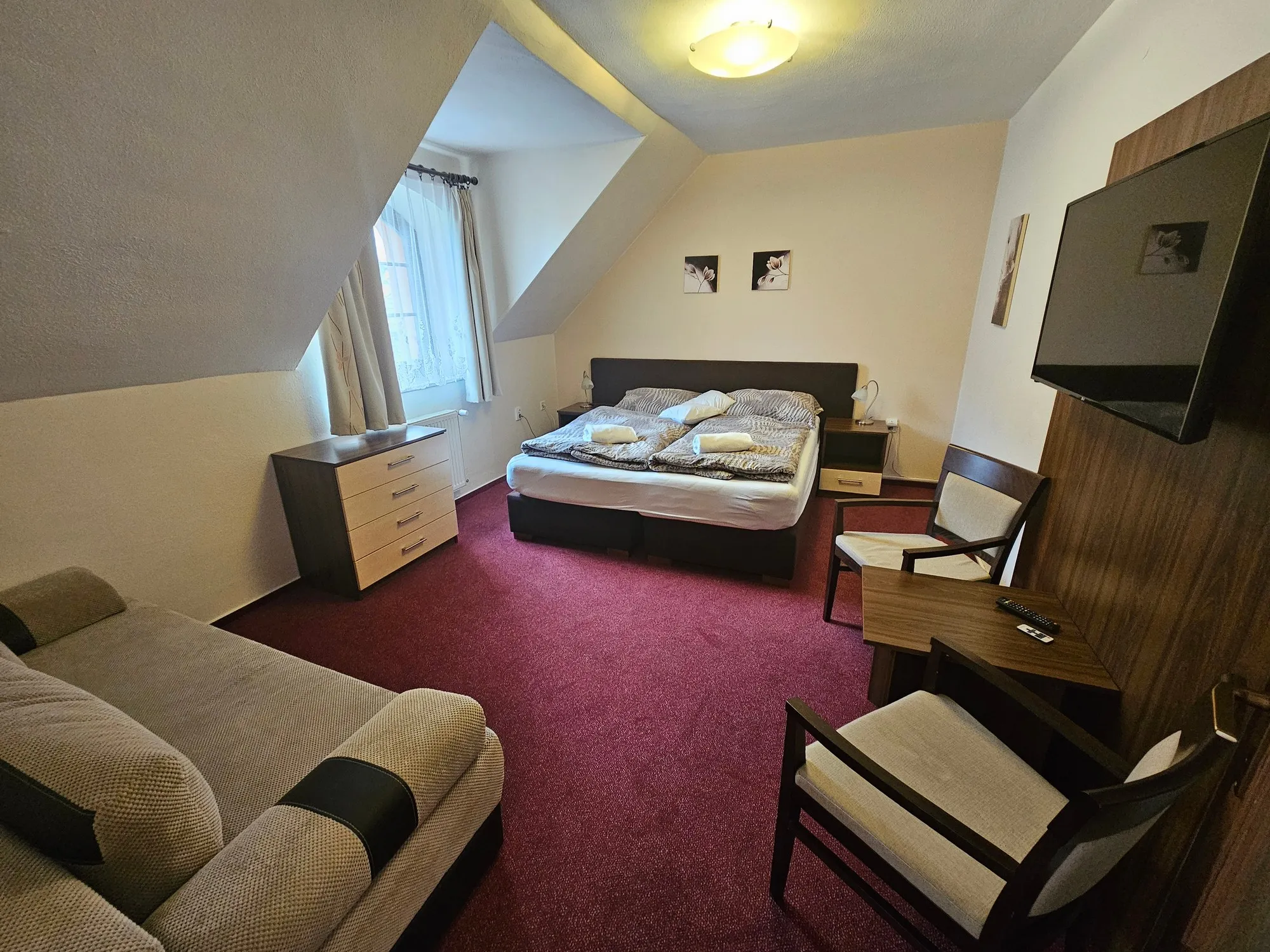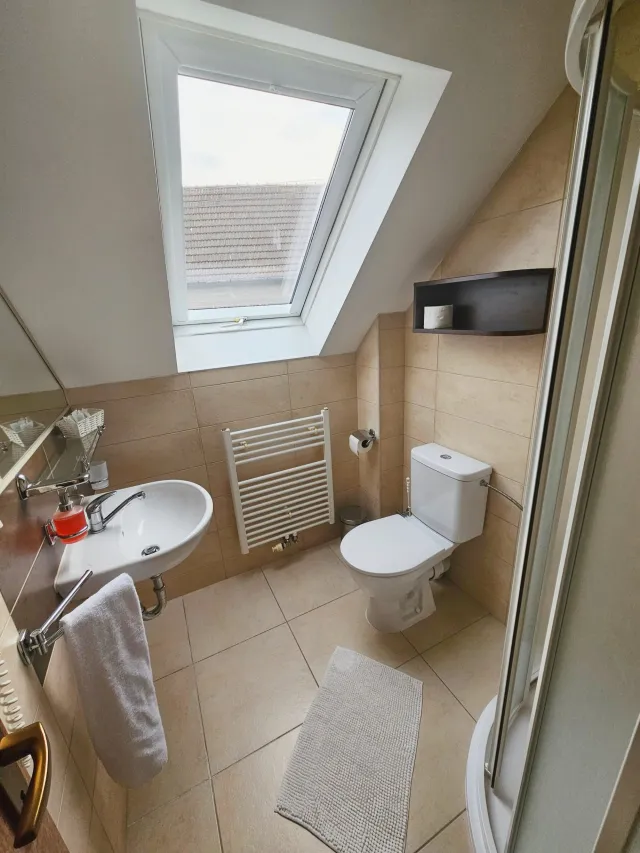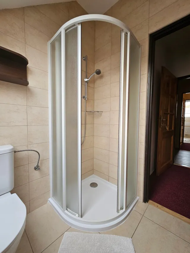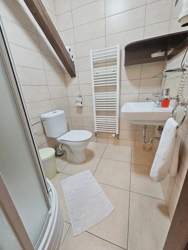 Pokoj nabízí komfortní manželskou postel (nebo dvě oddělená lůžka), vlastní koupelnu se sprchovým koutem a toaletou.
